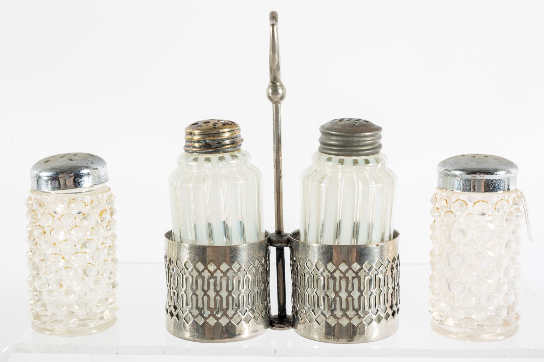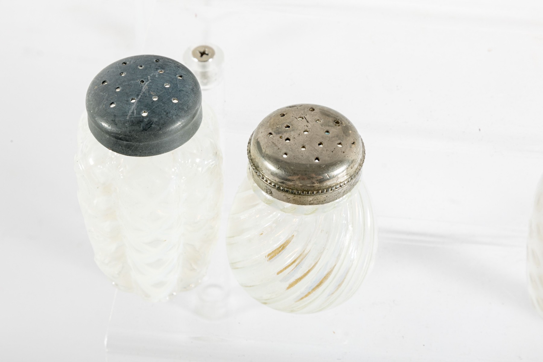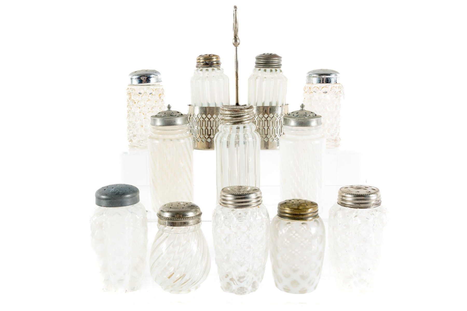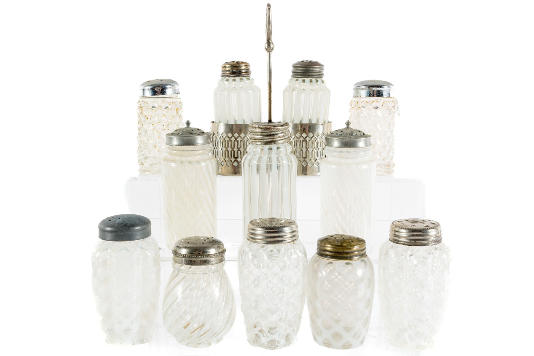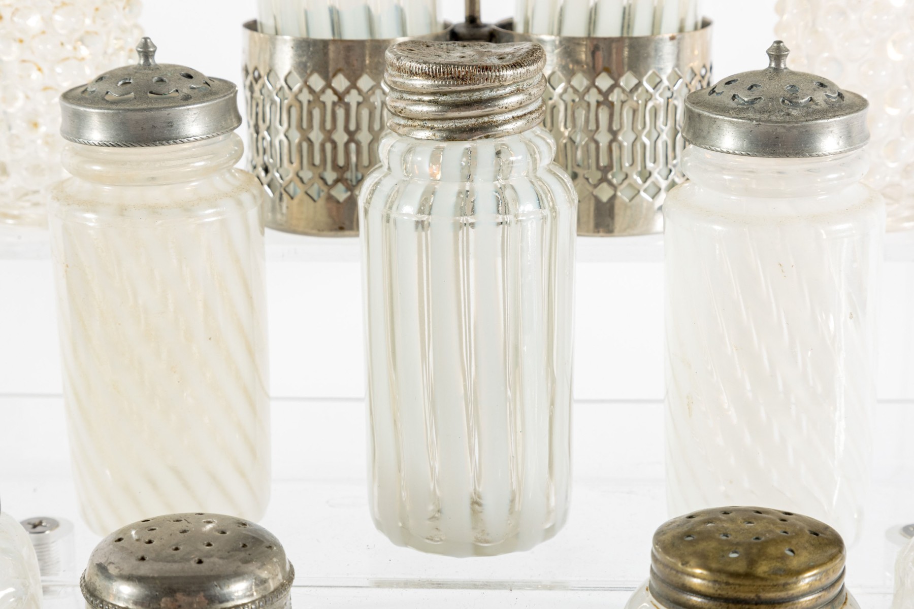 A fabulous collection of vintage clear and white depression glass salt and pepper shakers. Includes one trio, three pairs, and three singles. One pair comes with a silver plated cruet stand.