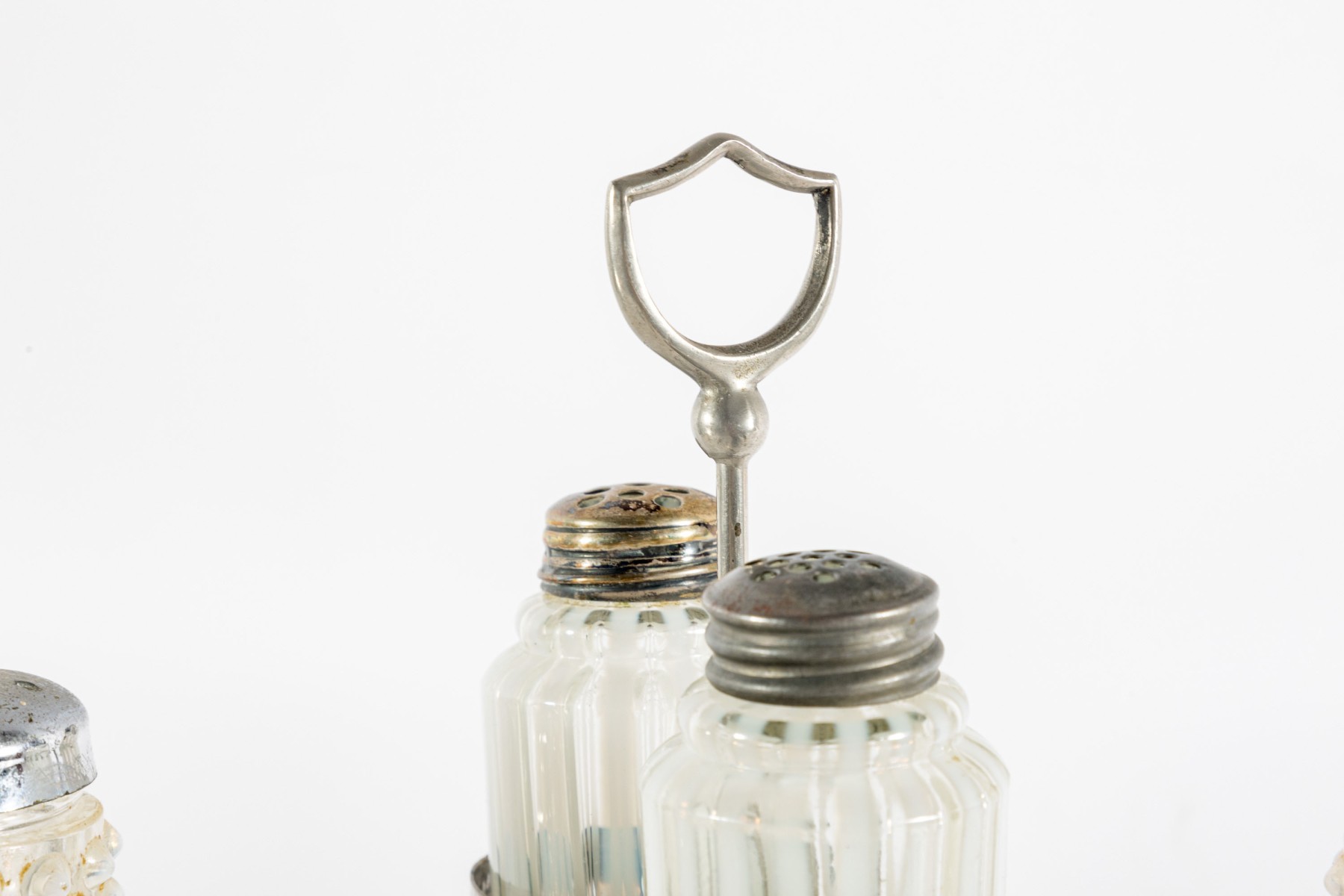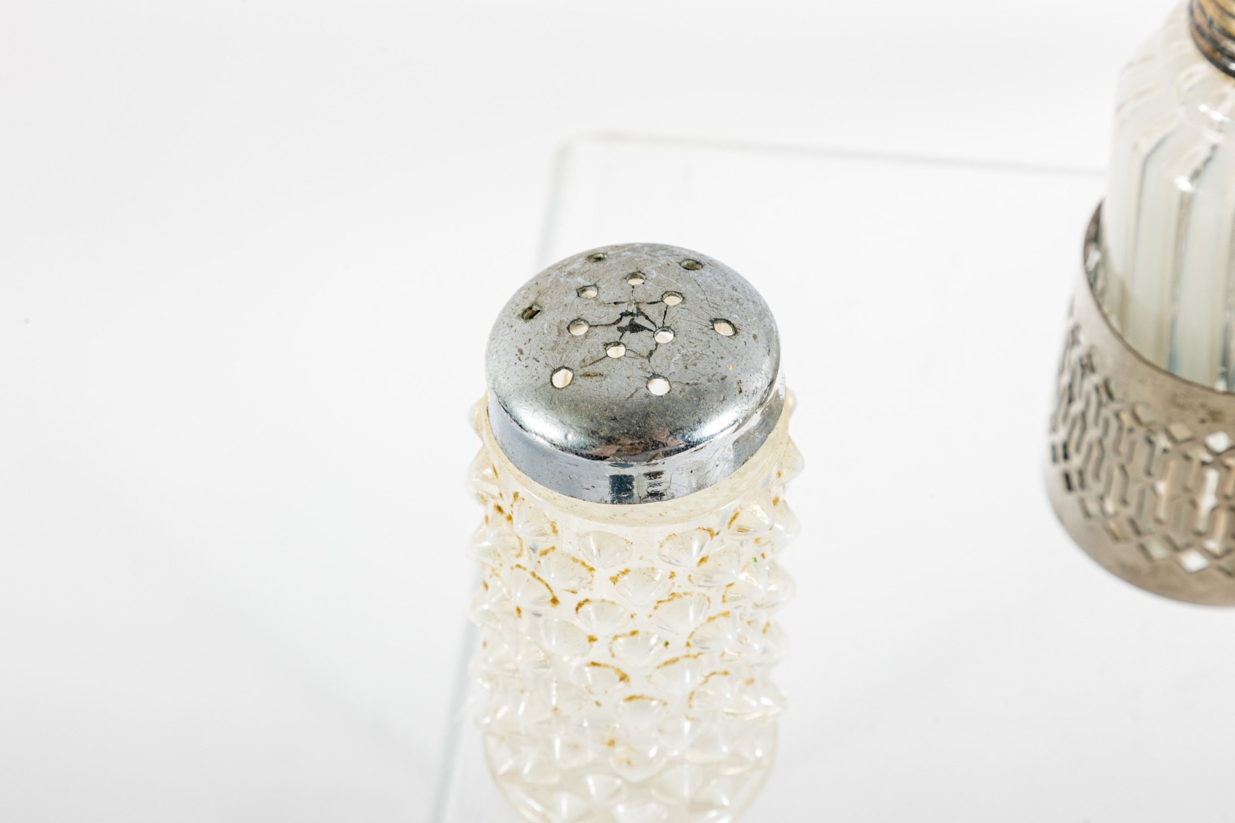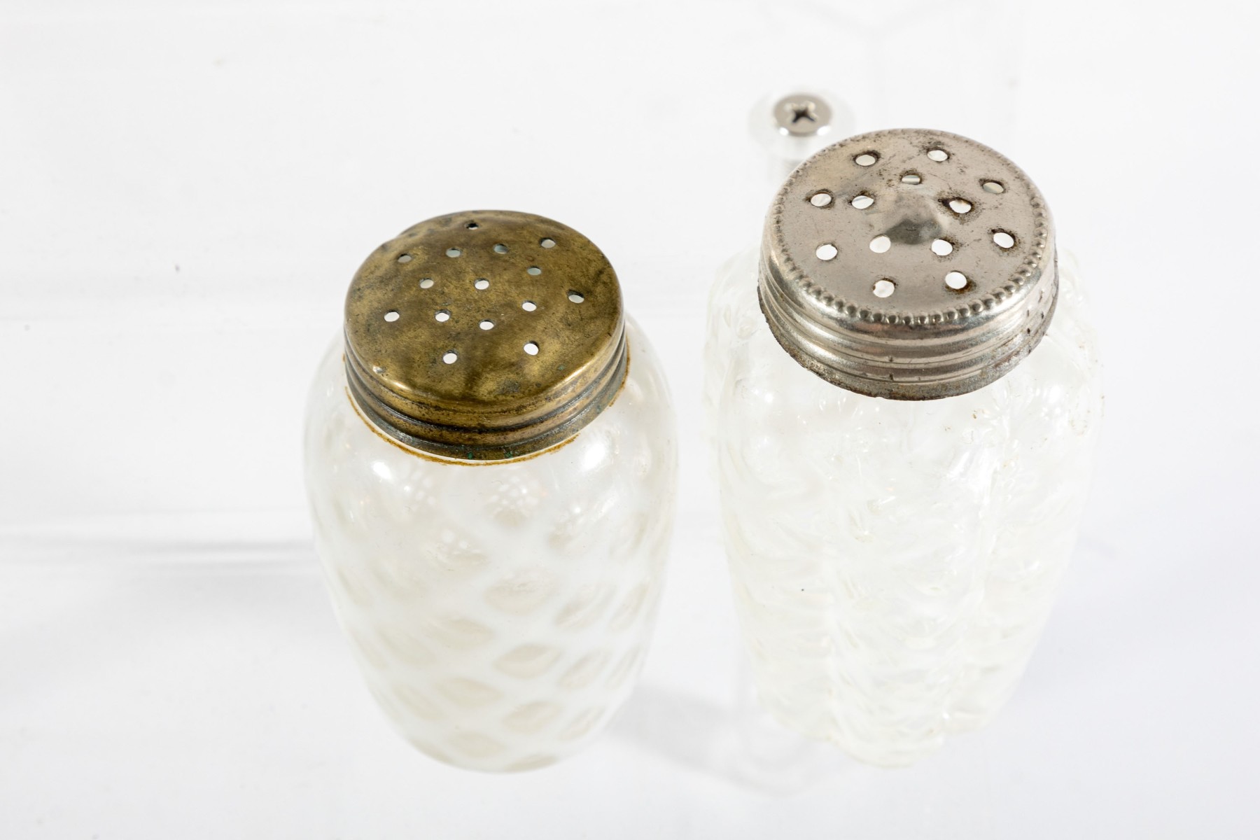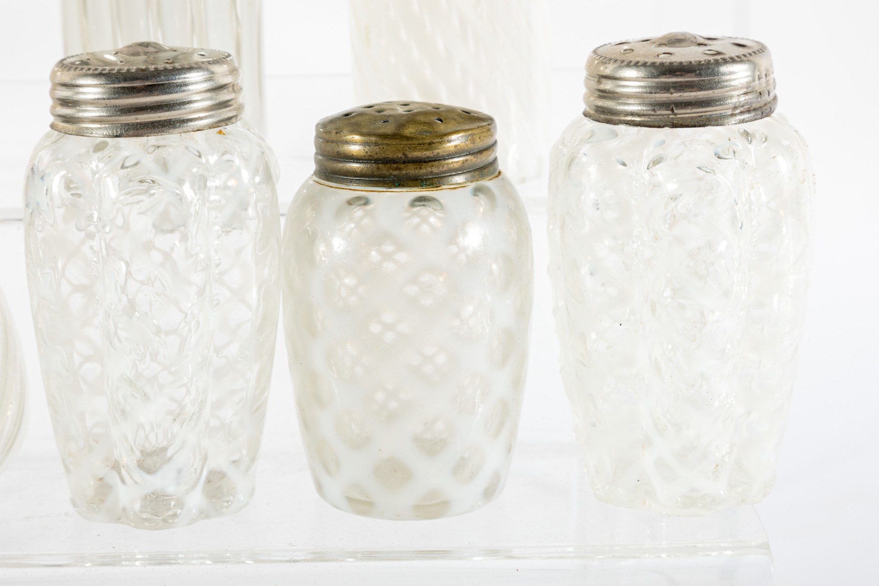 A fabulous collection of vintage clear and white depression glass salt and pepper shakers. Includes one trio, three pairs, and three singles. One pair comes with a silver plated cruet stand.