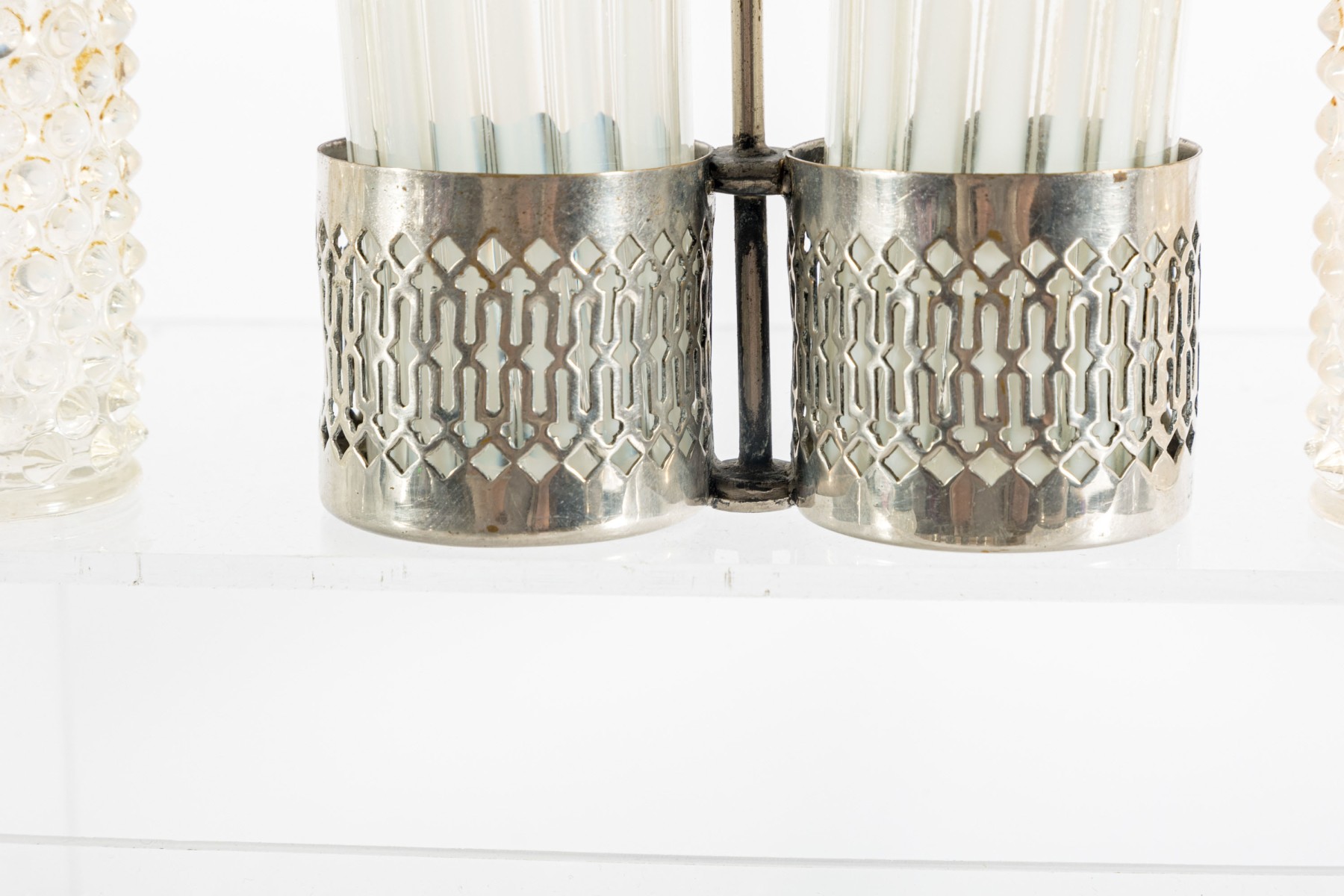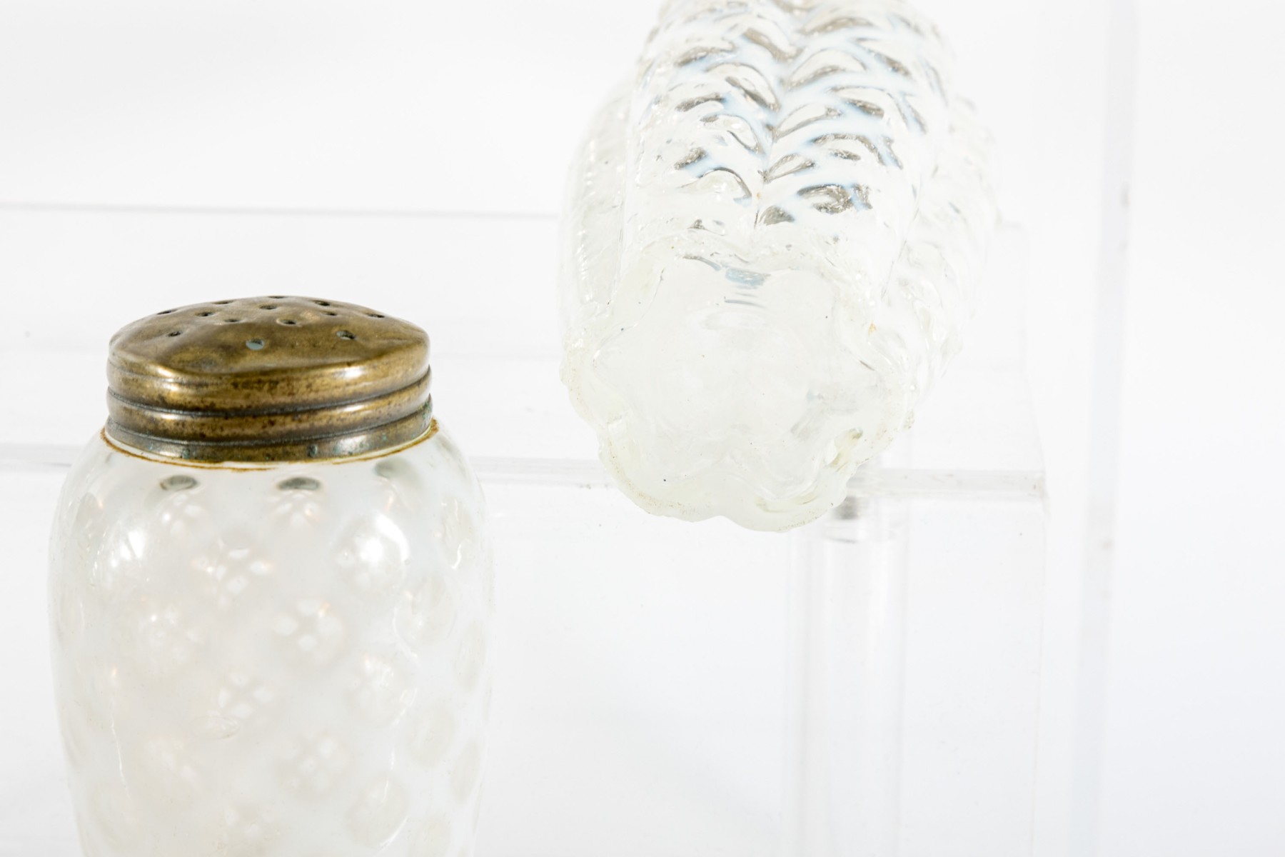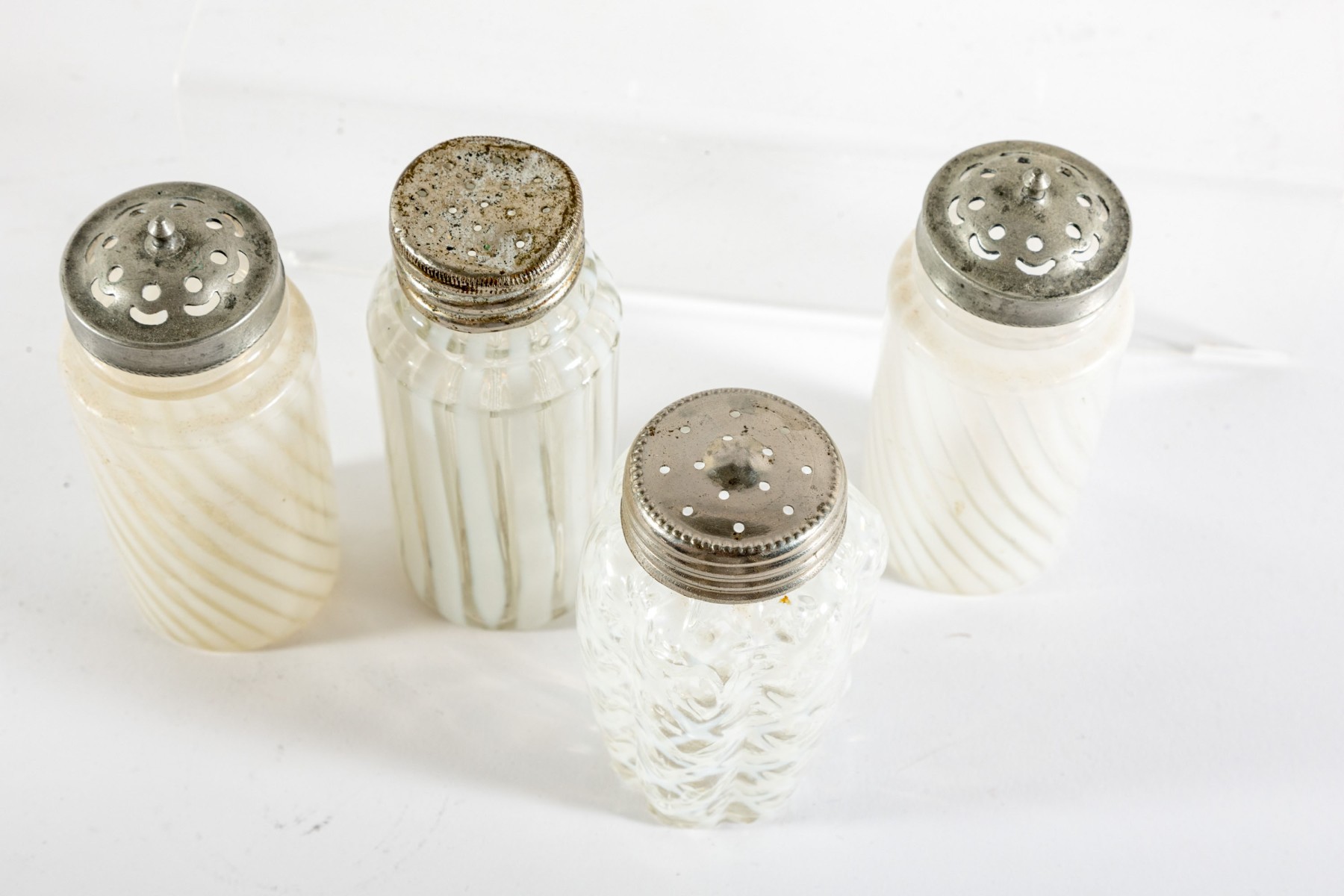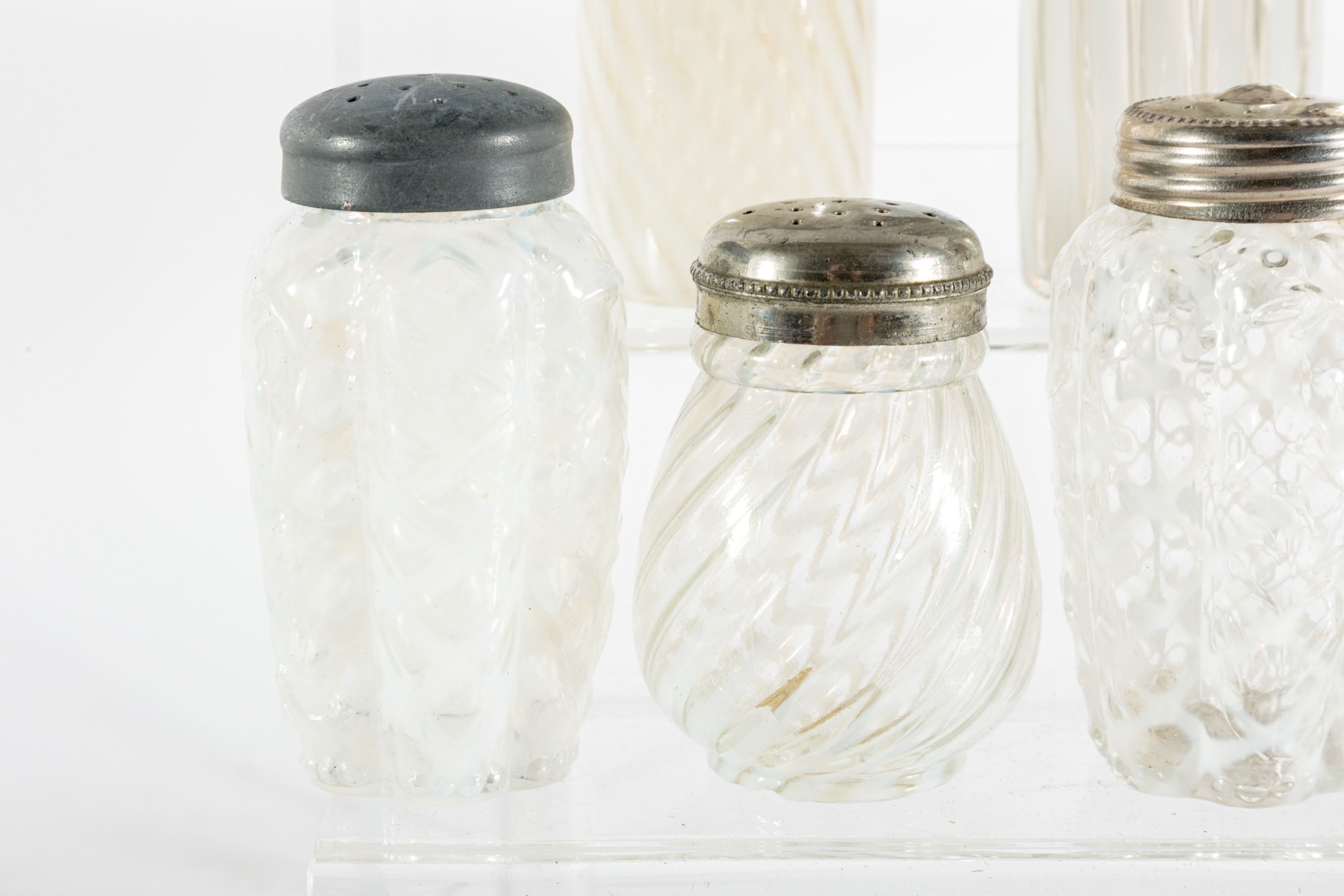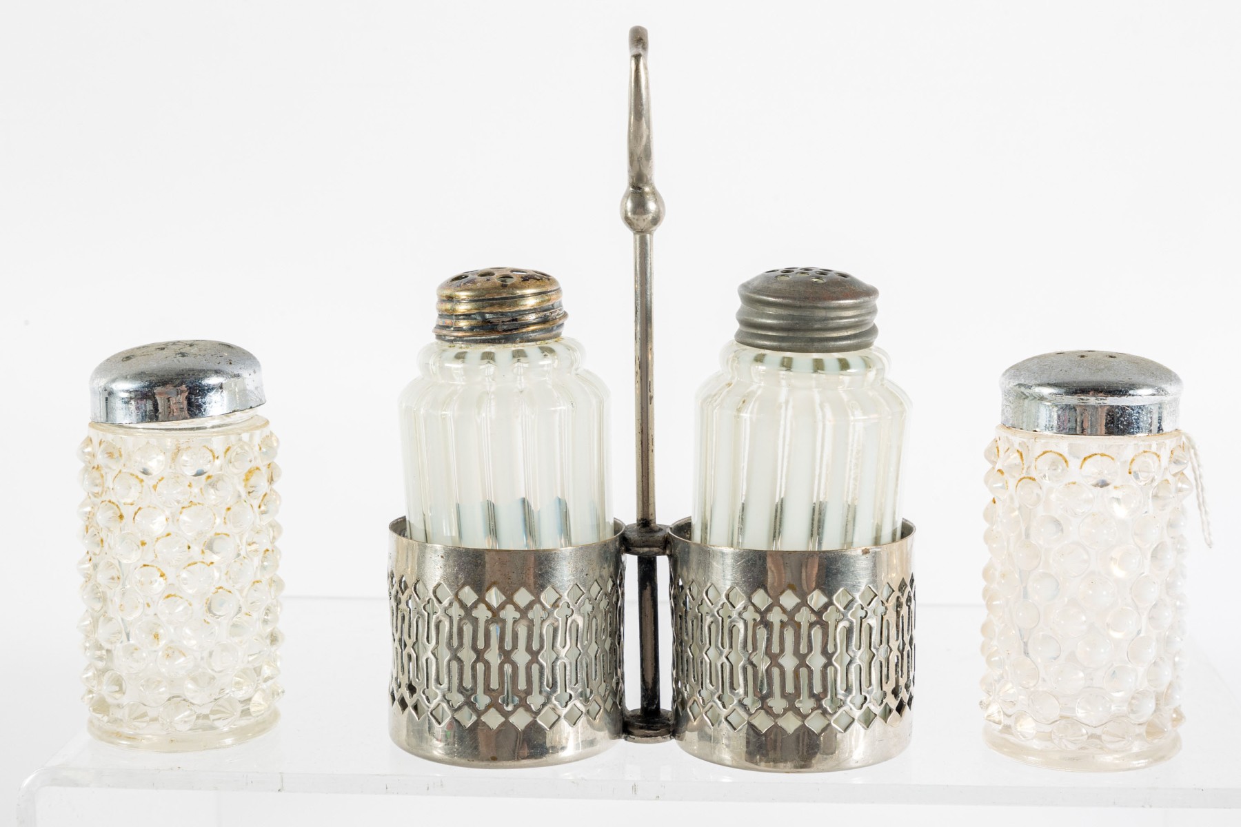 A fabulous collection of vintage clear and white depression glass salt and pepper shakers. Includes one trio, three pairs, and three singles. One pair comes with a silver plated cruet stand.