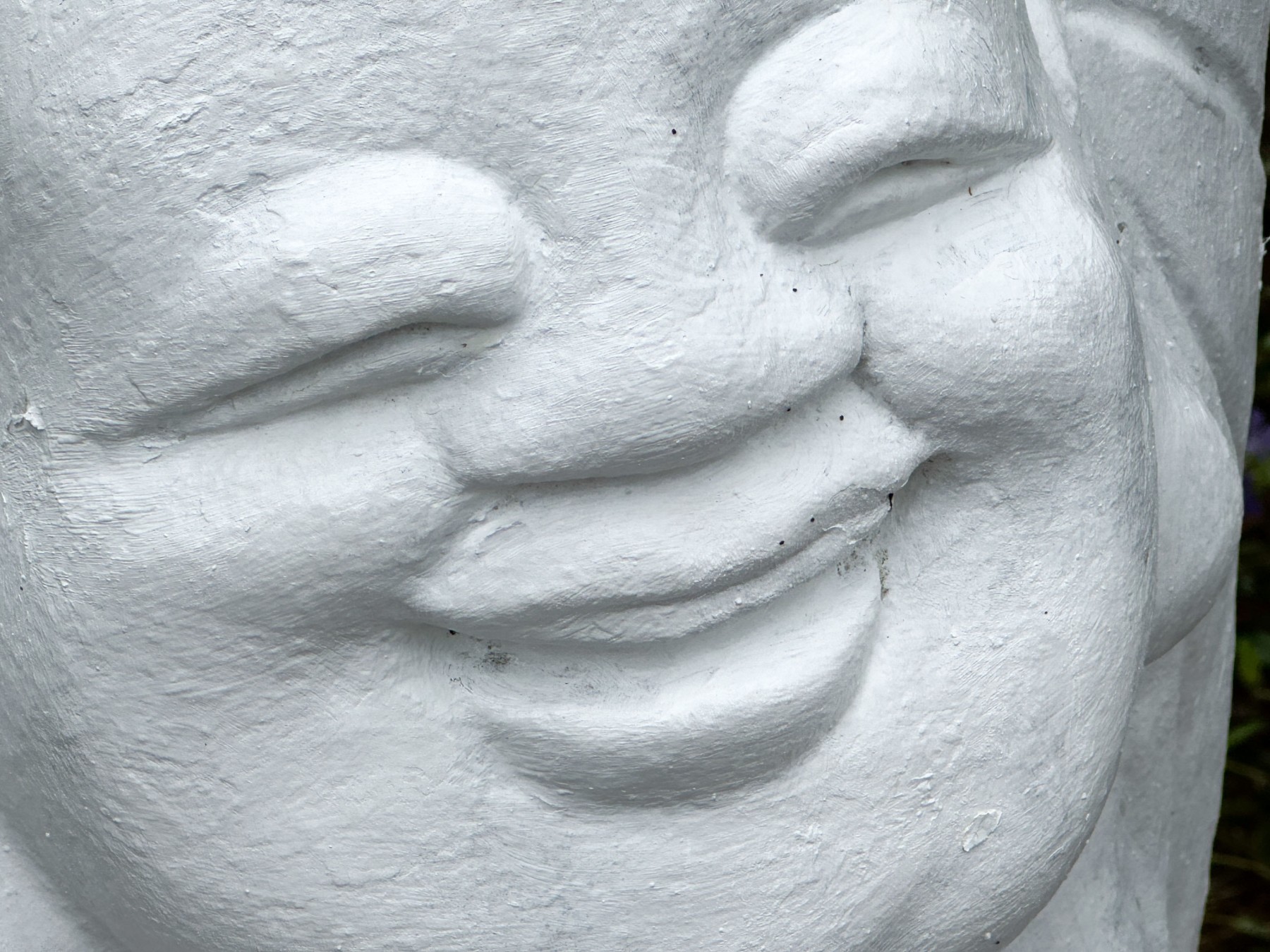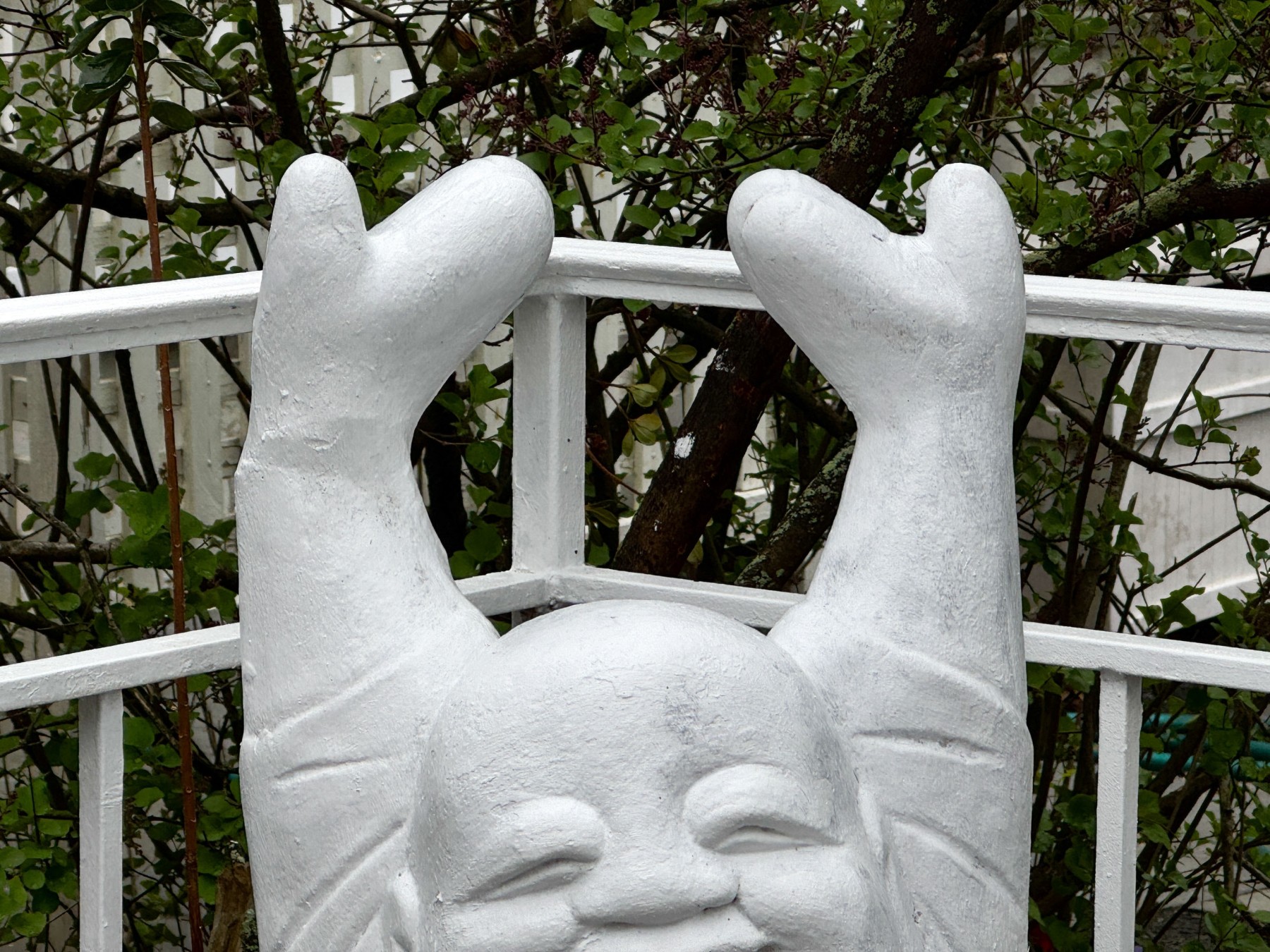 A delightful white finished cast stone sculpture of Hotei posed reaching his hands above his head with a joyful expression, wearing a relief textured sash.