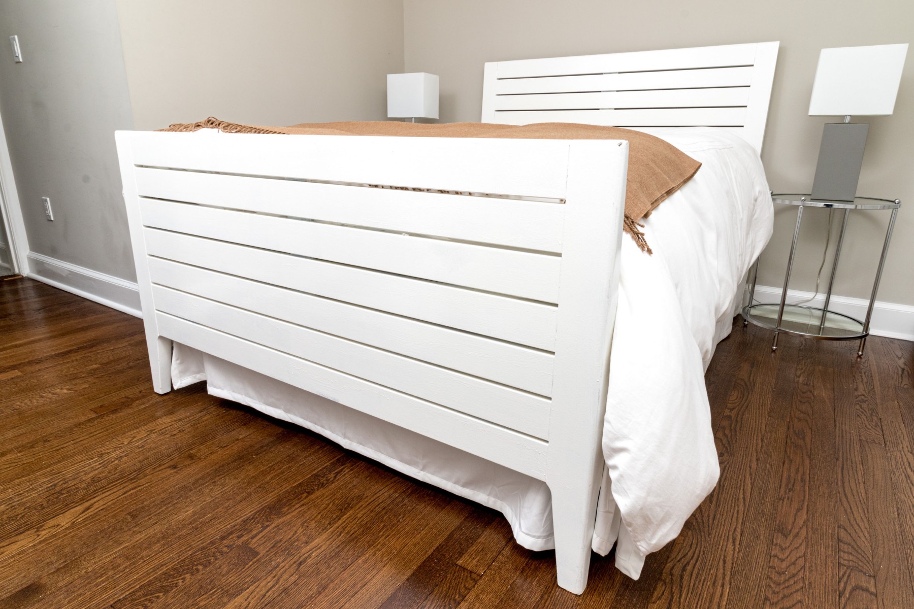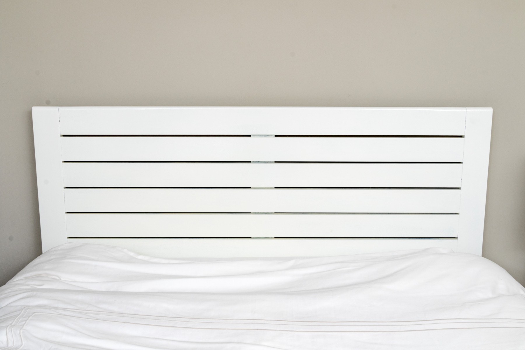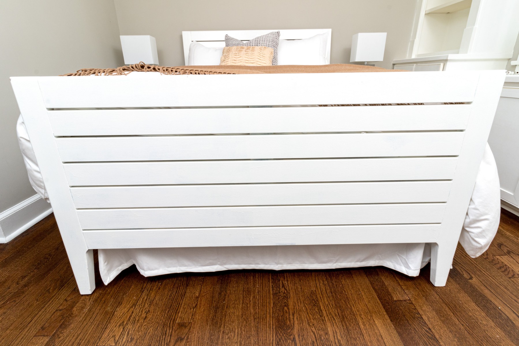 A wonderful farmhouse chic full size bed frame in a clean white finish, featuring a minimalistic rectangular headboard and footboard with a slatted design.