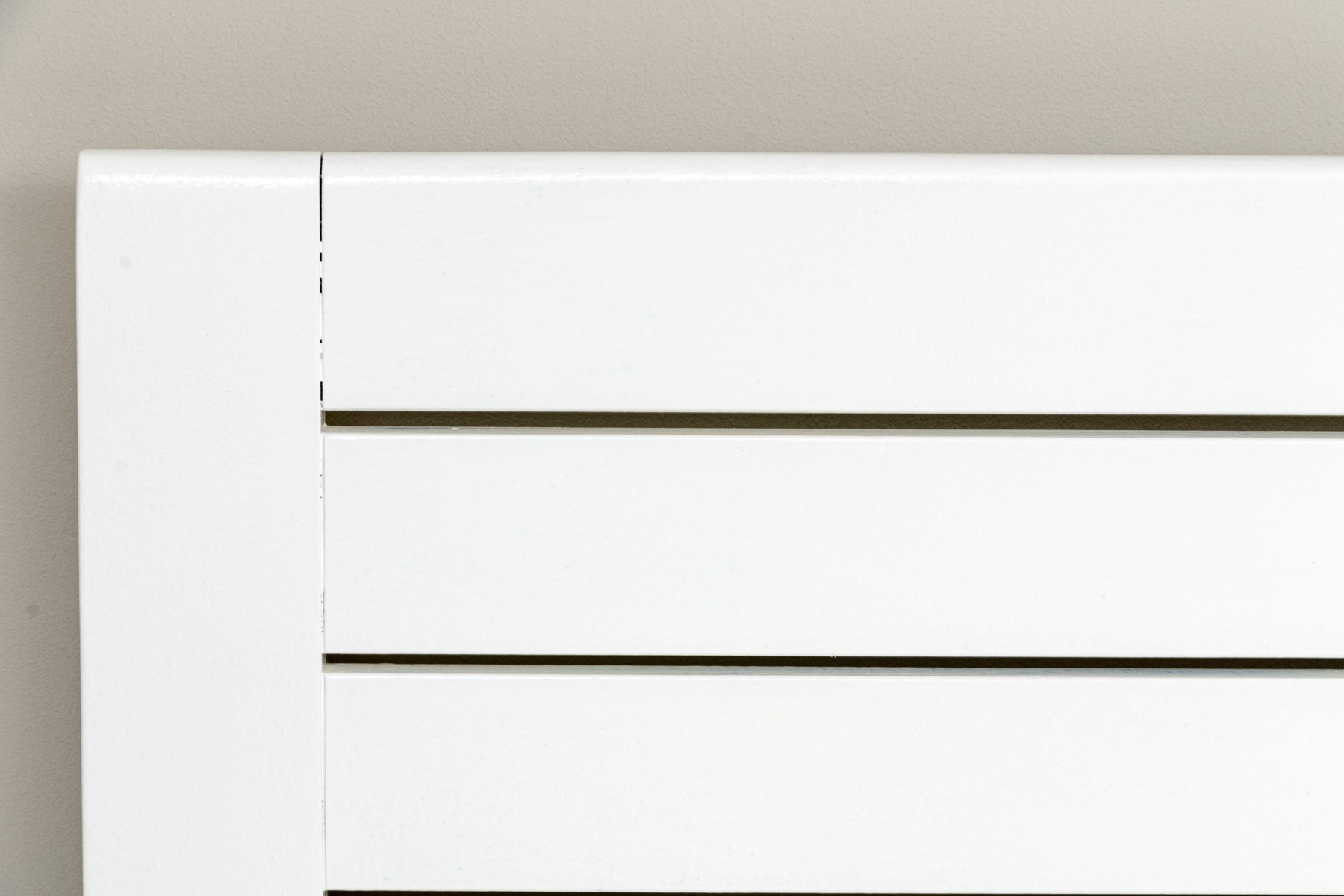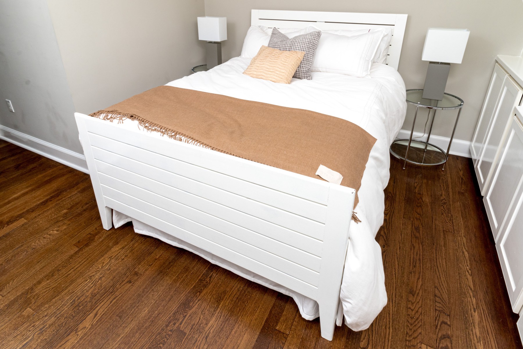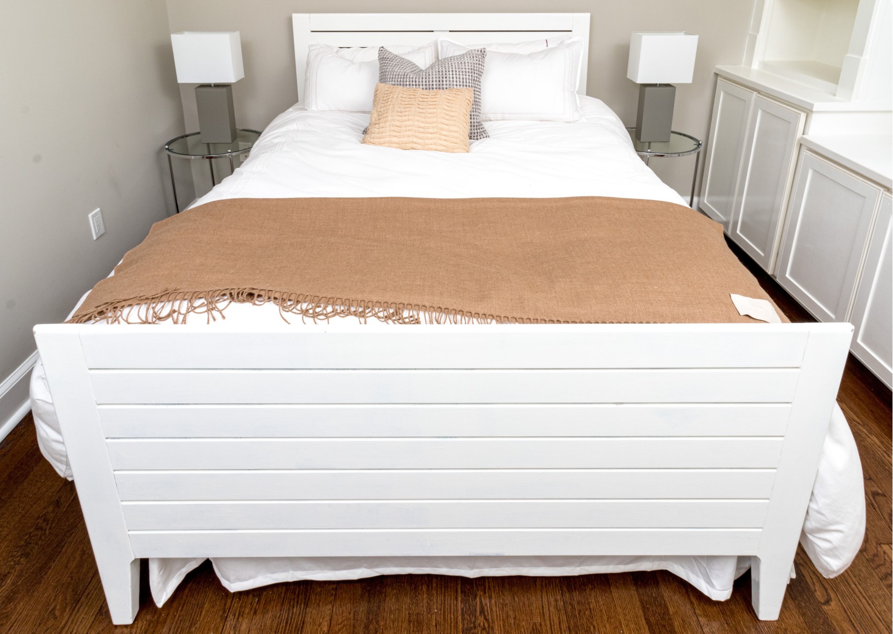 A wonderful farmhouse chic full size bed frame in a clean white finish, featuring a minimalistic rectangular headboard and footboard with a slatted design.