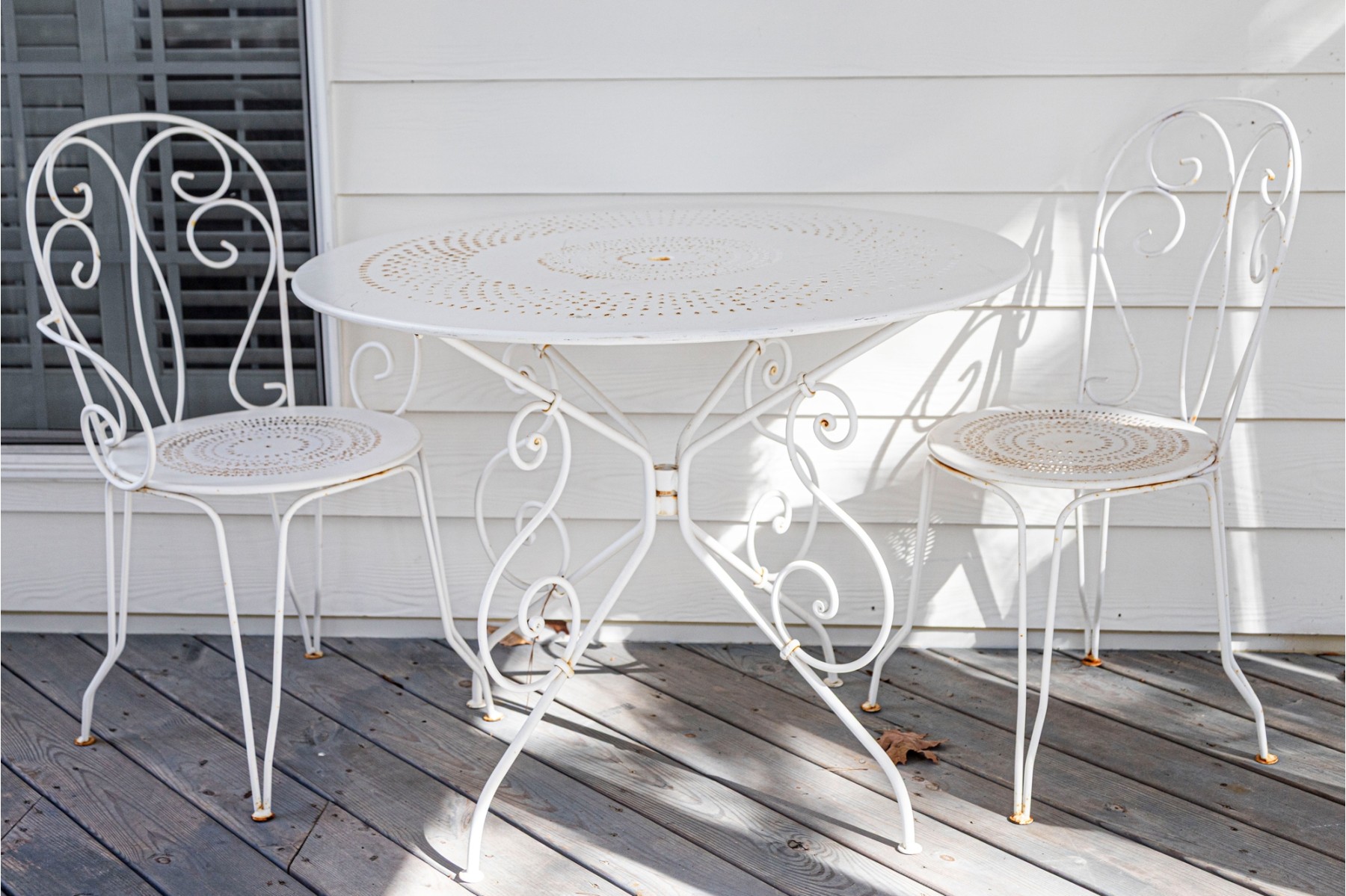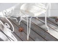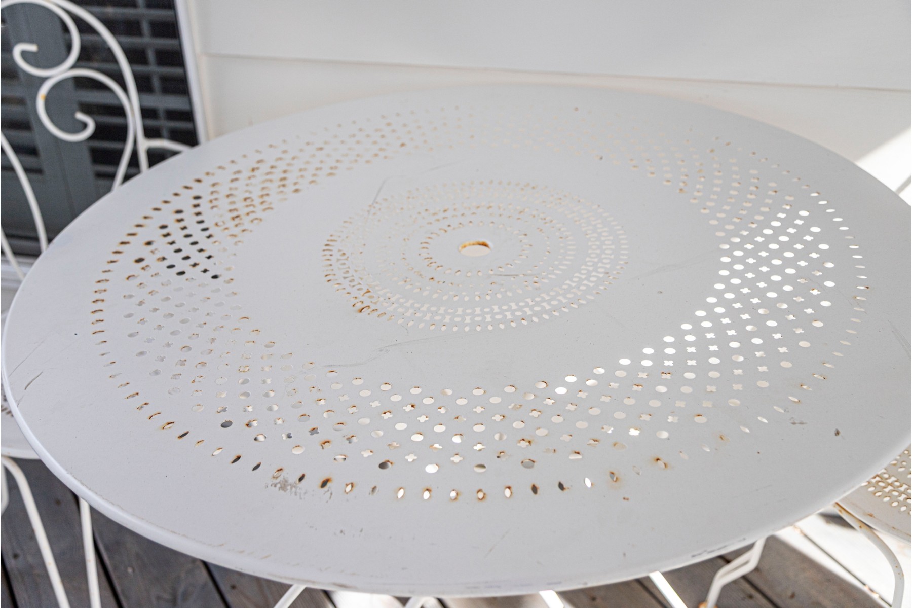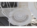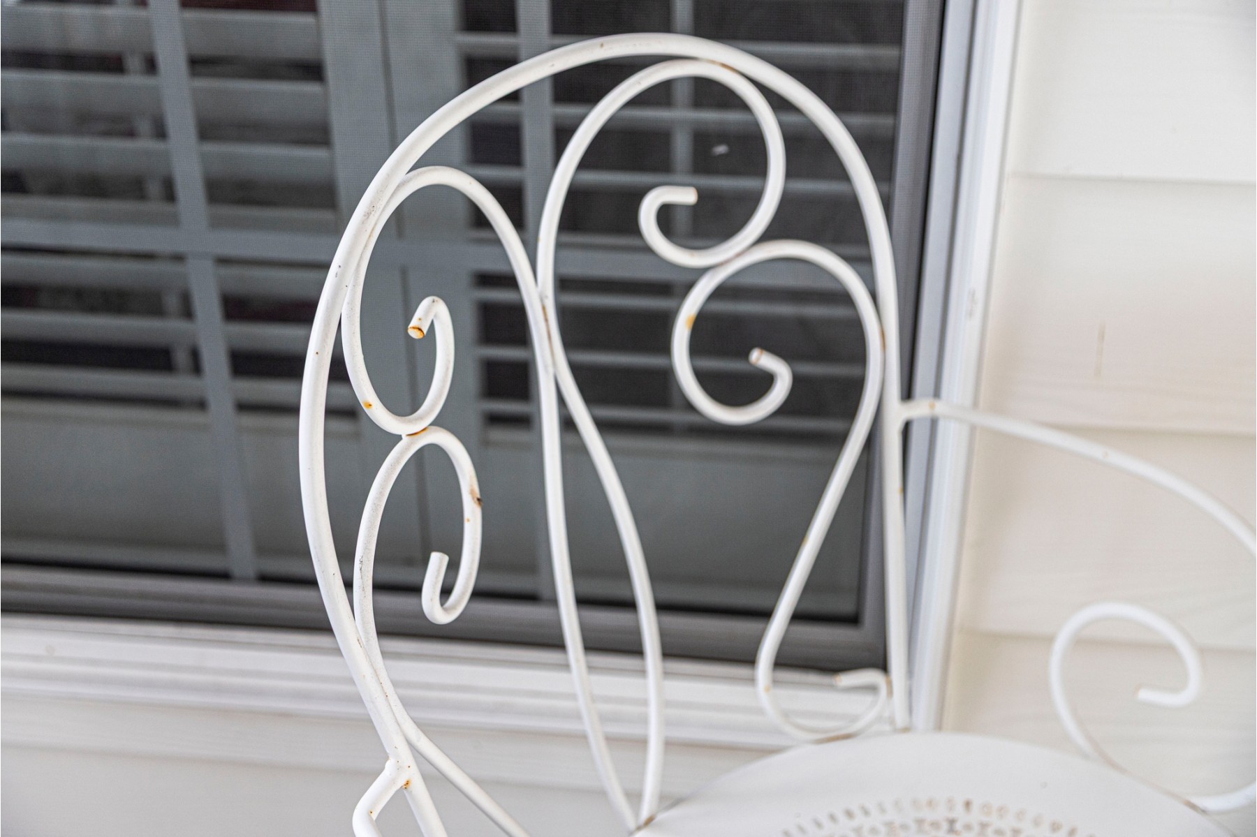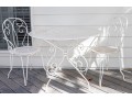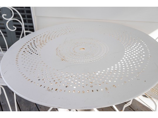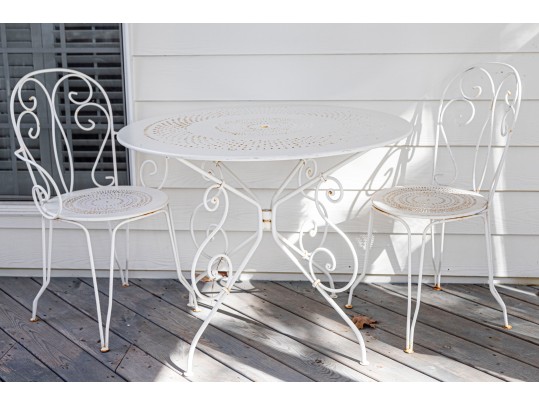 A lovely patio set in white, complete with a pierced, 38" bistro table and two matching chairs sporting a decorative iron wire frame -- French inspired.