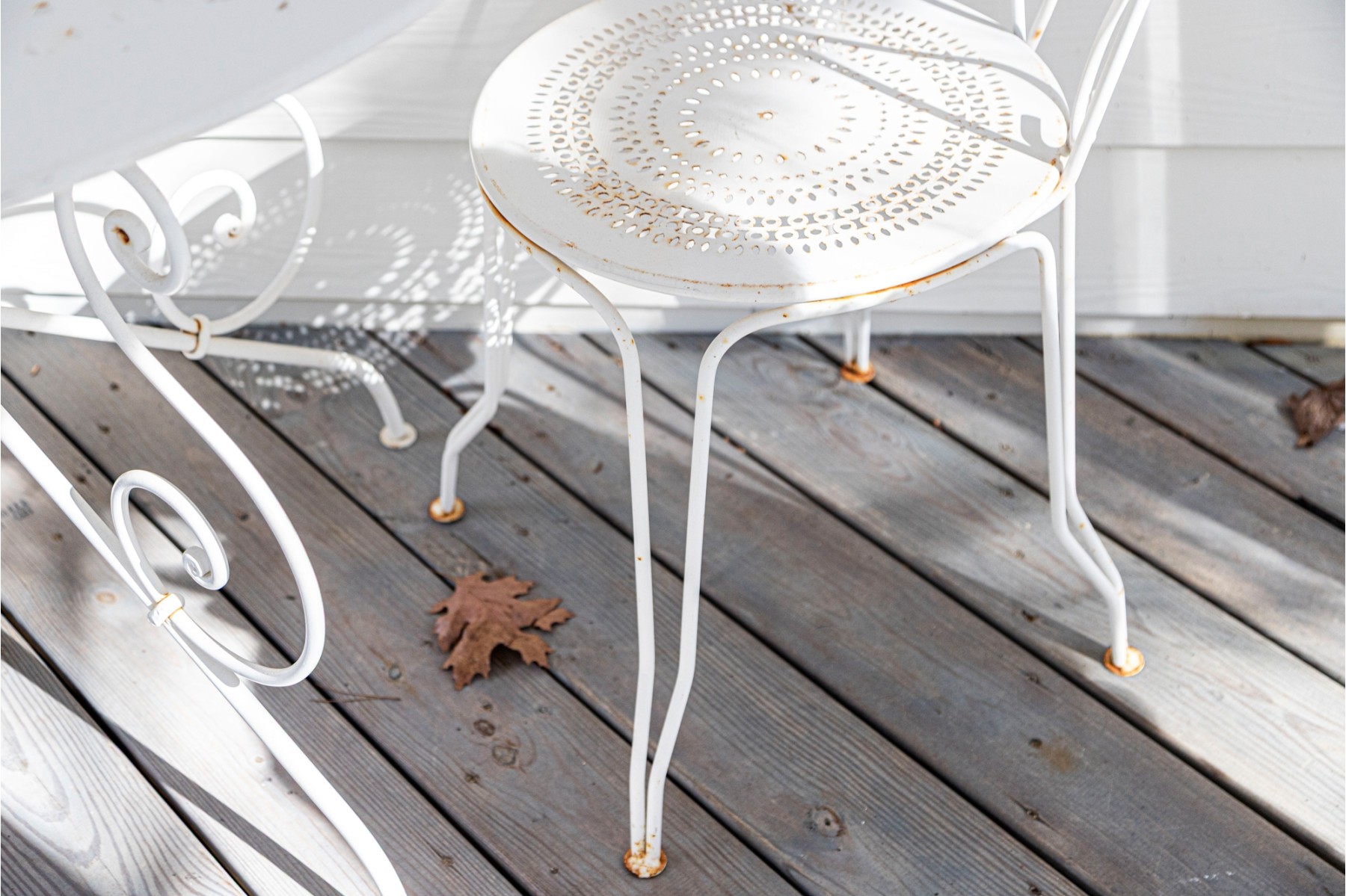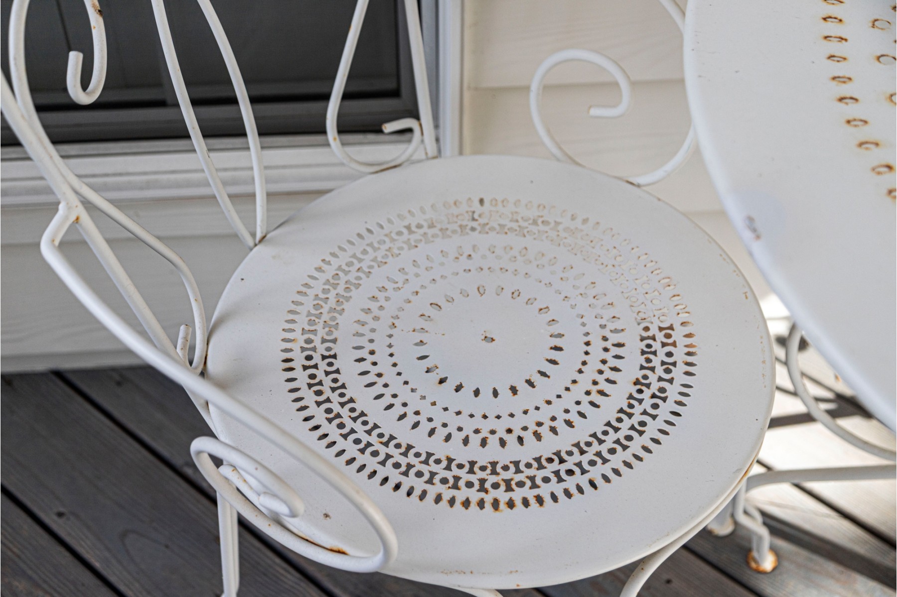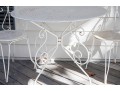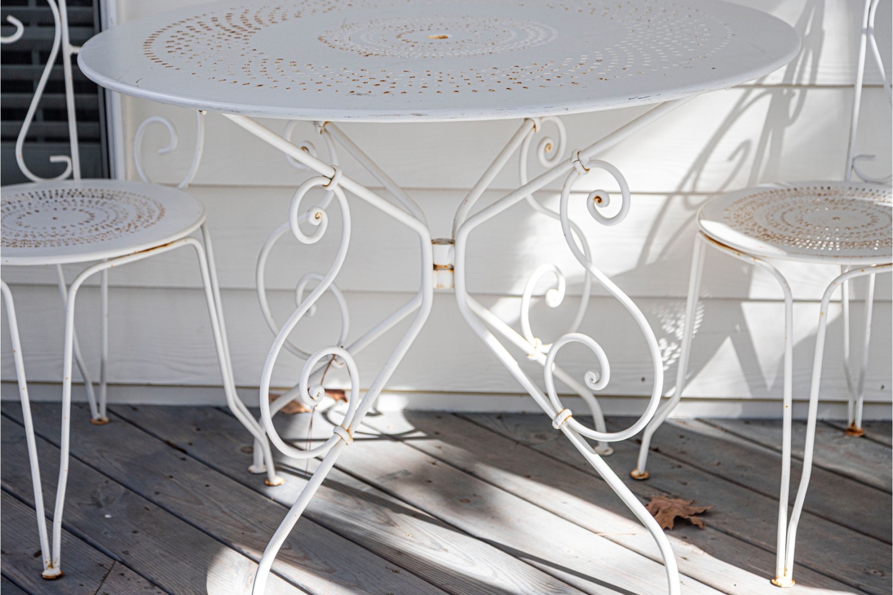 A lovely patio set in white, complete with a pierced, 38" bistro table and two matching chairs sporting a decorative iron wire frame -- French inspired.