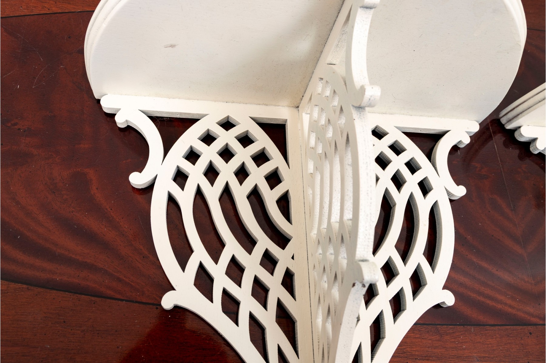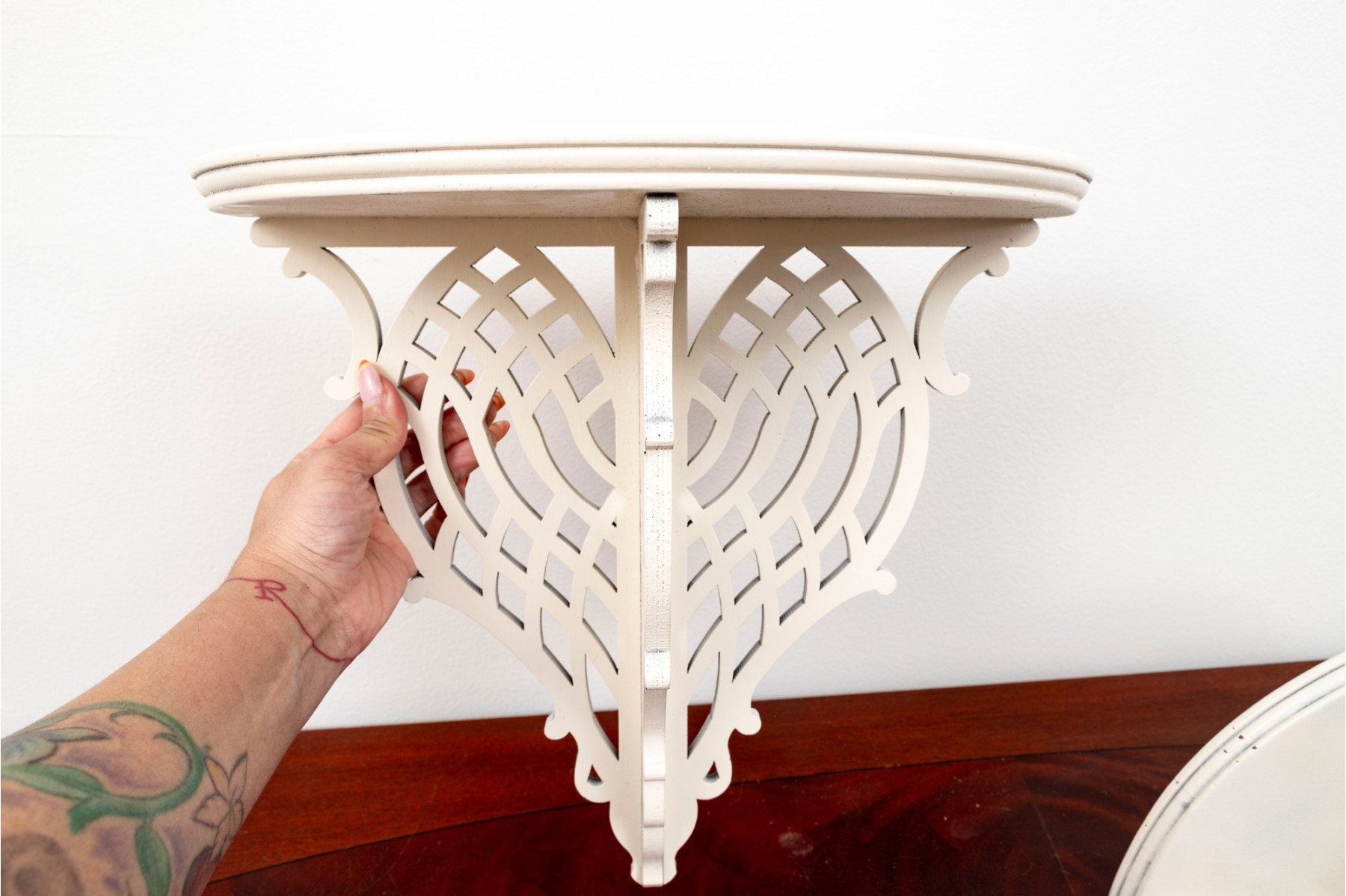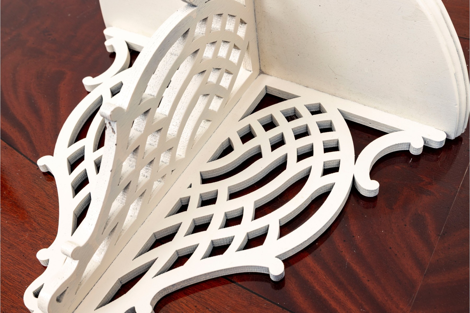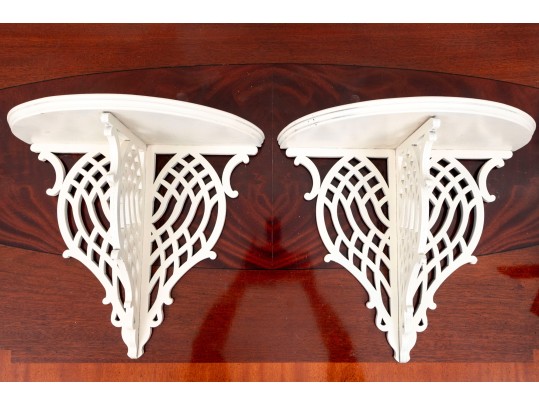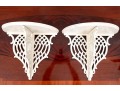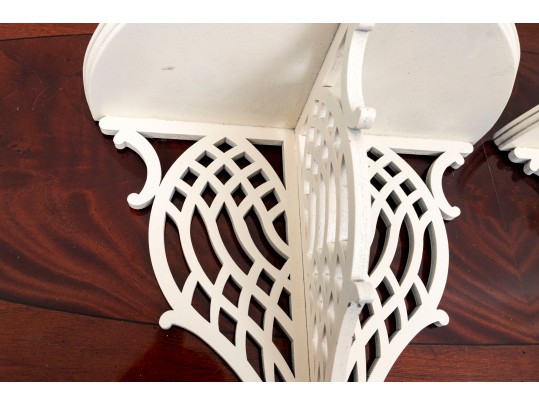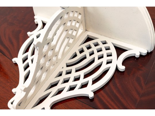 A pair of modern wall mount shelf sconces in white with ornately scrolled lattice details.