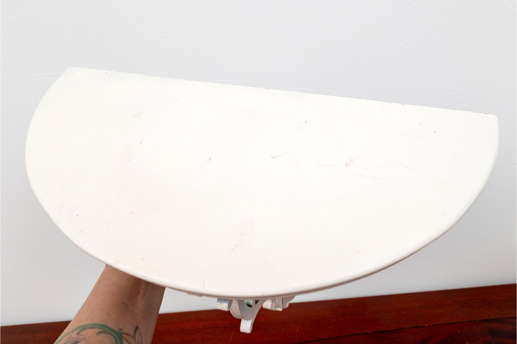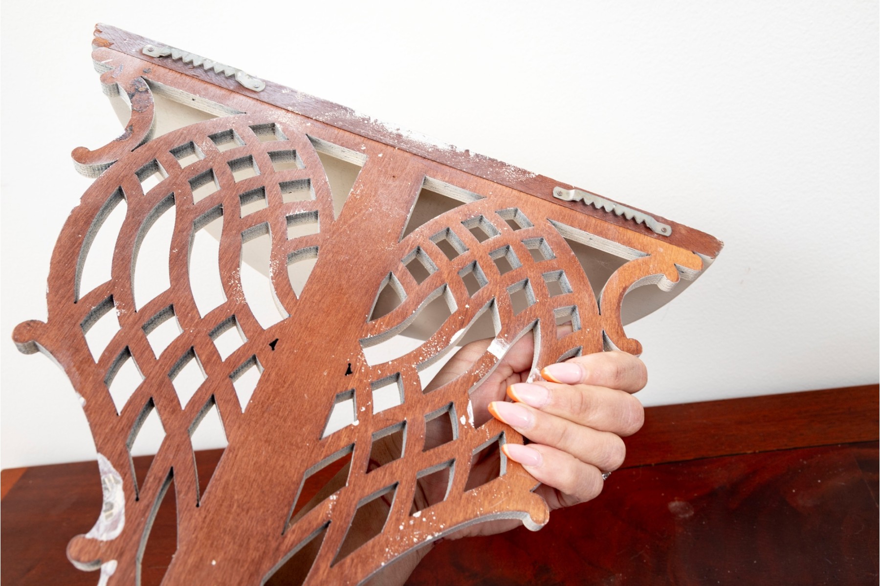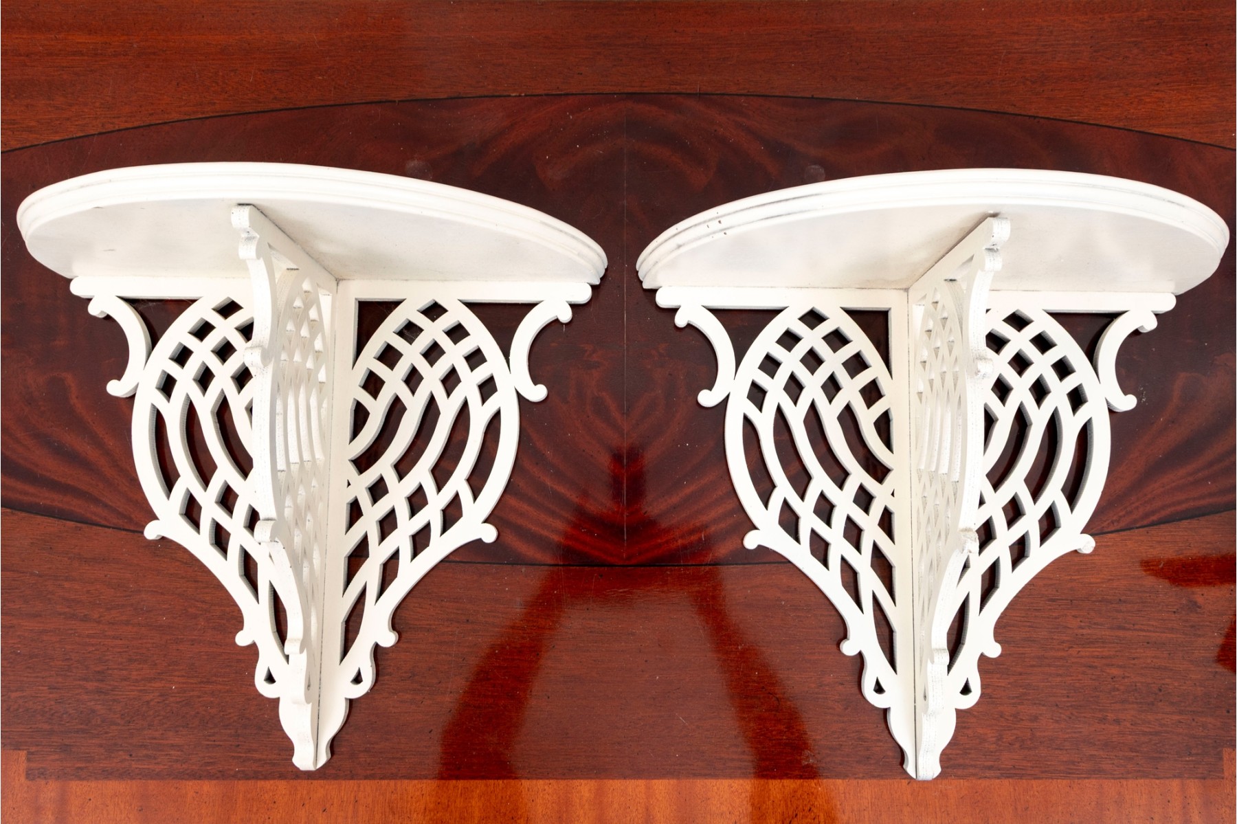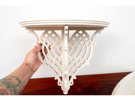 A pair of modern wall mount shelf sconces in white with ornately scrolled lattice details.
