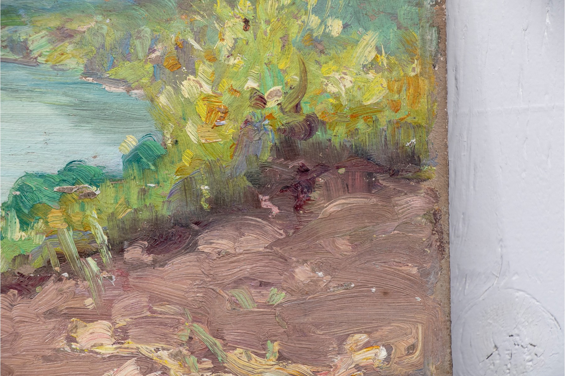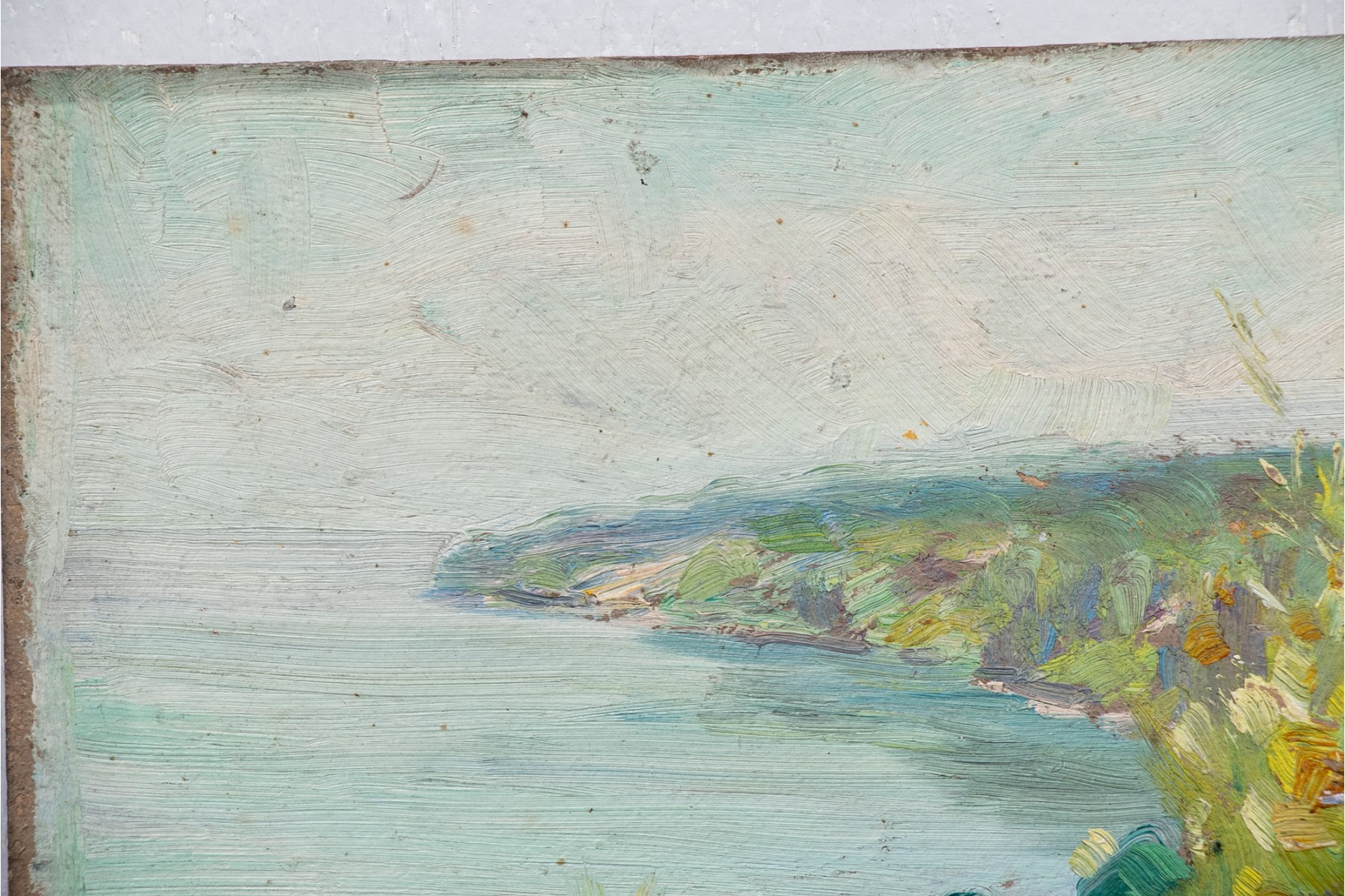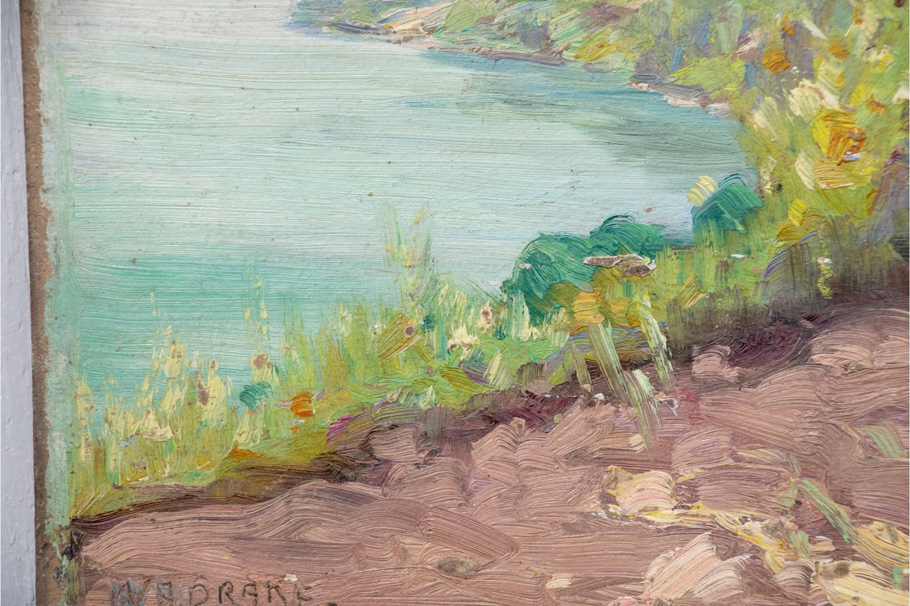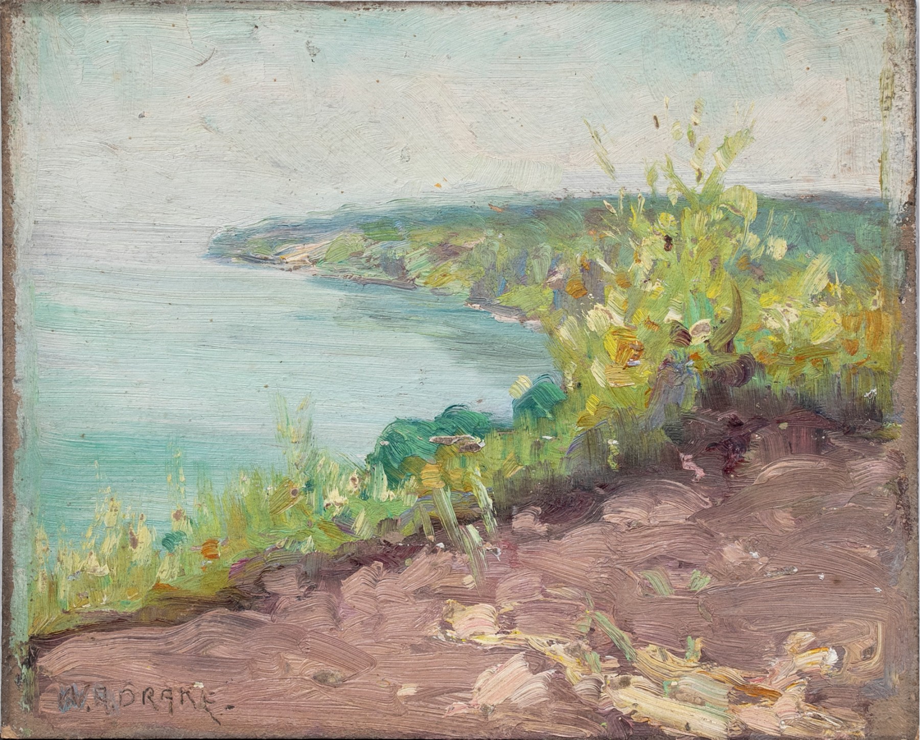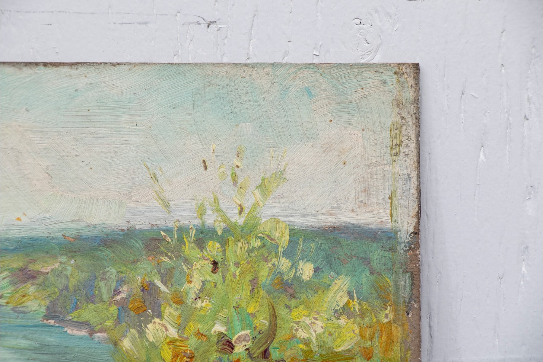Small oil on board depicting a coastal scene with rocks in the foreground, flowers and shrubs on the hill overlooking the waters below.