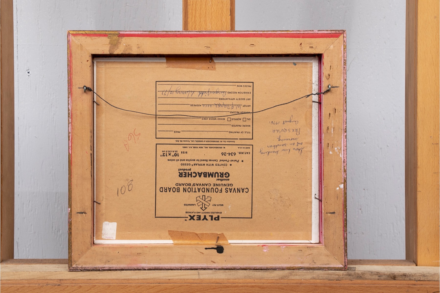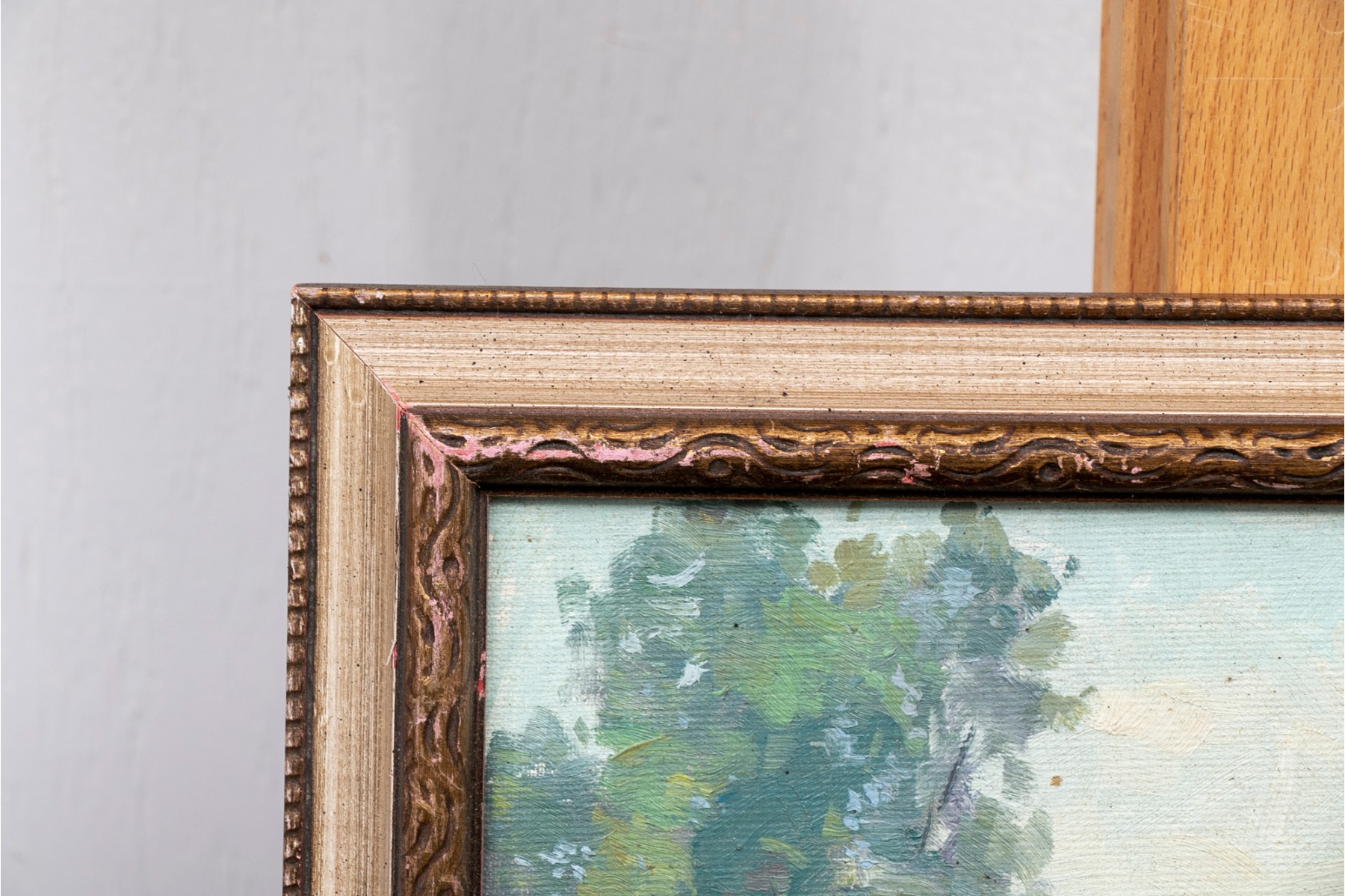 Condition: wear to frame exposing a pink subsurface, visible wear to left edge of board, foxing spot to right side of tree in sky. Needs a little cleaning.