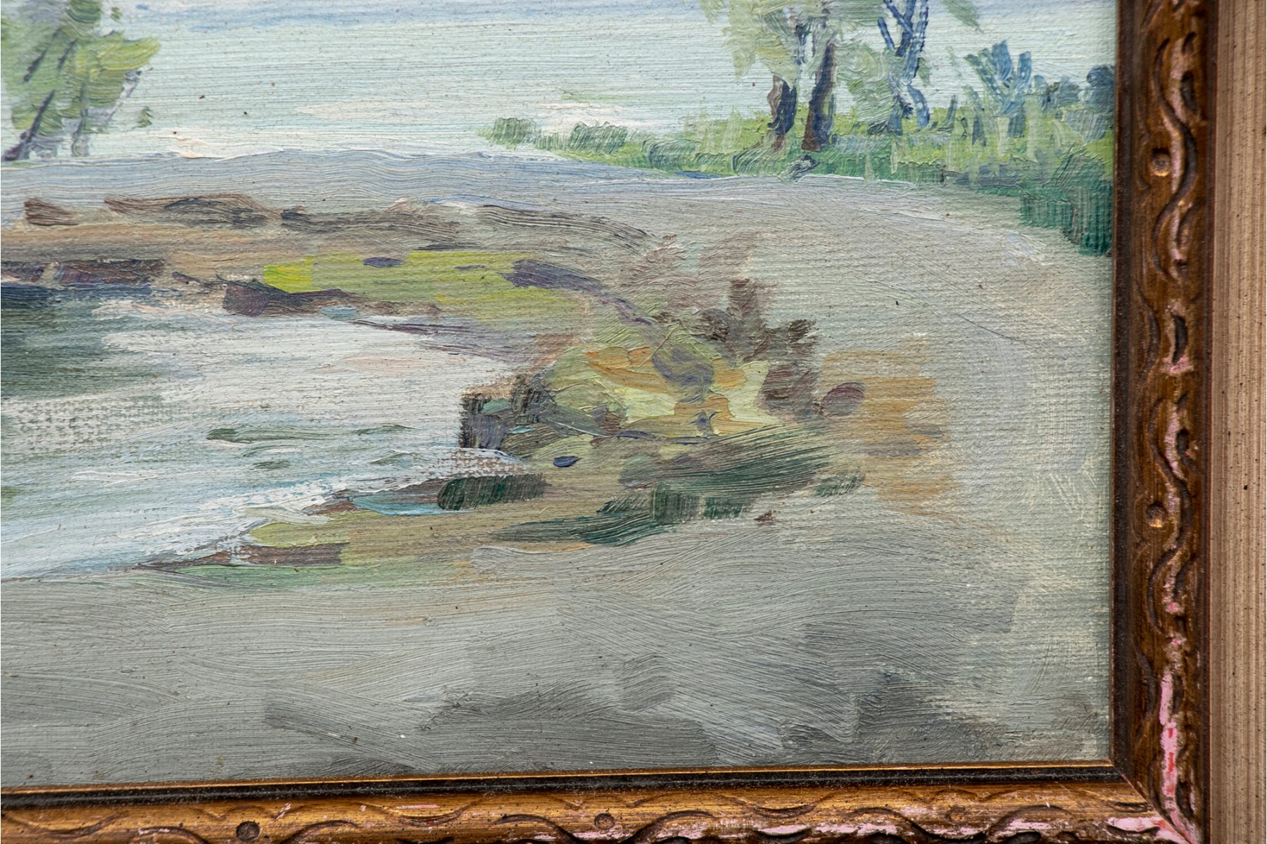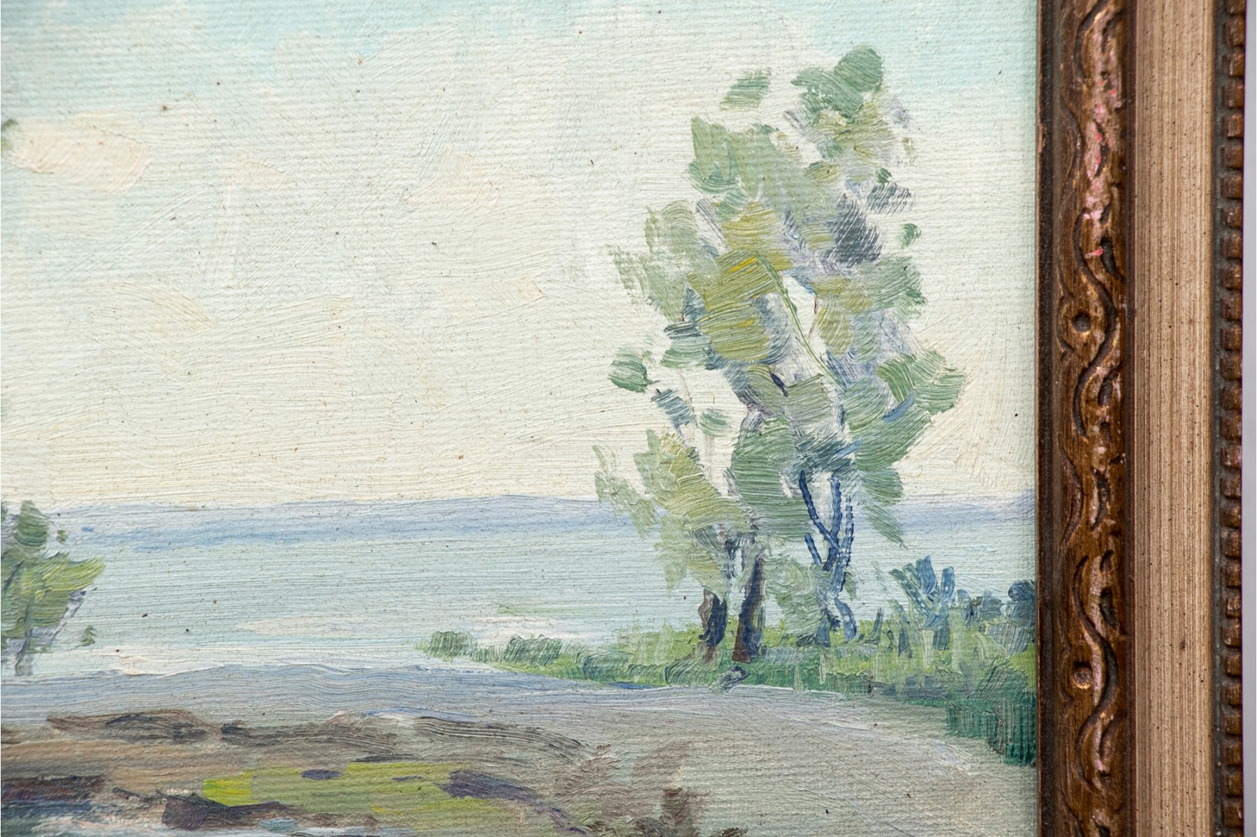 Oil on canvas board depicting a blue and grey tonal coastline landscape with path leading to the ocean, a sandbar in the foreground and green leafy trees in the distance.