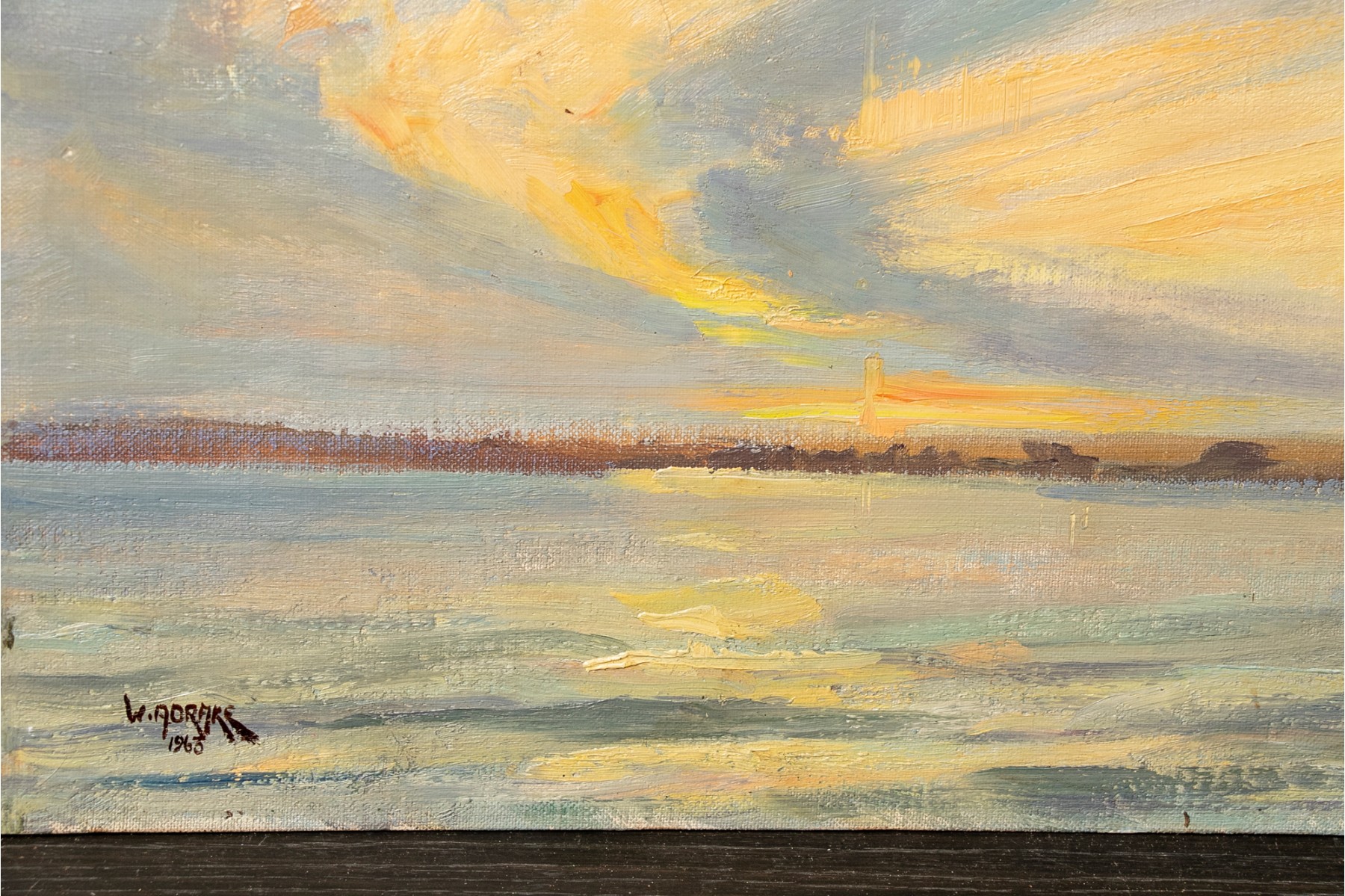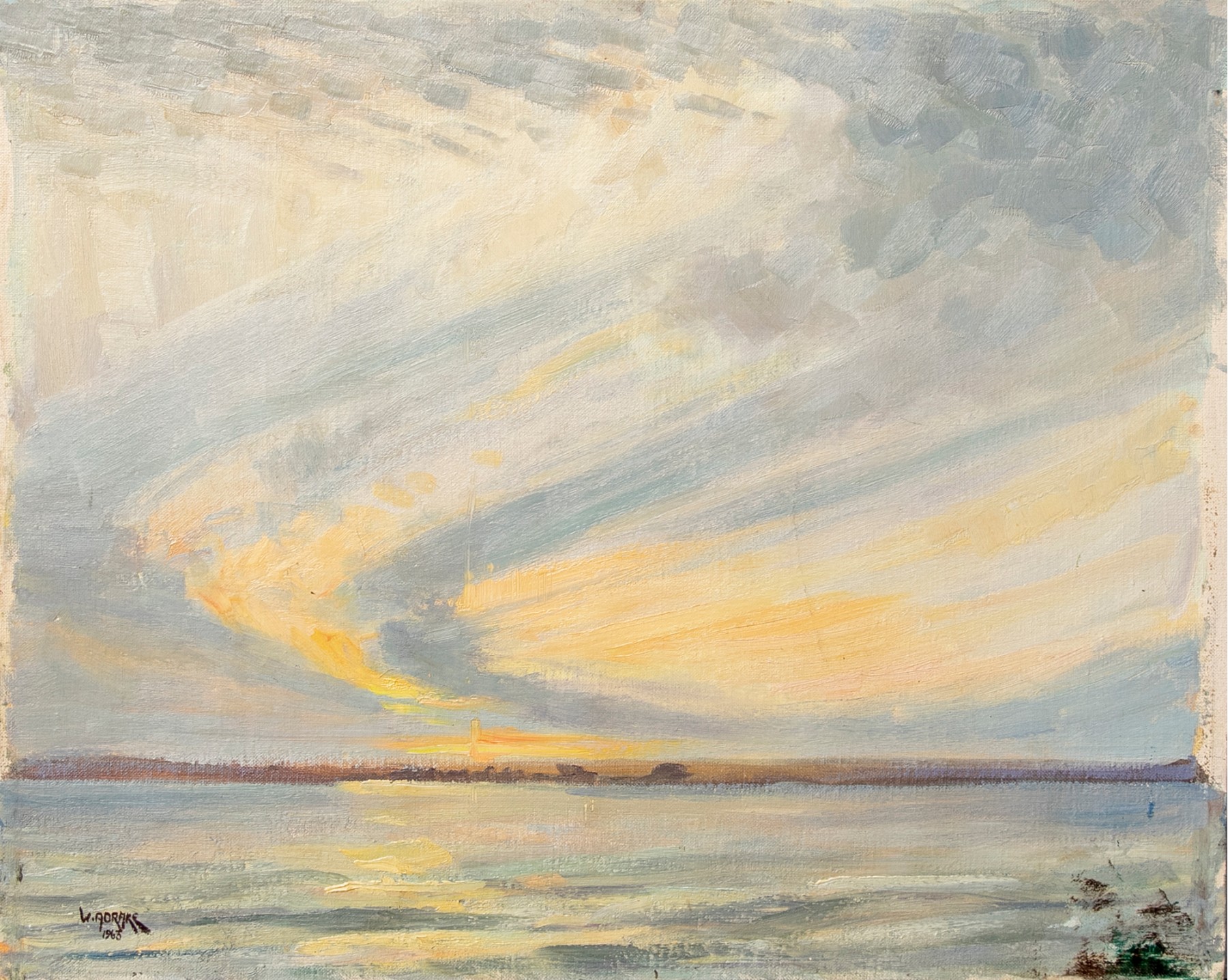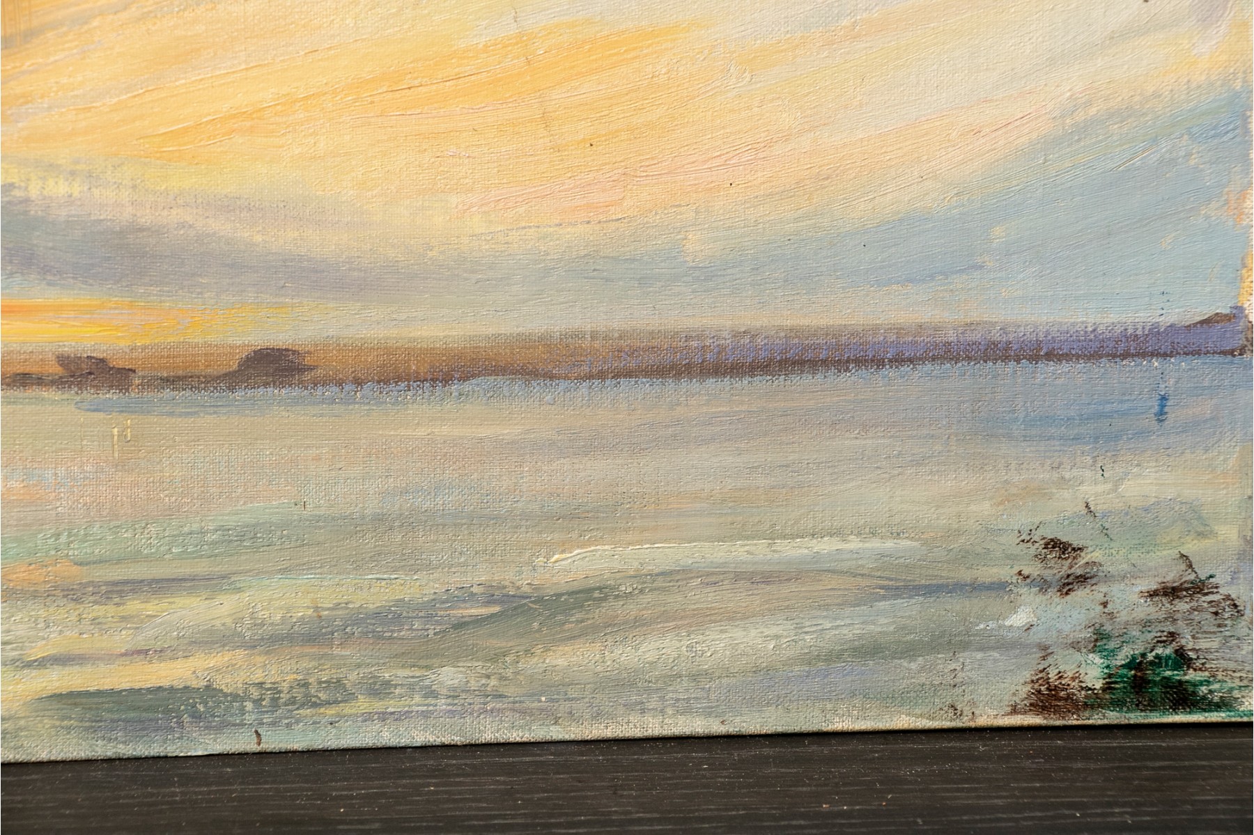 Oil on canvas board depicting a pastel sunset with the setting sun casting its reflection onto the waters below.