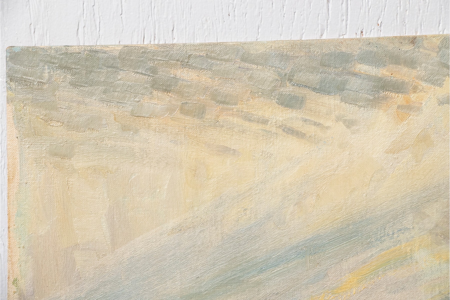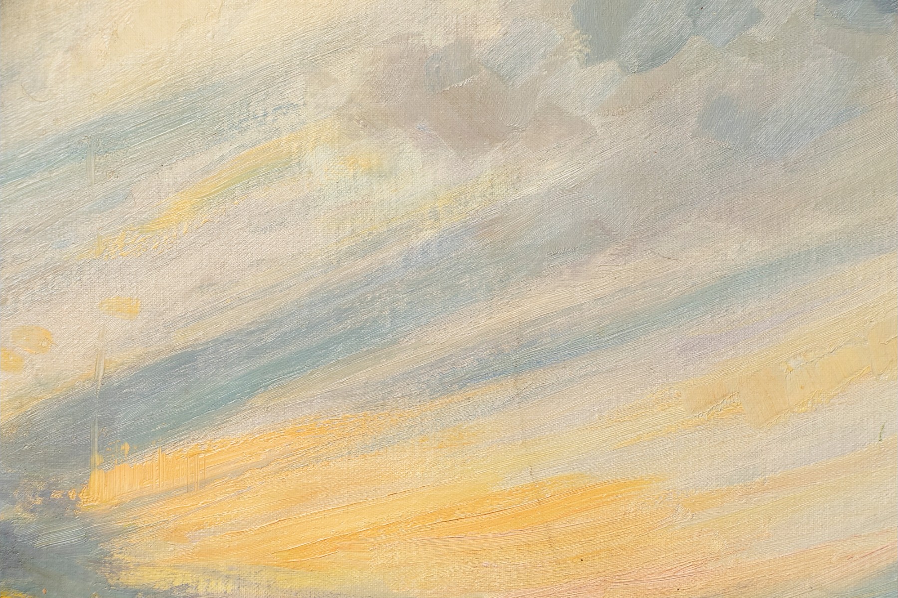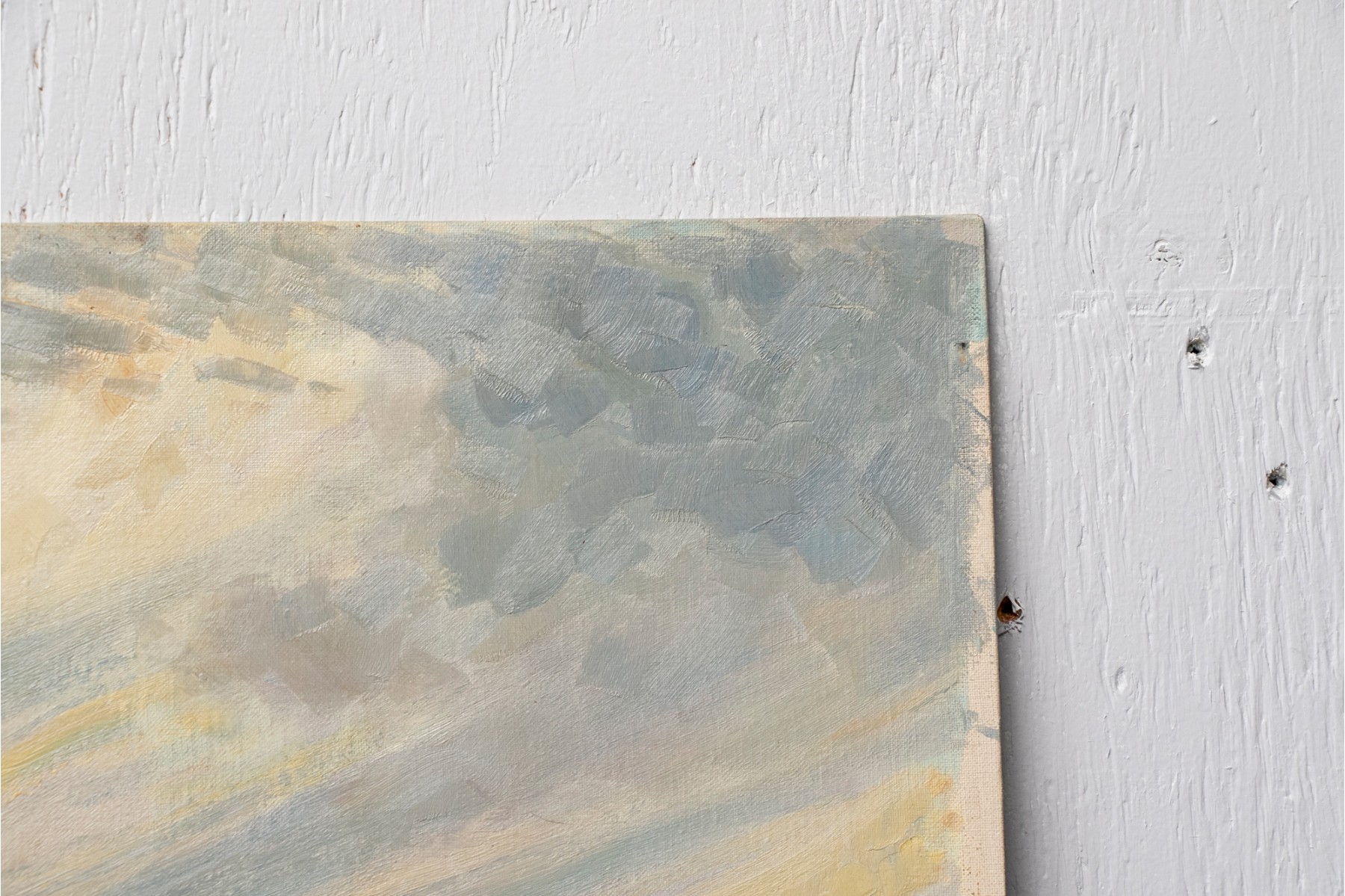 Oil on canvas board depicting a pastel sunset with the setting sun casting its reflection onto the waters below.