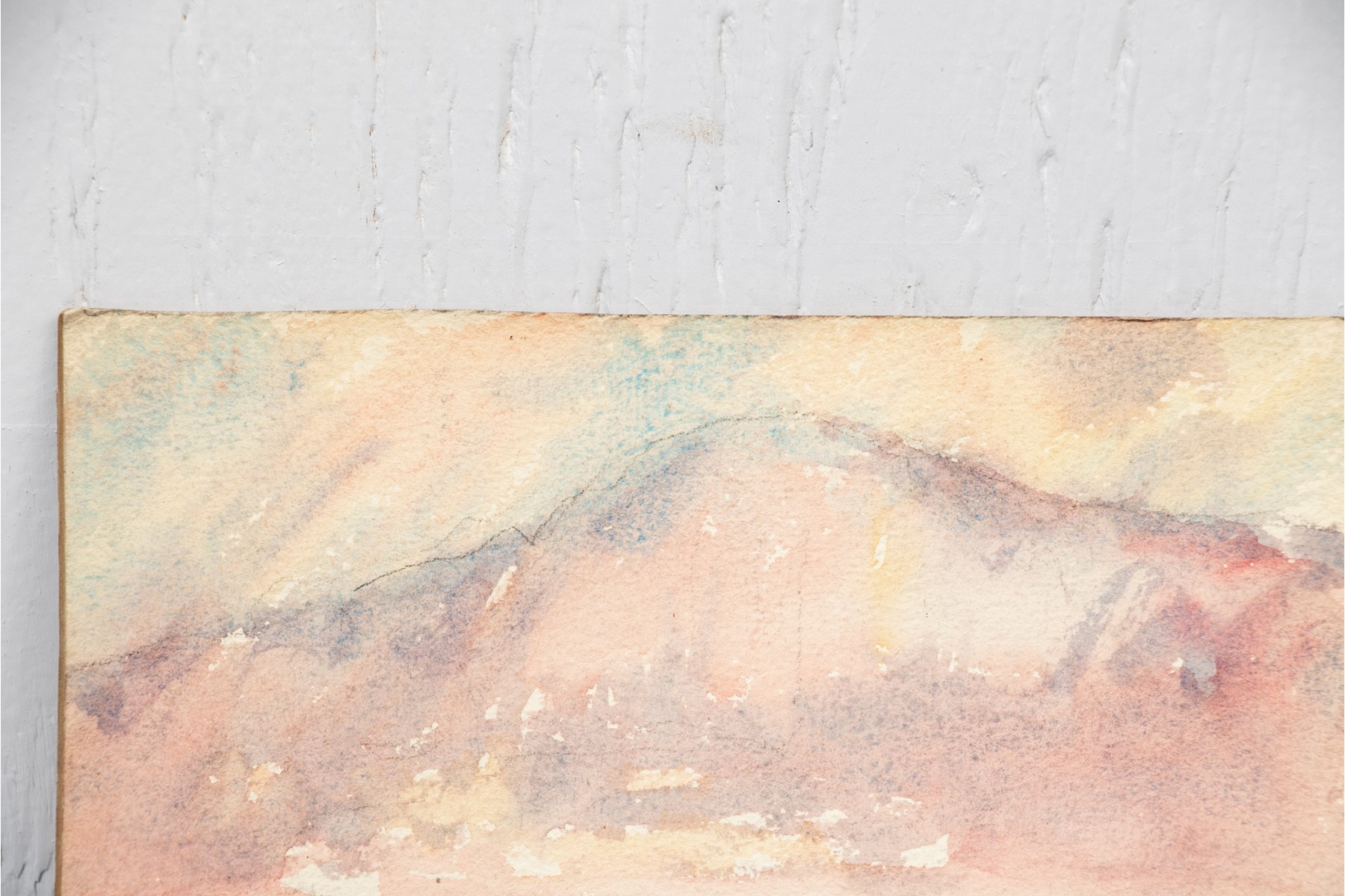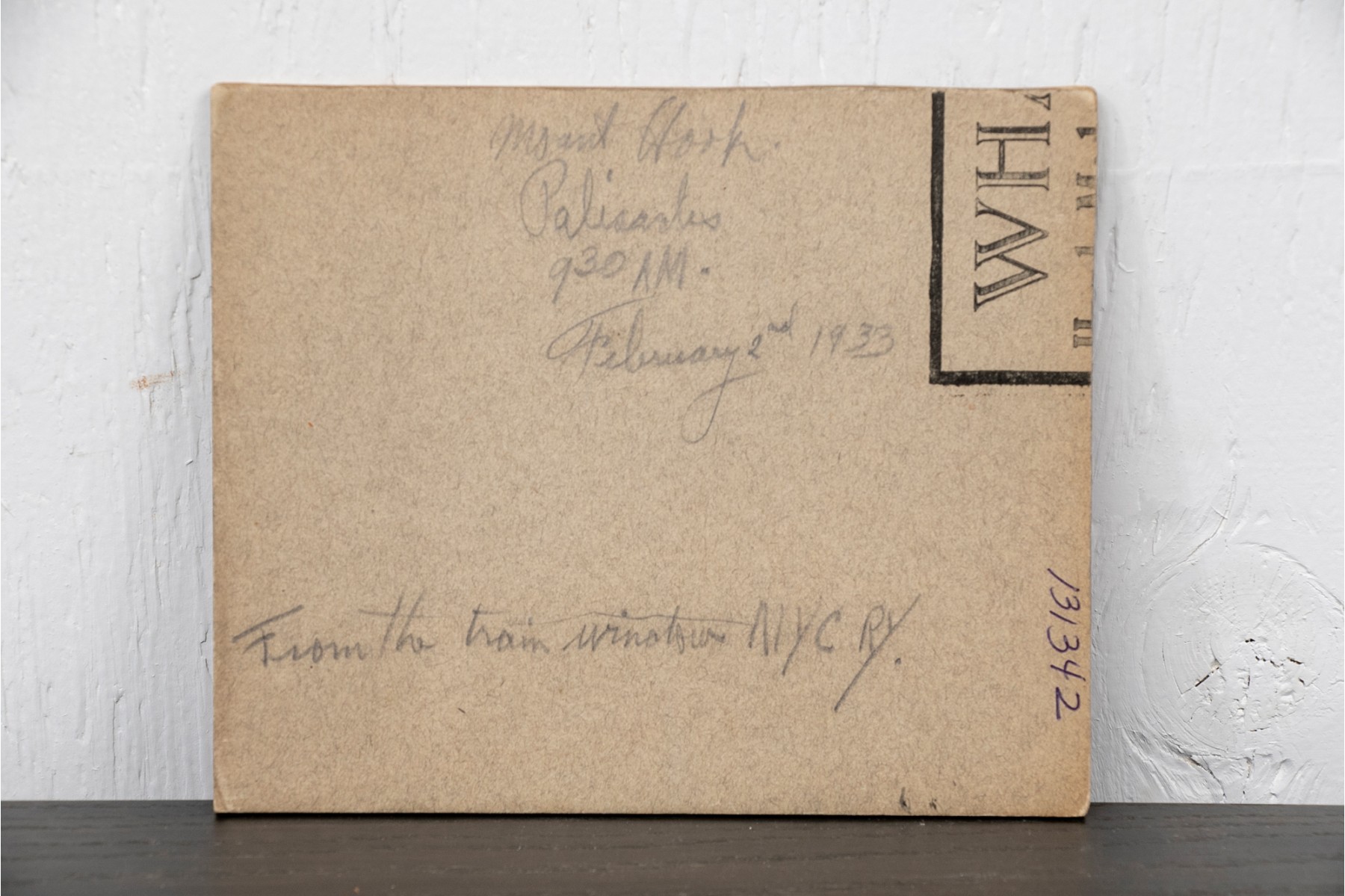A wonderfully painted watercolor on board painting depicting a view of Mount Hook, Palisades at 9:30 AM on February 2nd, 1933. Painted from the train station NYC.
