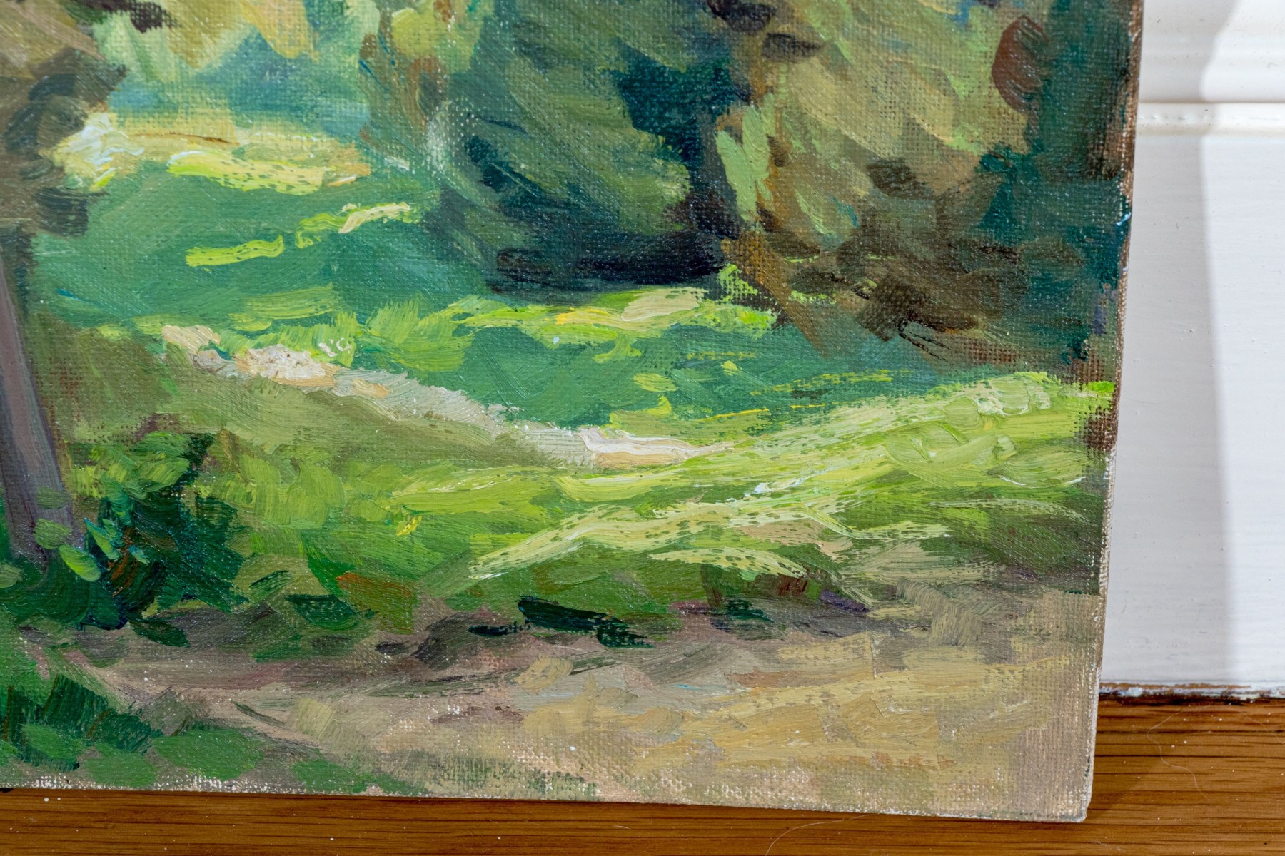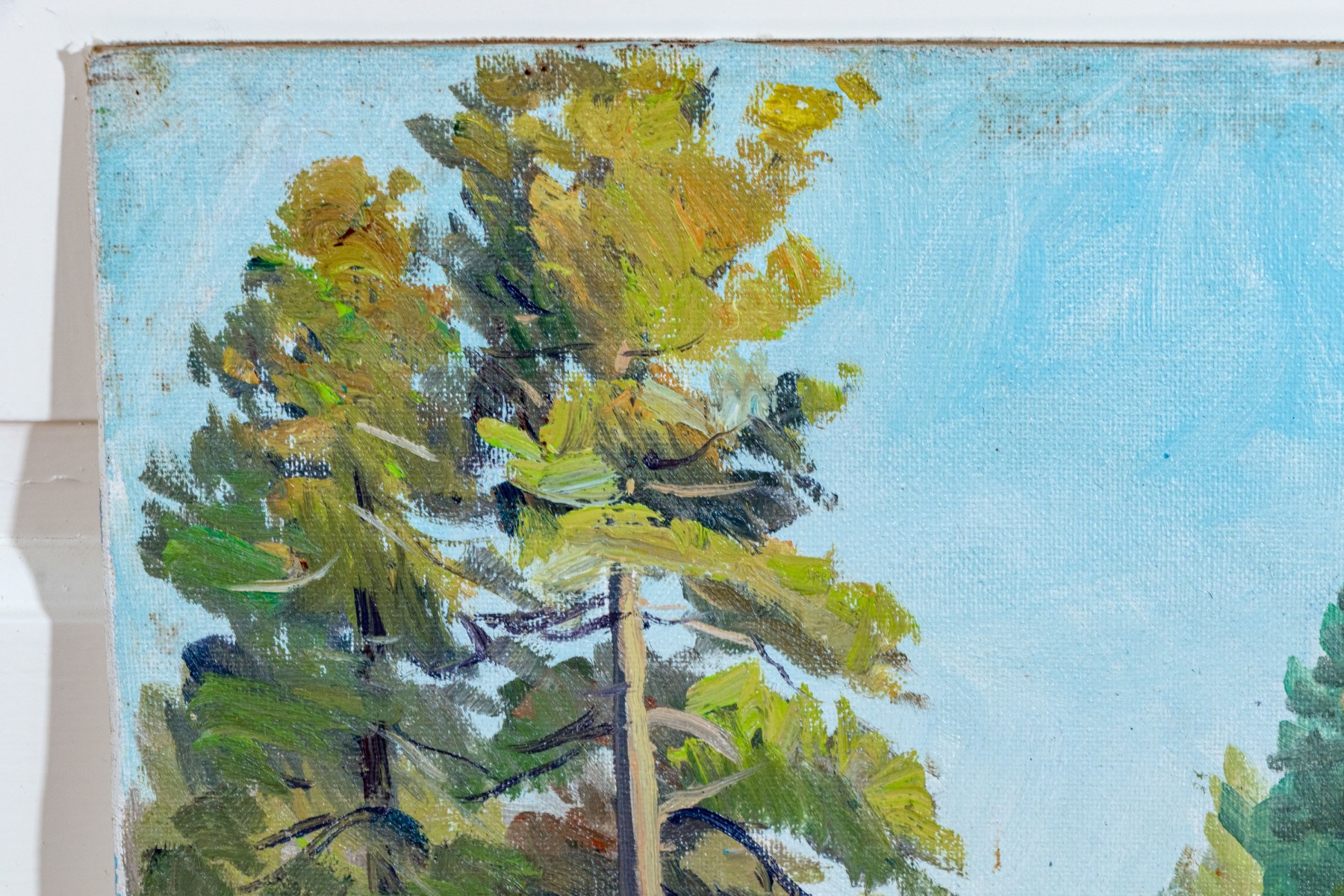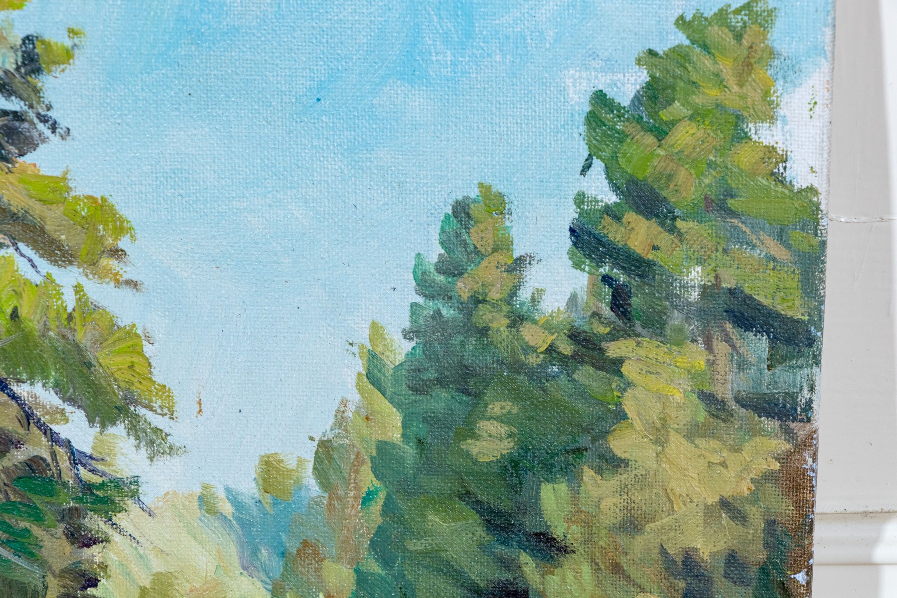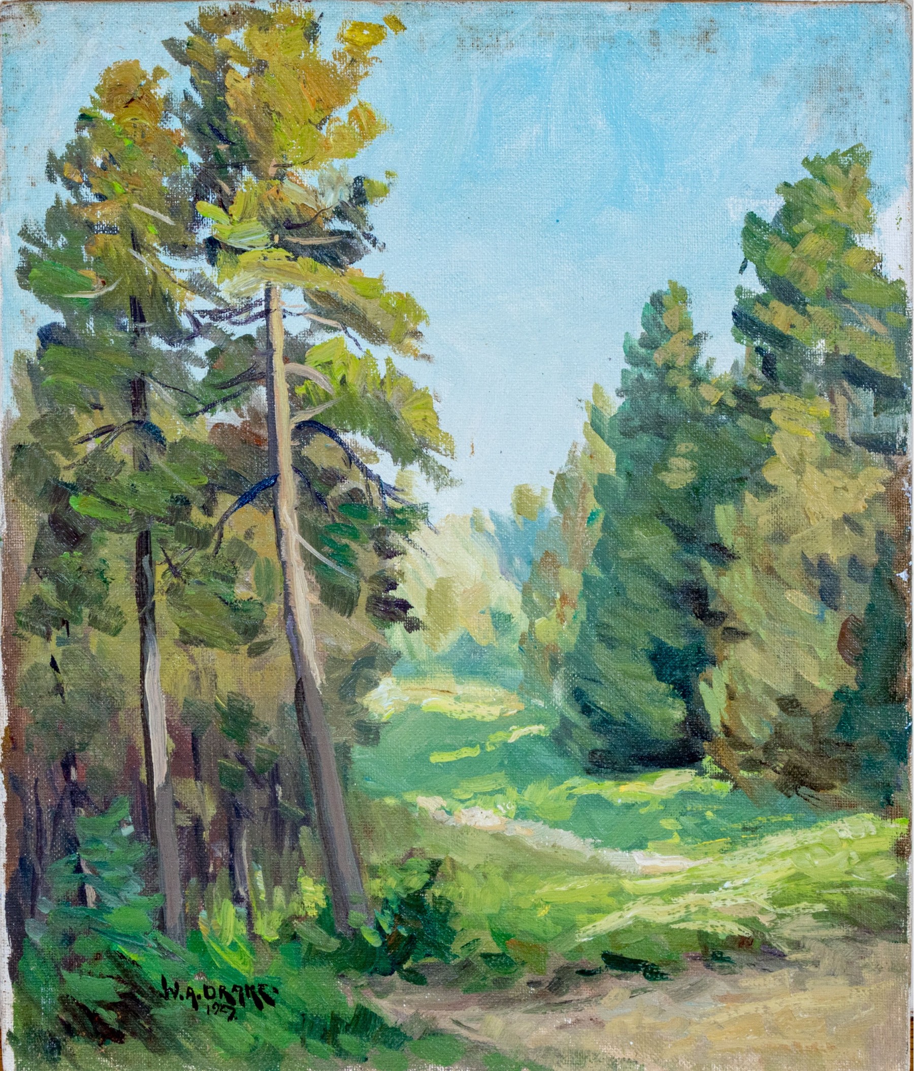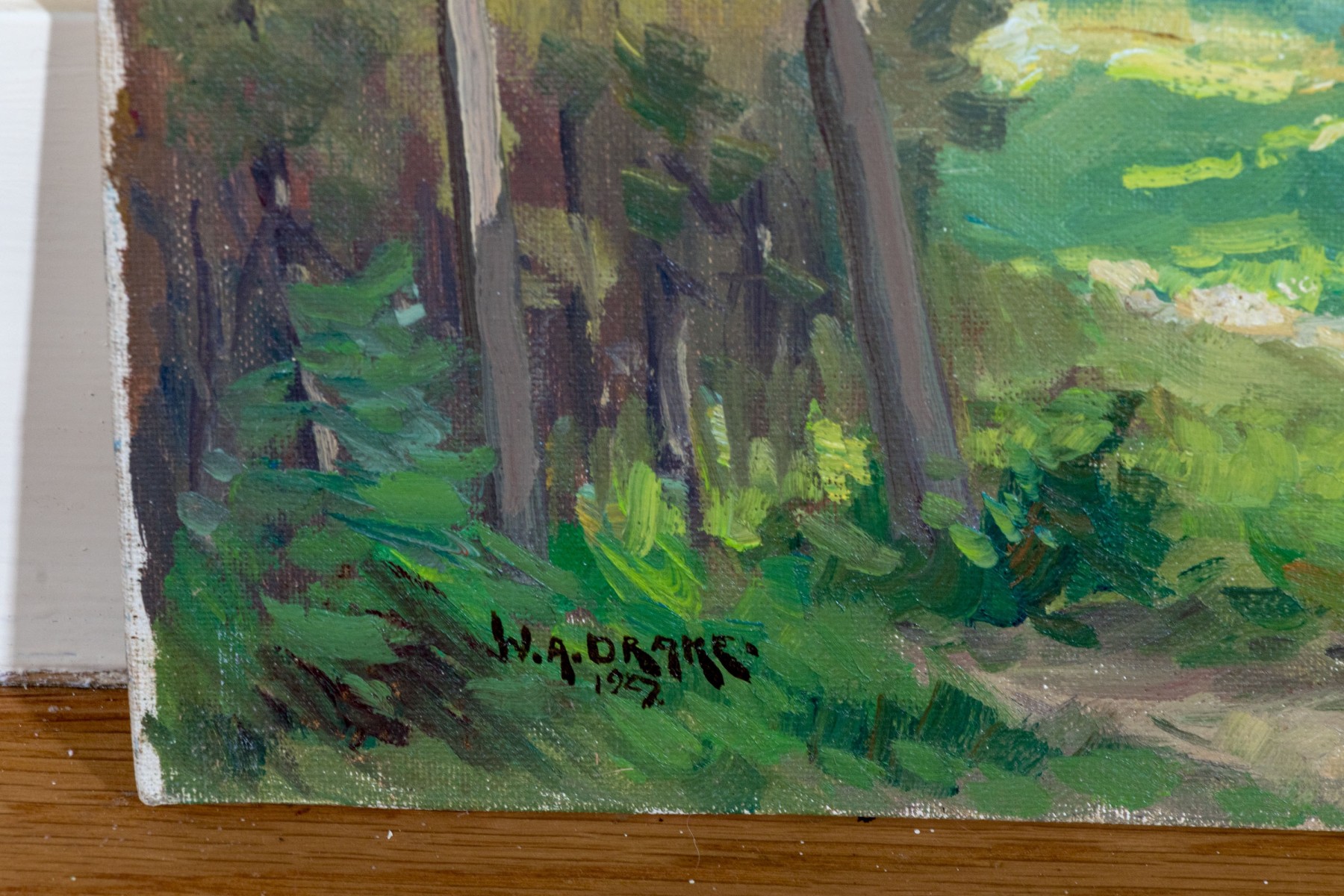 William A. Drake (American, 1891-1979) oil painting on canvas panel depicting a forest landscape in impressionist plein air style, rendered with gestural dabs of vibrant green, sand, and blue across tall trees flanking a narrow dirt path leading to a clear sky in the background. Signed and dated lower left and on the verso. Presented unframed.