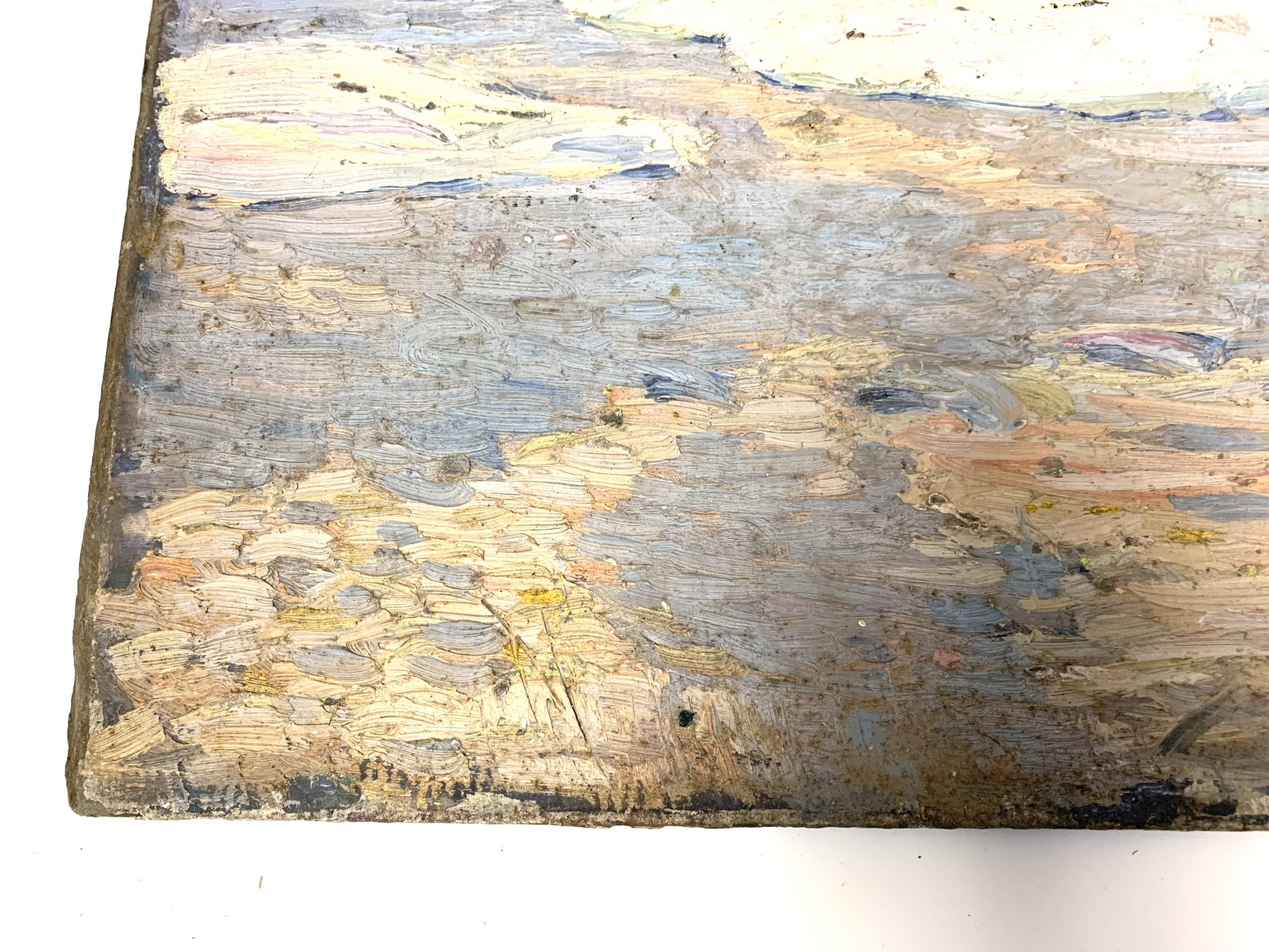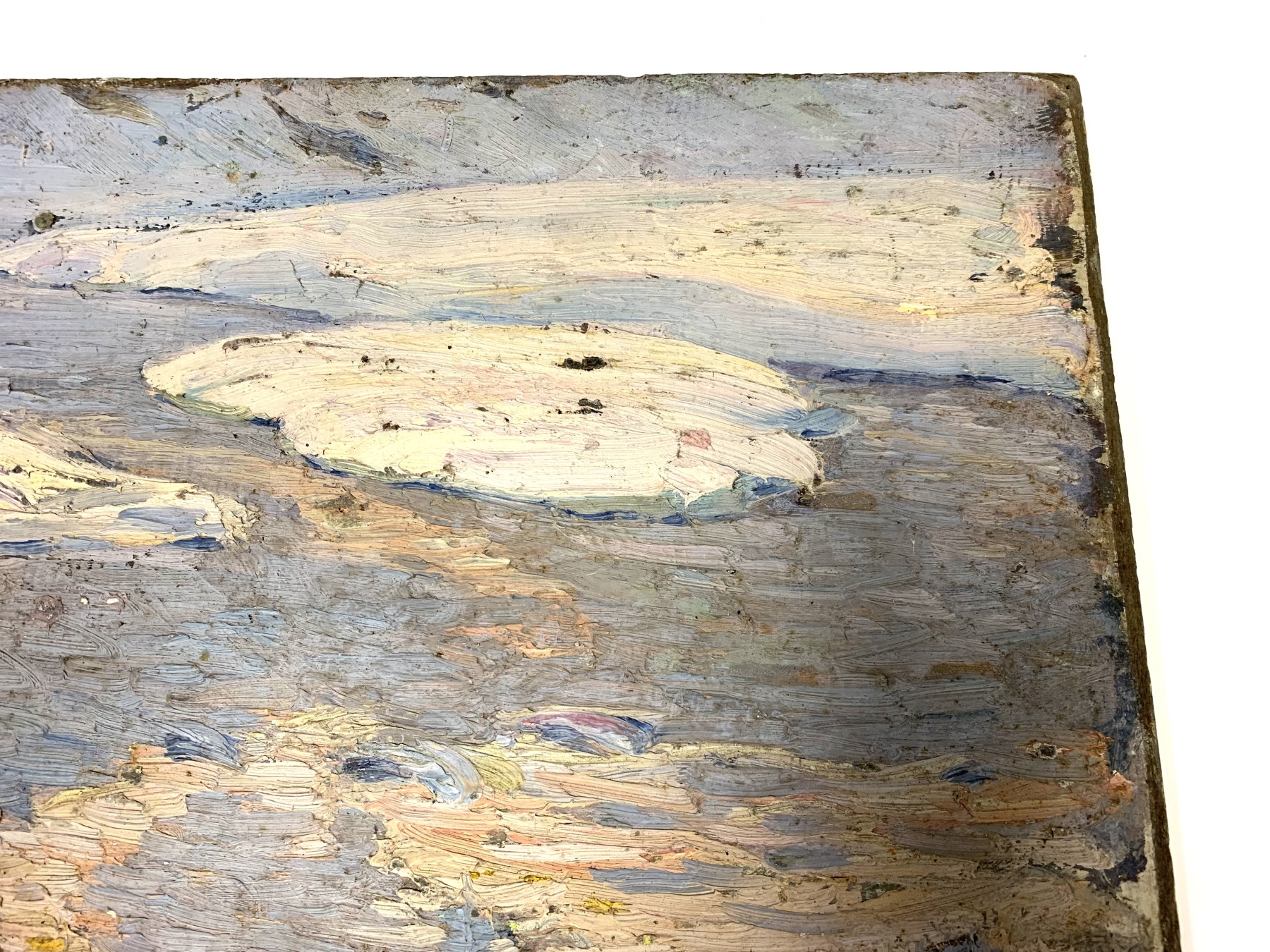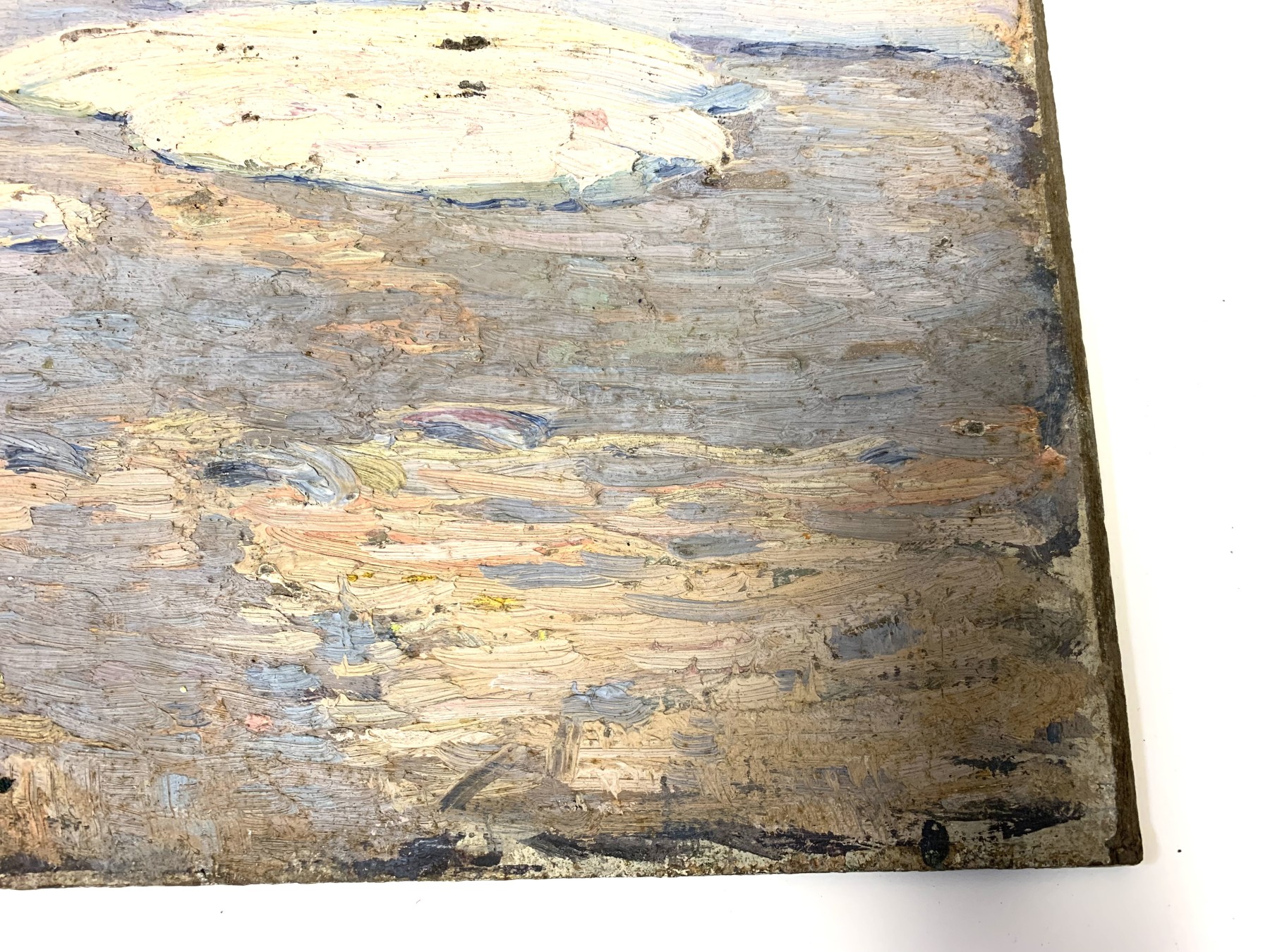 Condition: Wear including losses to the painted finish and board, mostly around the trim. Some stuck on particles from storage. Some stuck on white particles to the lower right quarter. Three tiny holes on edges from hanging. See lot images for further visual inspection as they are considered part of the lot condition report. The back with a previous unfinished work.