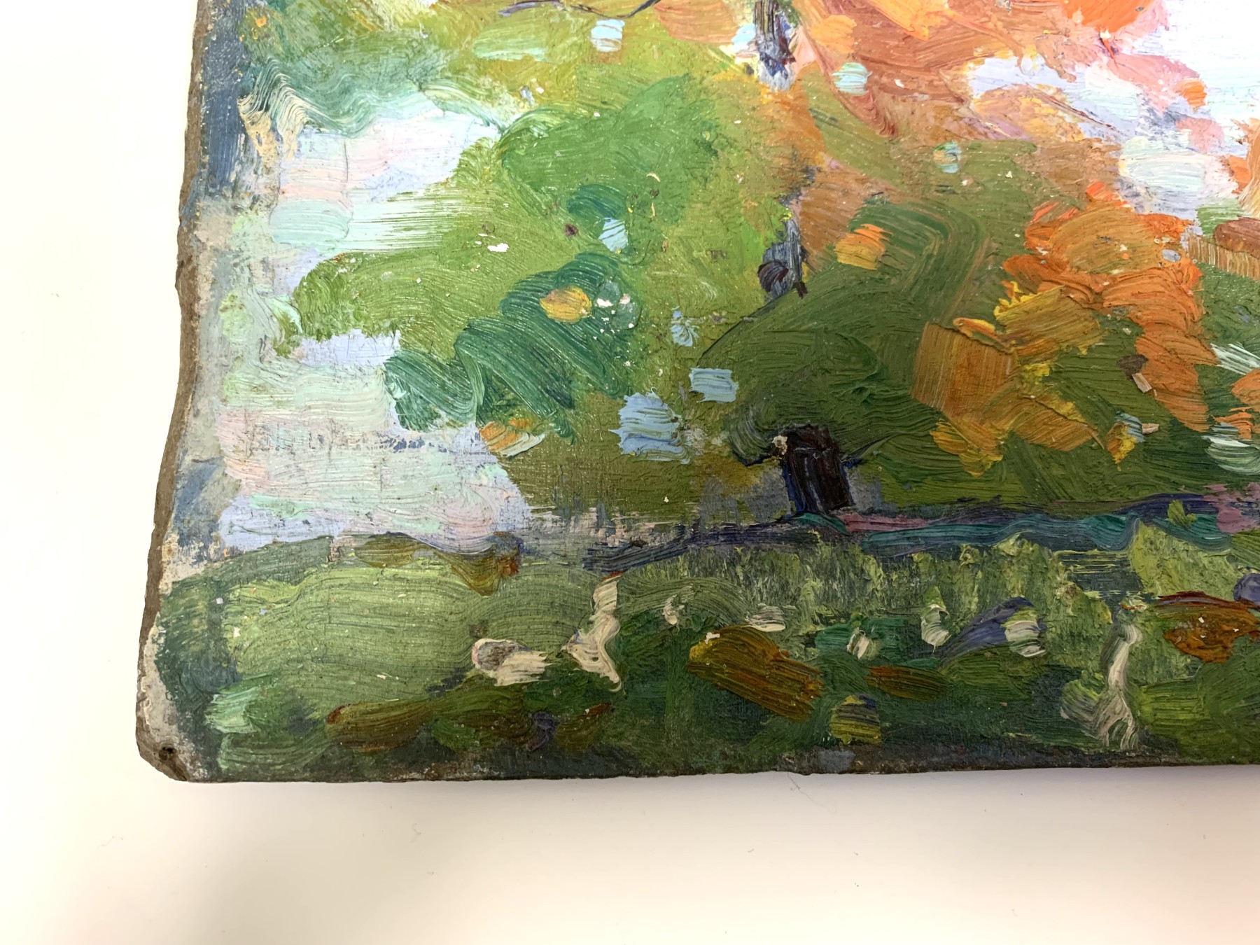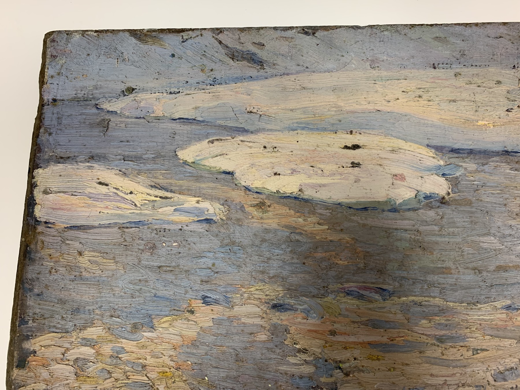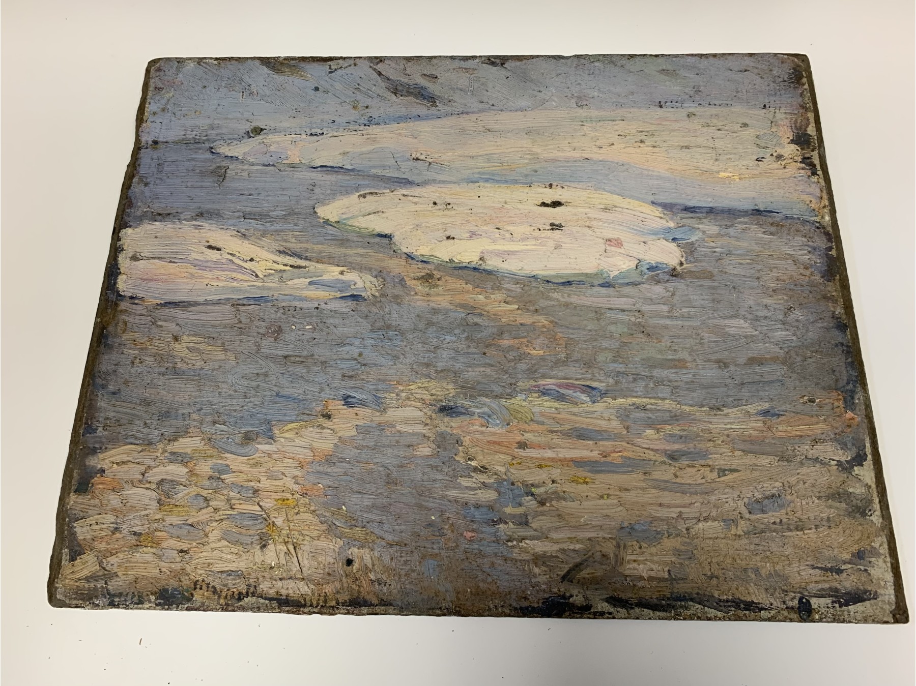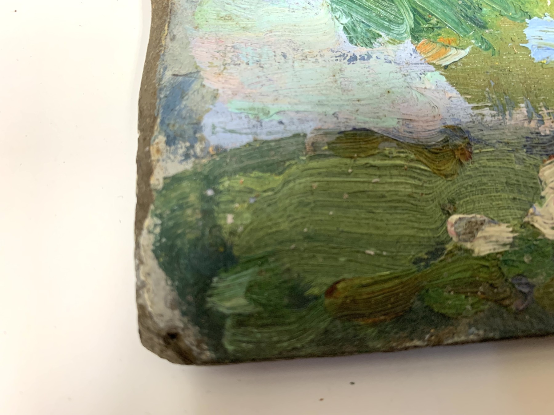 Condition: Wear including losses to the painted finish and board, mostly around the trim. Some stuck on particles from storage. Some stuck on white particles to the lower right quarter. Three tiny holes on edges from hanging. See lot images for further visual inspection as they are considered part of the lot condition report. The back with a previous unfinished work.