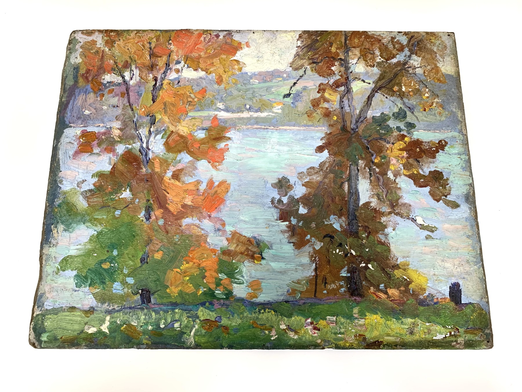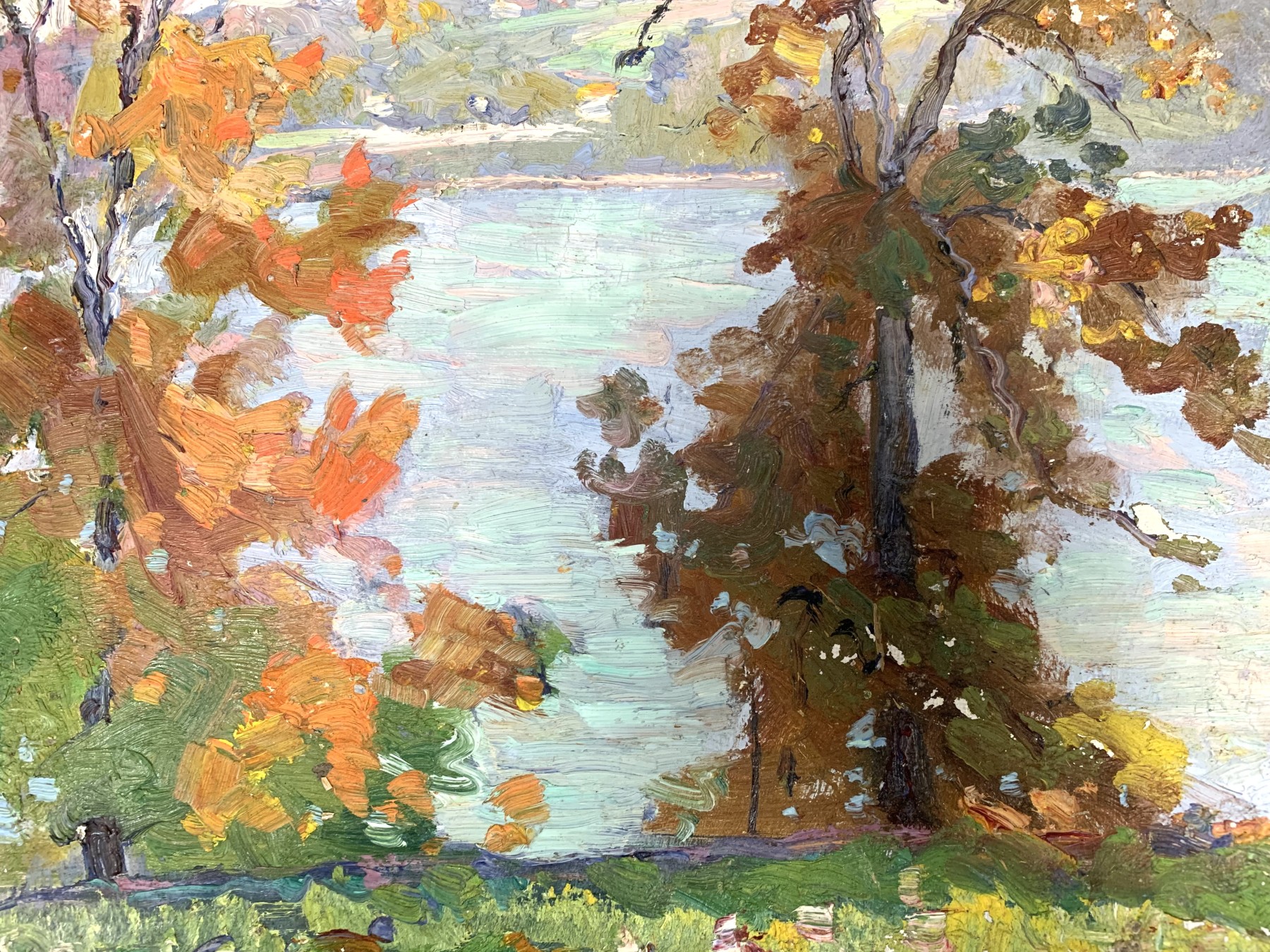 A wonderfully painted impressionistic autumnal landscape with lake.