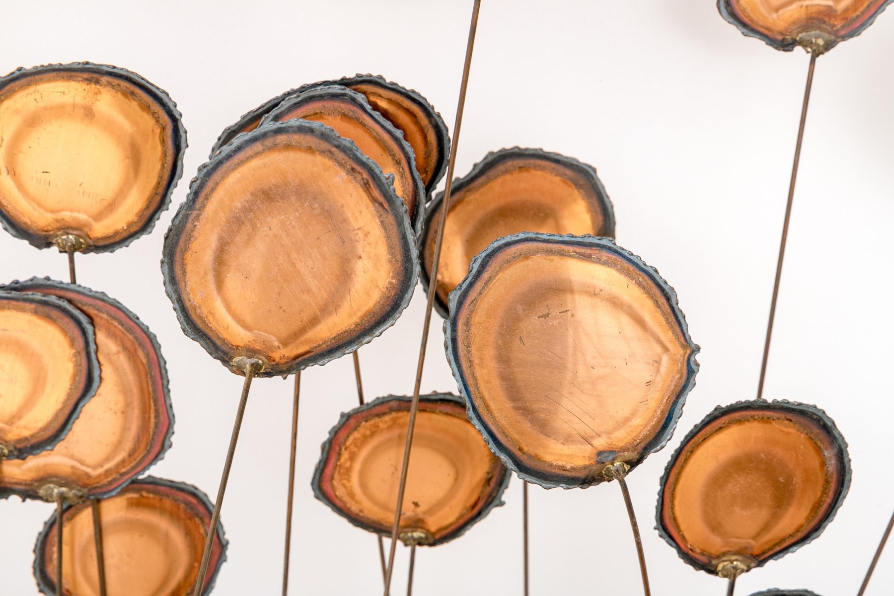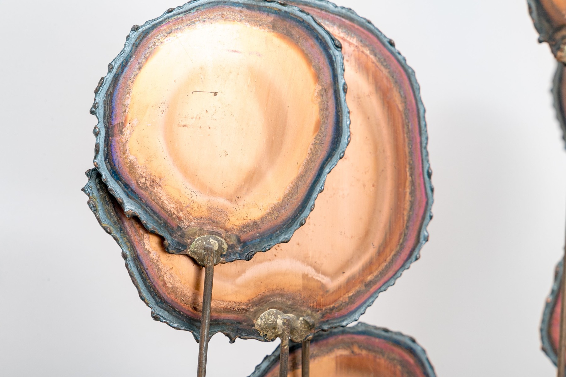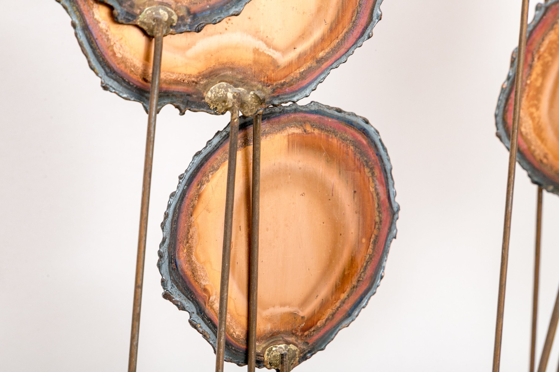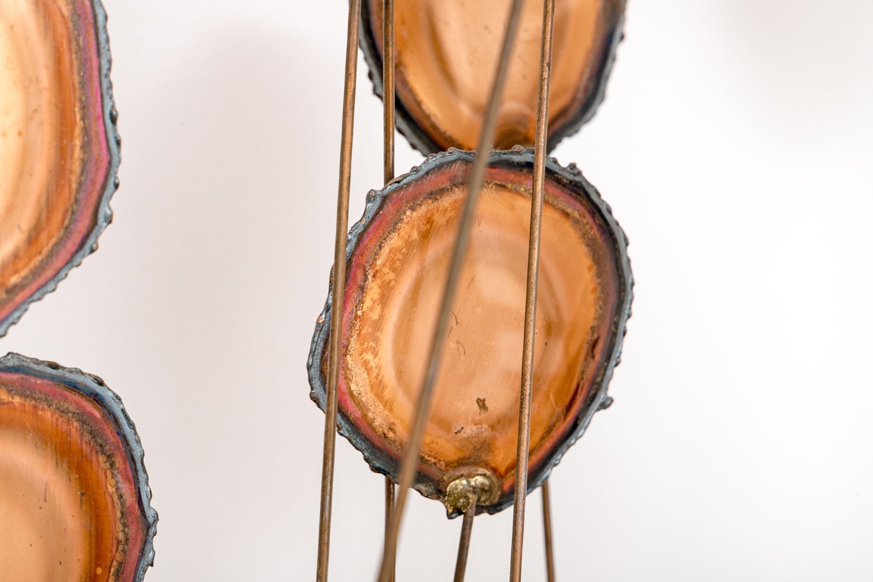 William Bowie (American, 1926-1994) "Peacock Chimes" copper and steel sculpture with bronze accents peacock patterned medallions with naturalistic ringed details on narrow dowels supported by a textural base reminiscent of blades of grass. Signed on the base.