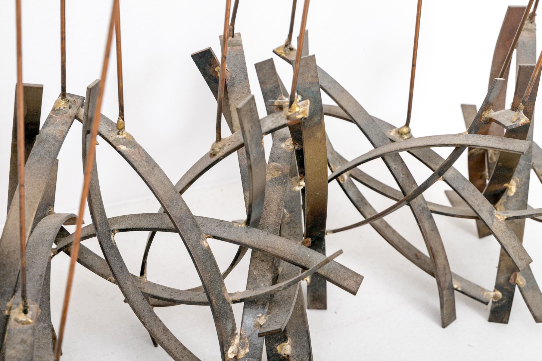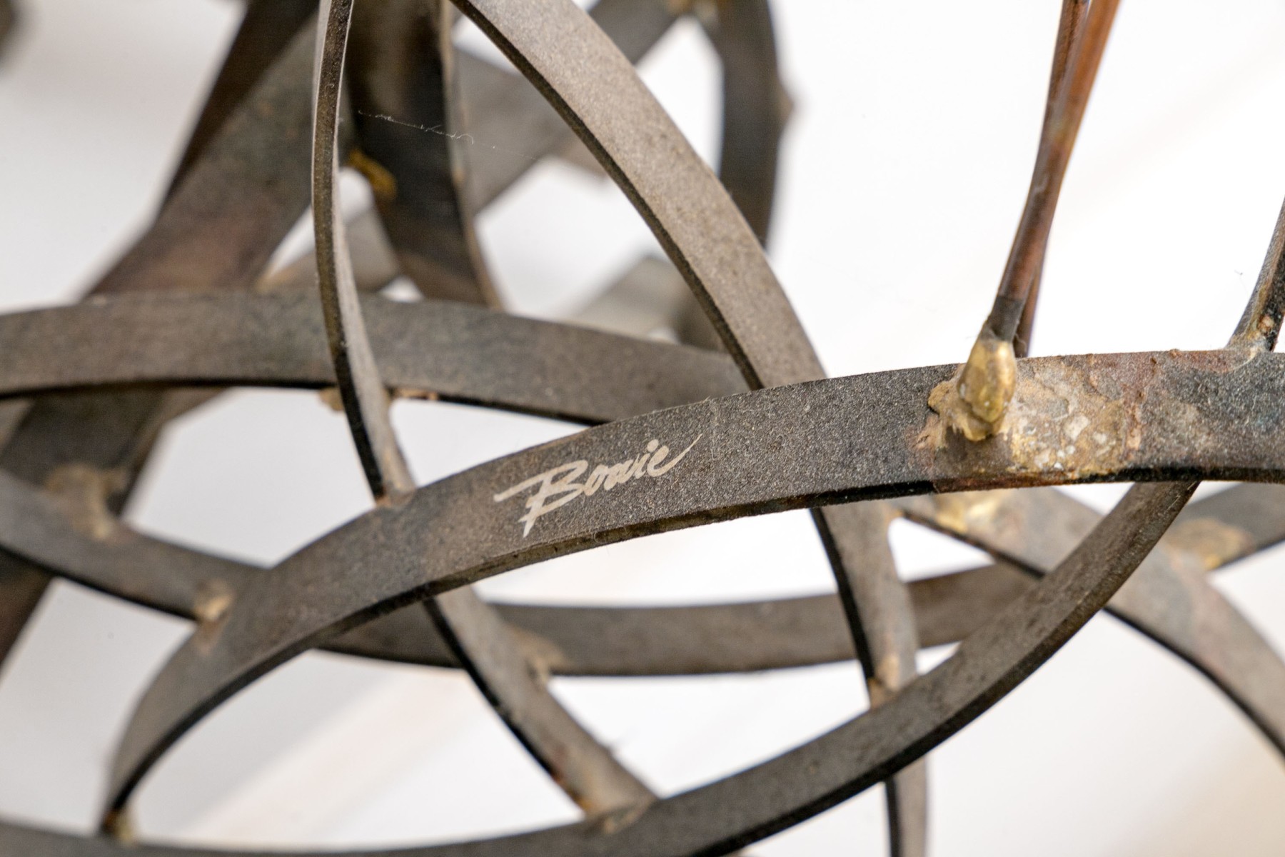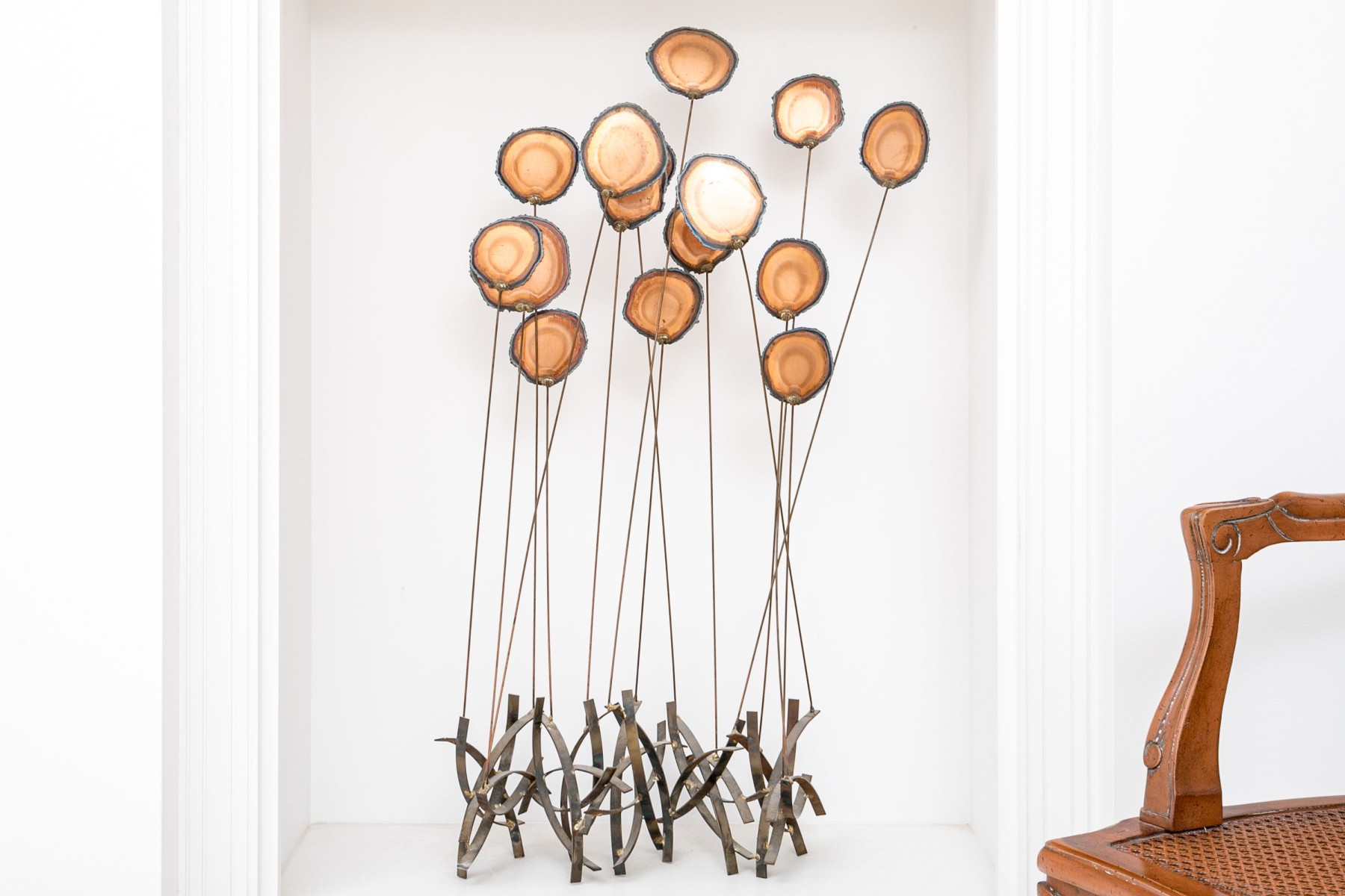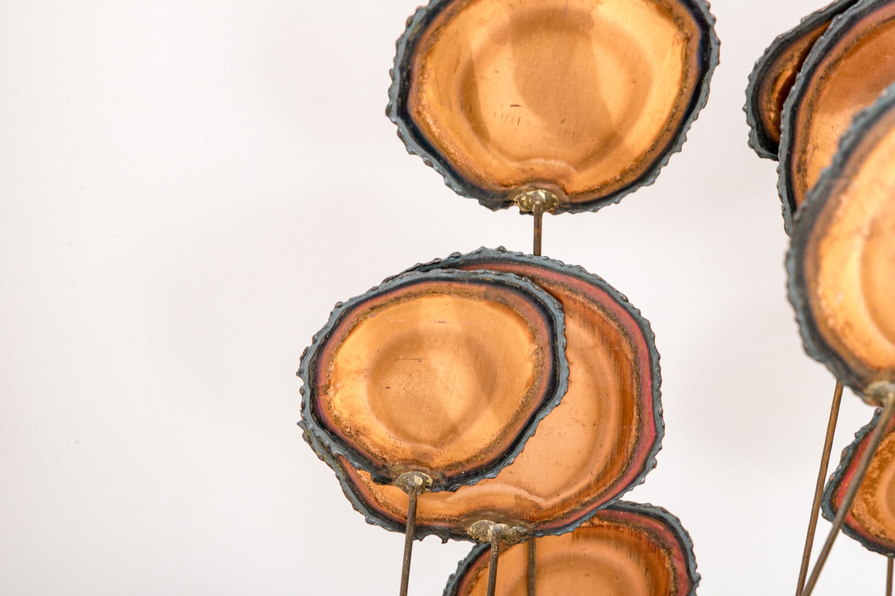William Bowie (American, 1926-1994) "Peacock Chimes" copper and steel sculpture with bronze accents peacock patterned medallions with naturalistic ringed details on narrow dowels supported by a textural base reminiscent of blades of grass. Signed on the base.