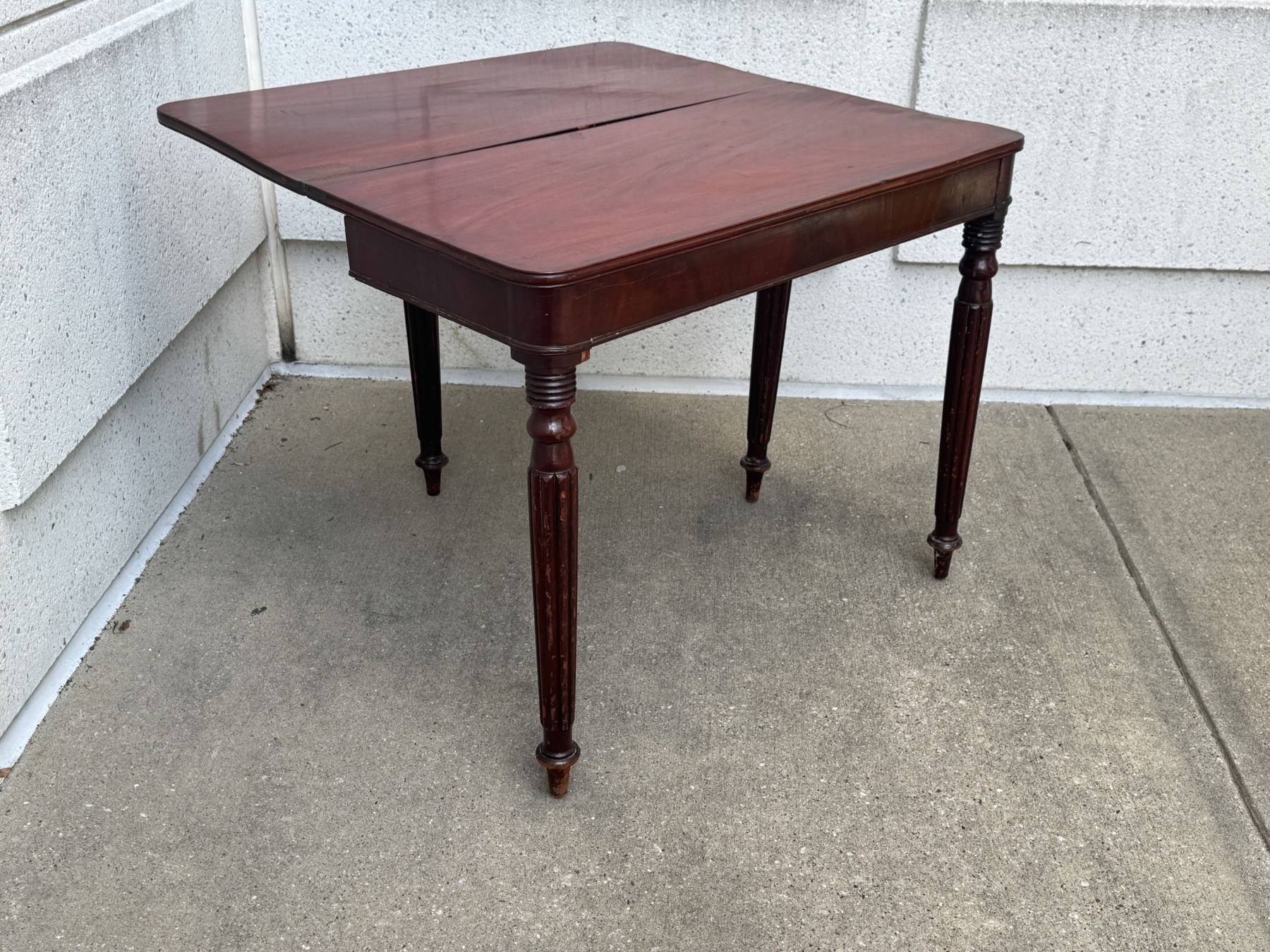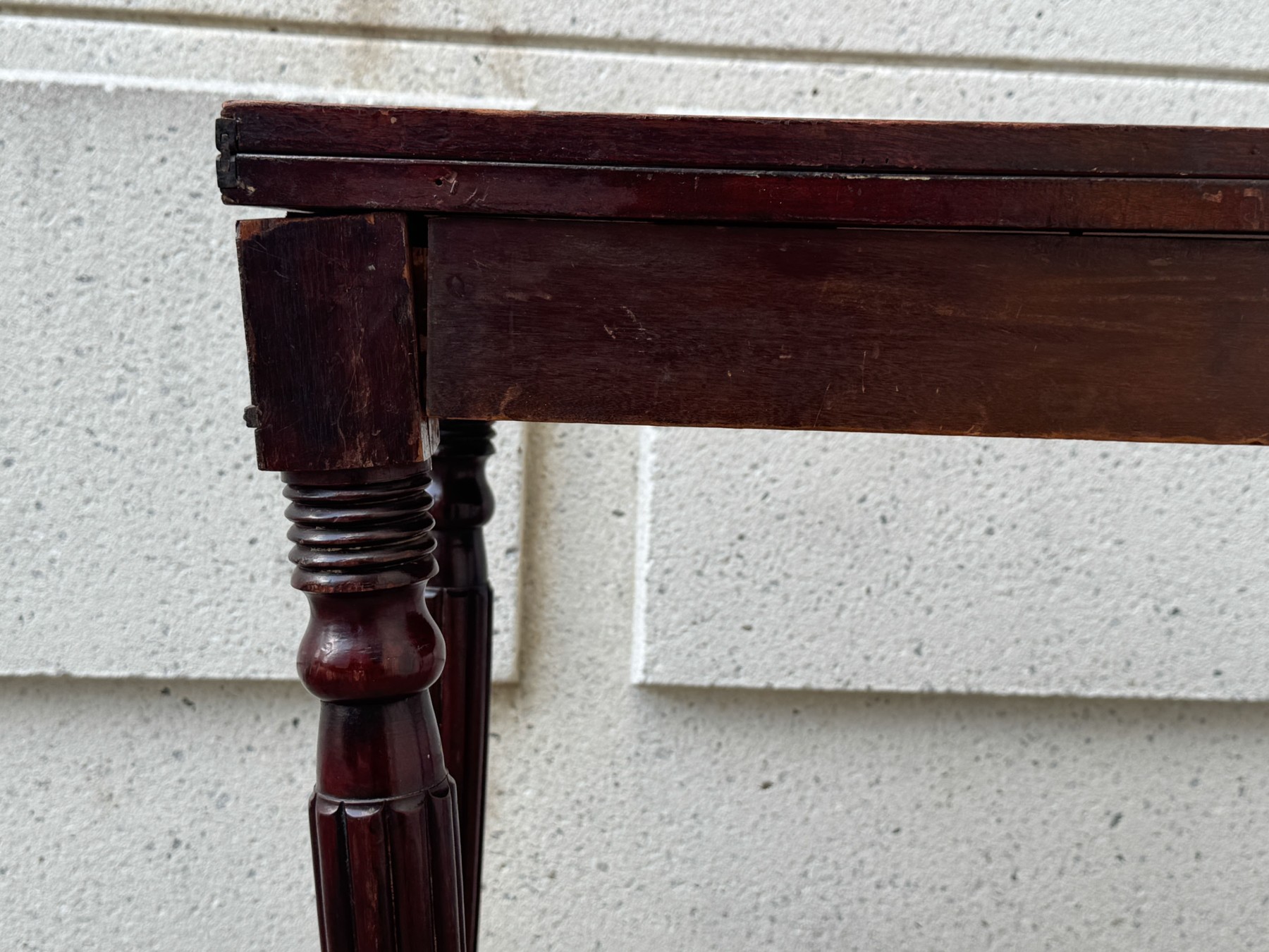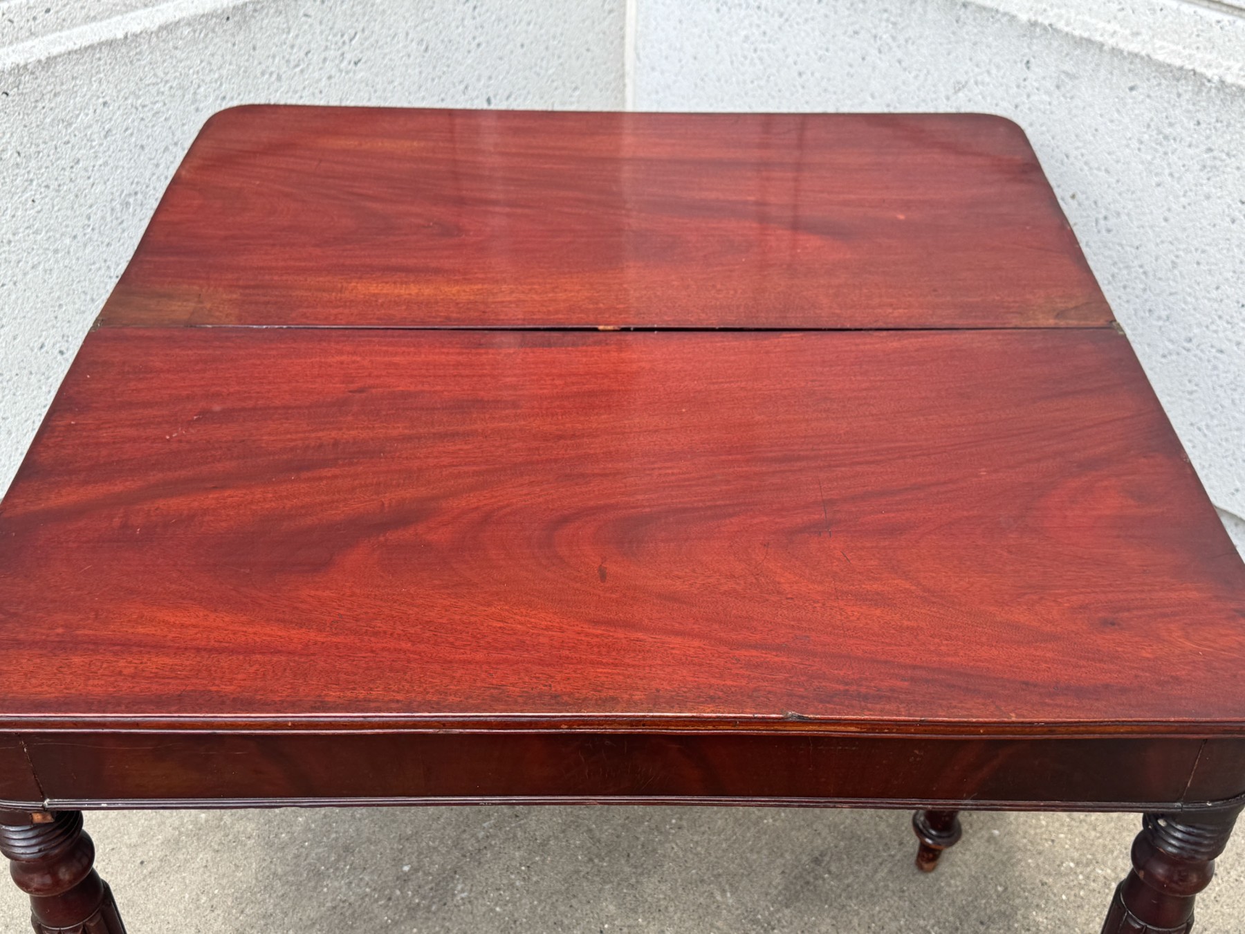 A classic games table veneered in gorgeous red-brown mahogany, showcasing a rectangular hinged flip top with rounded corners raised over a nicely figured, straight apron. Supported by beautifully turned and gadrooned baluster legs for an elegant finish. The back left leg hinges out to support the flip top.