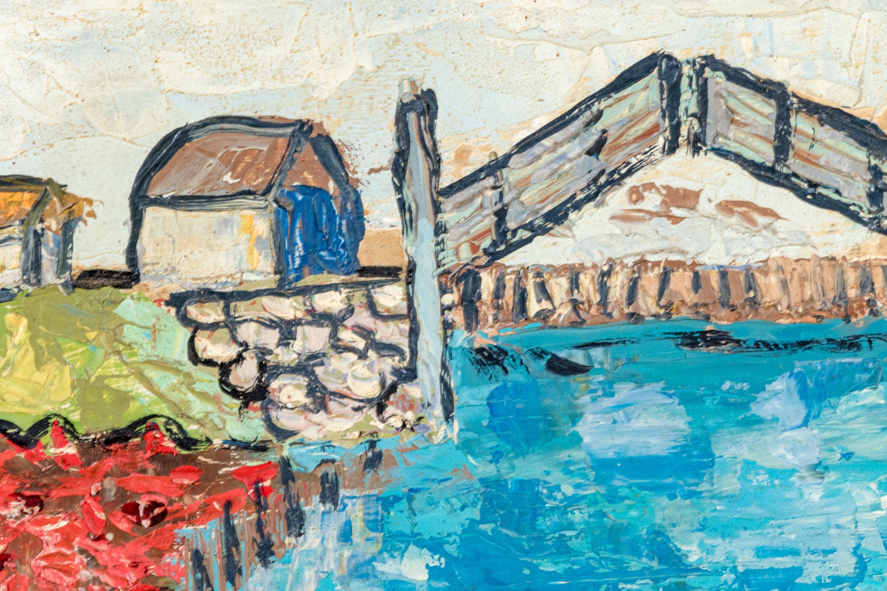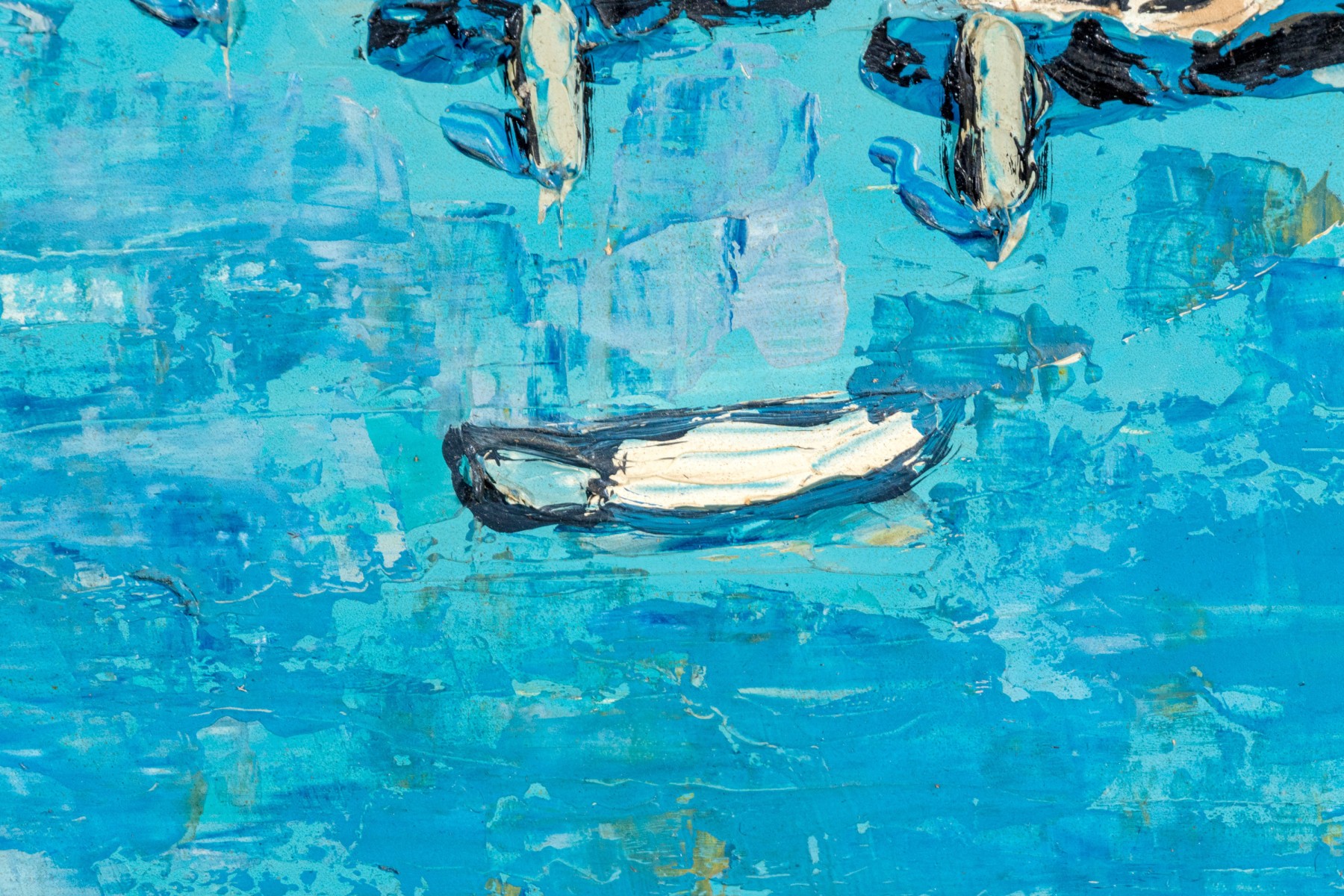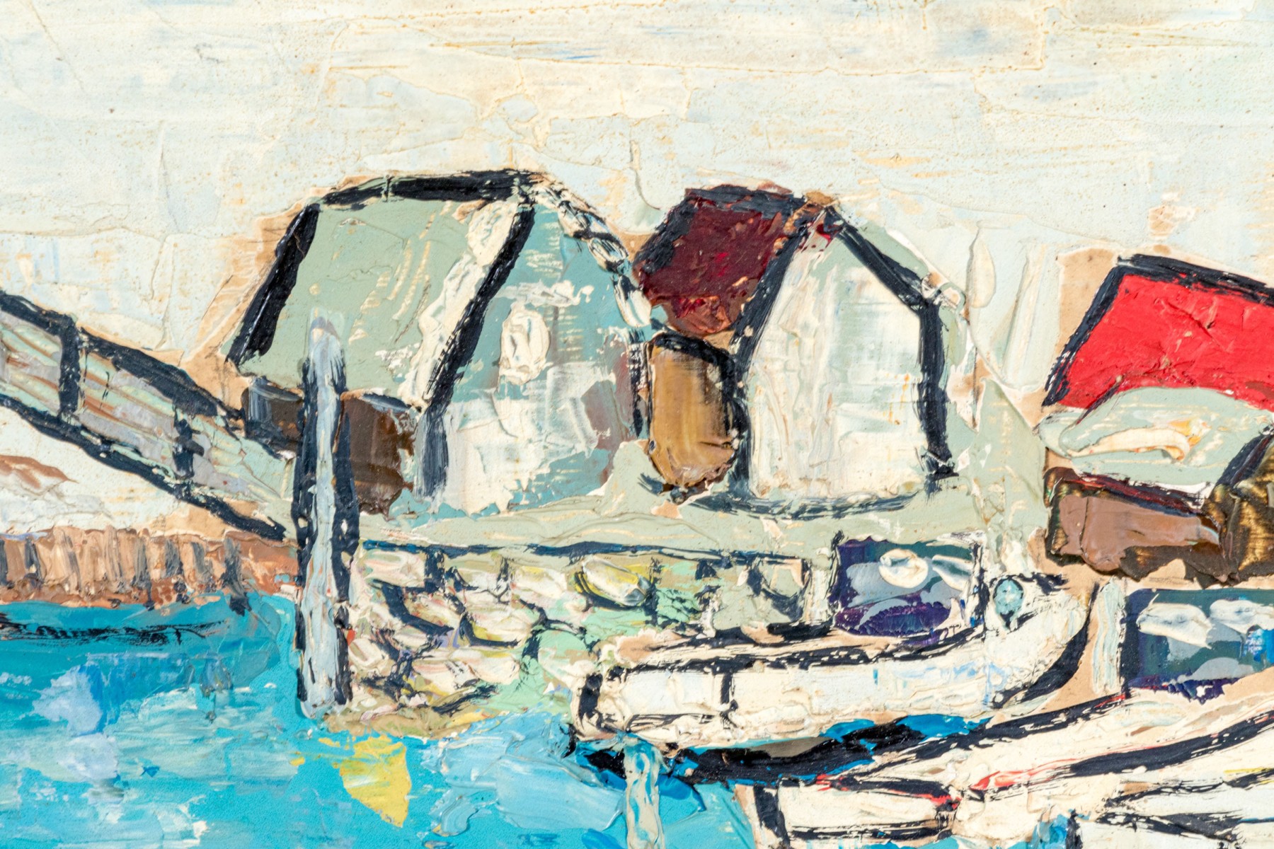 Brightly colored palette, with boats in a harbor tied off at the dock. Painted with impasto for a wonderful textural effect.