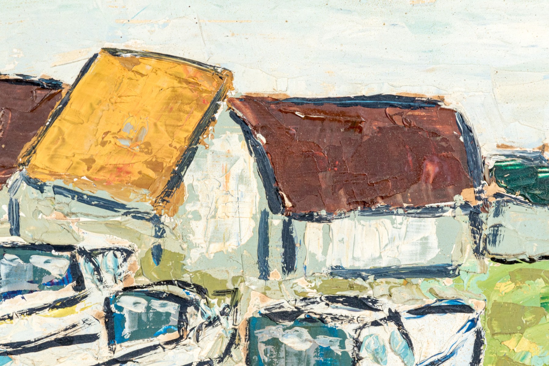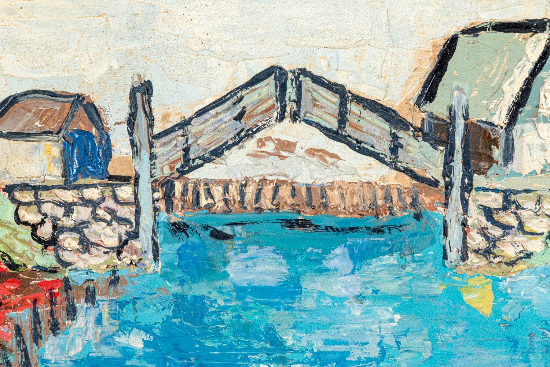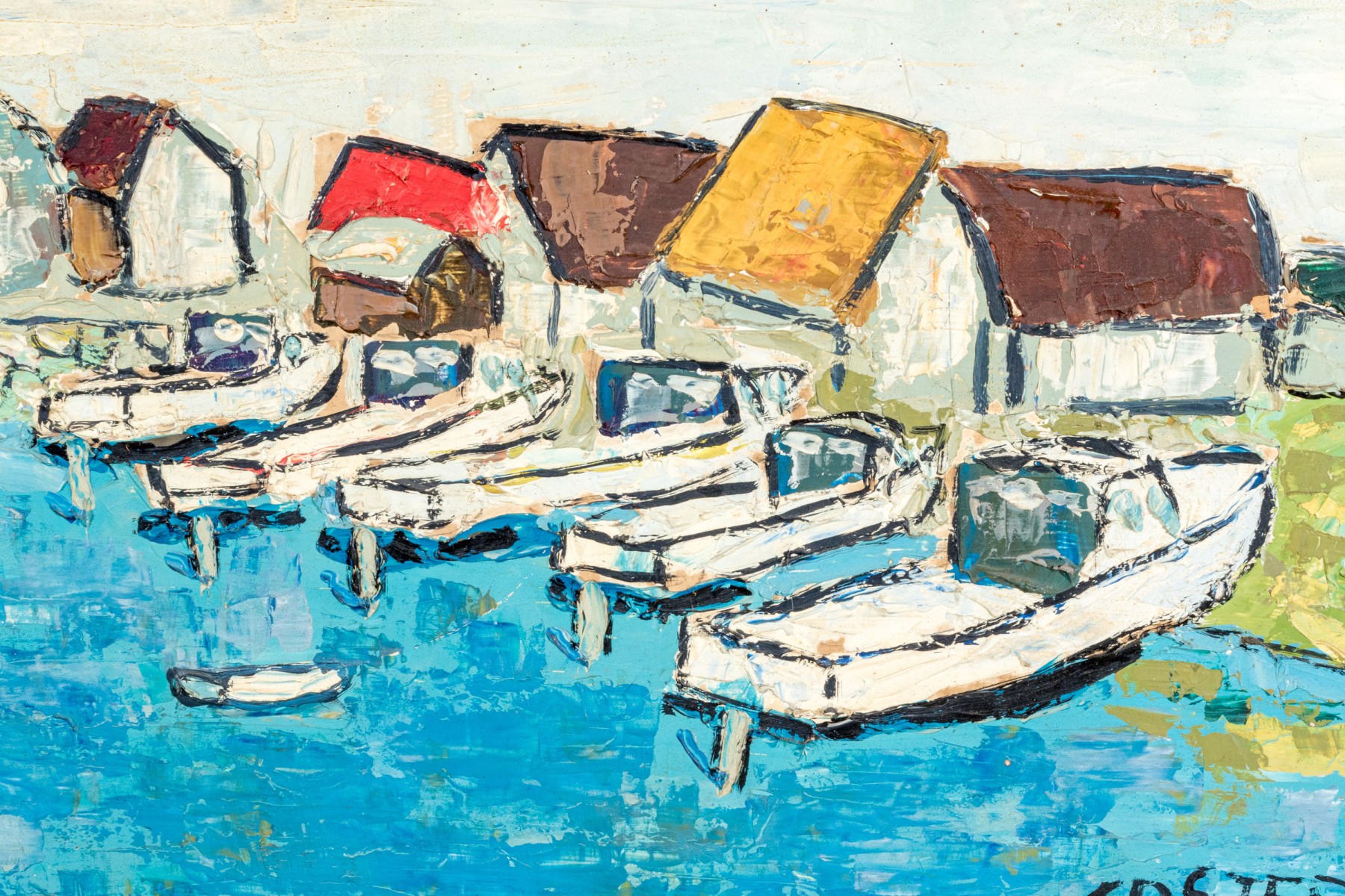 Brightly colored palette, with boats in a harbor tied off at the dock. Painted with impasto for a wonderful textural effect.