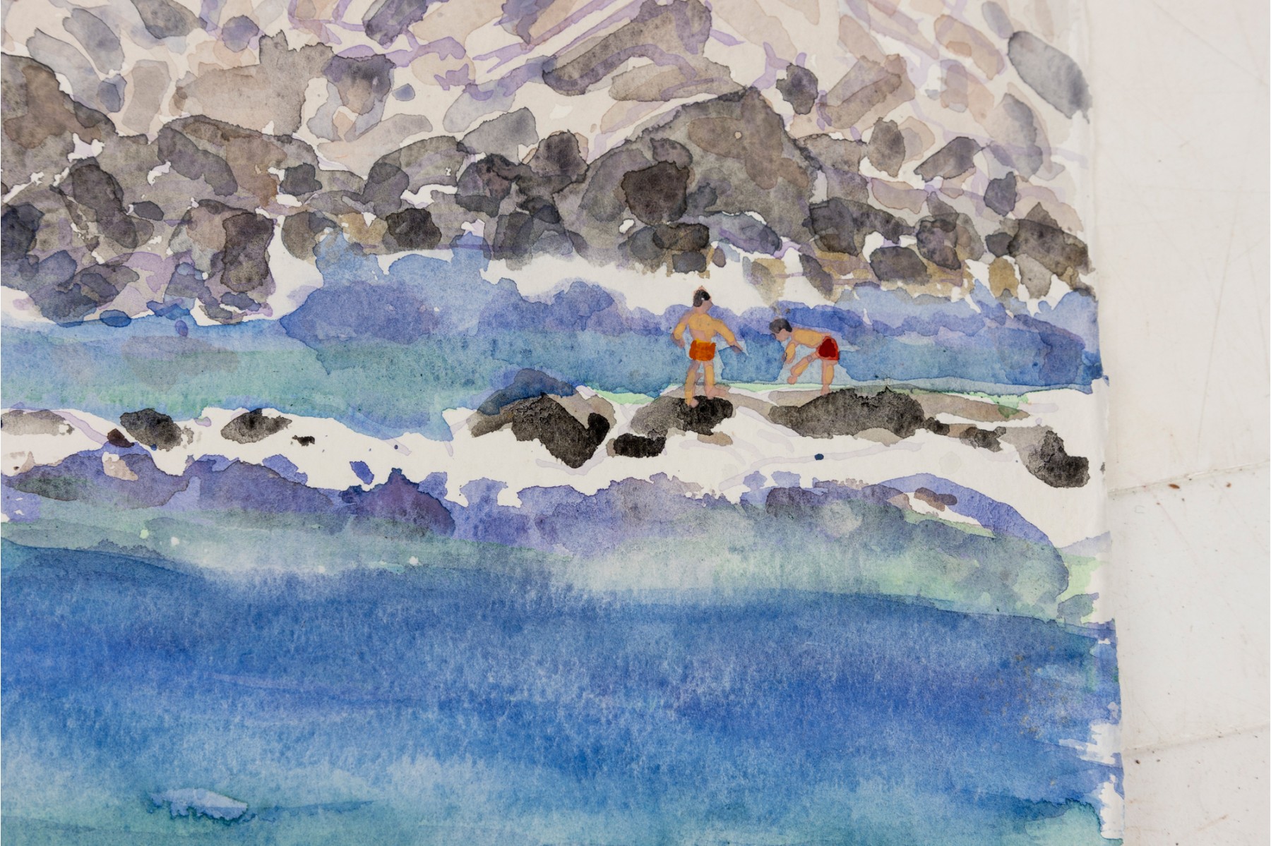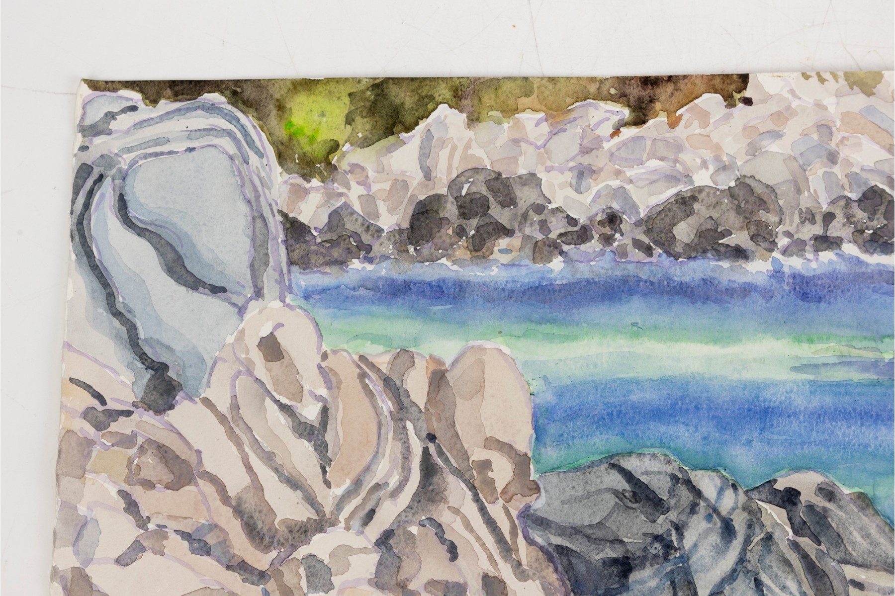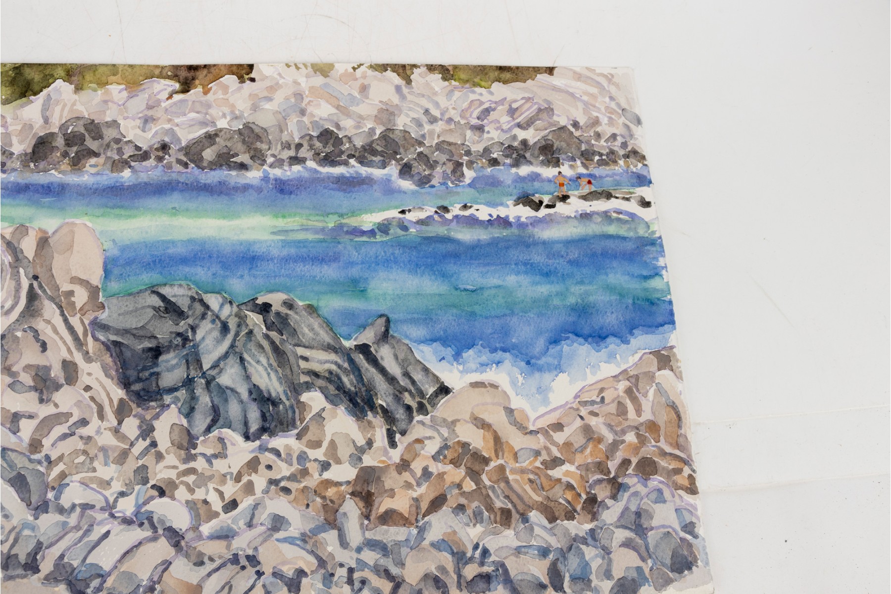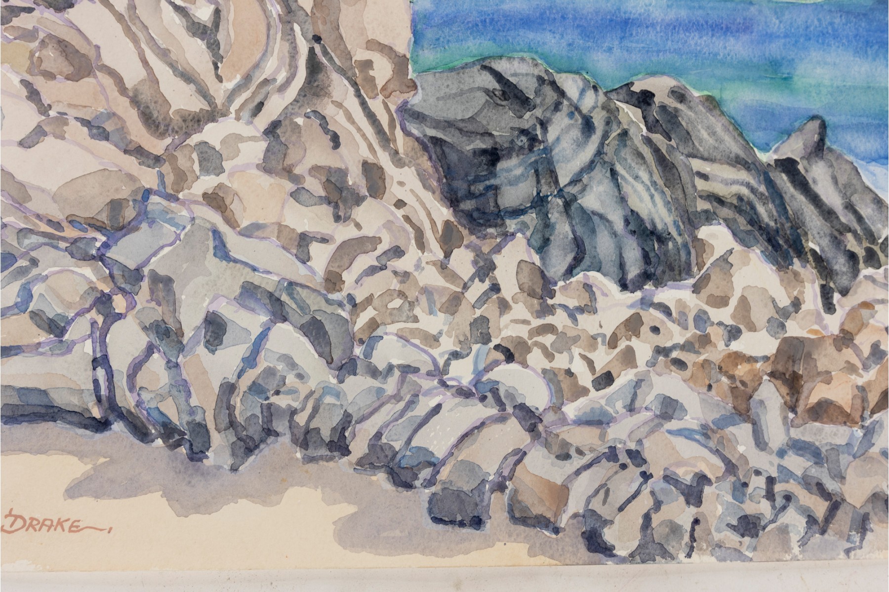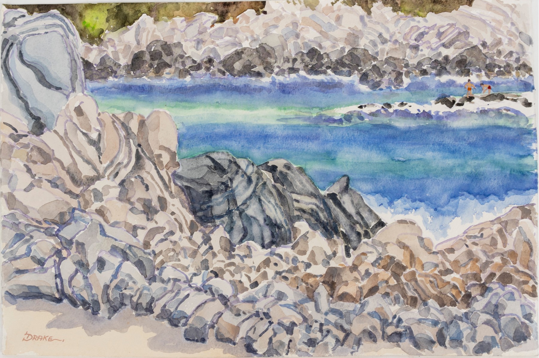 Watercolor on paper depicting multi-colored rocks framing the blue and green waters of Puerto Angelito Beach in Puerto Escondido, Oaxaca, Mexico.