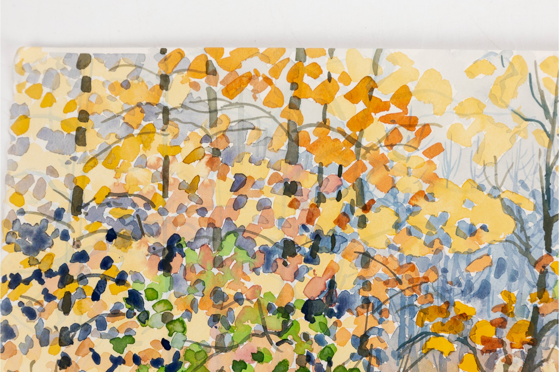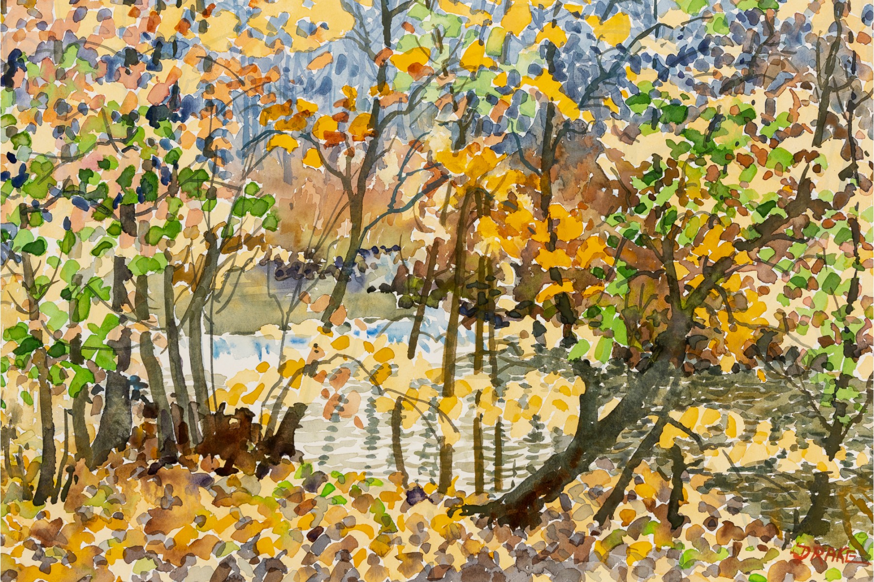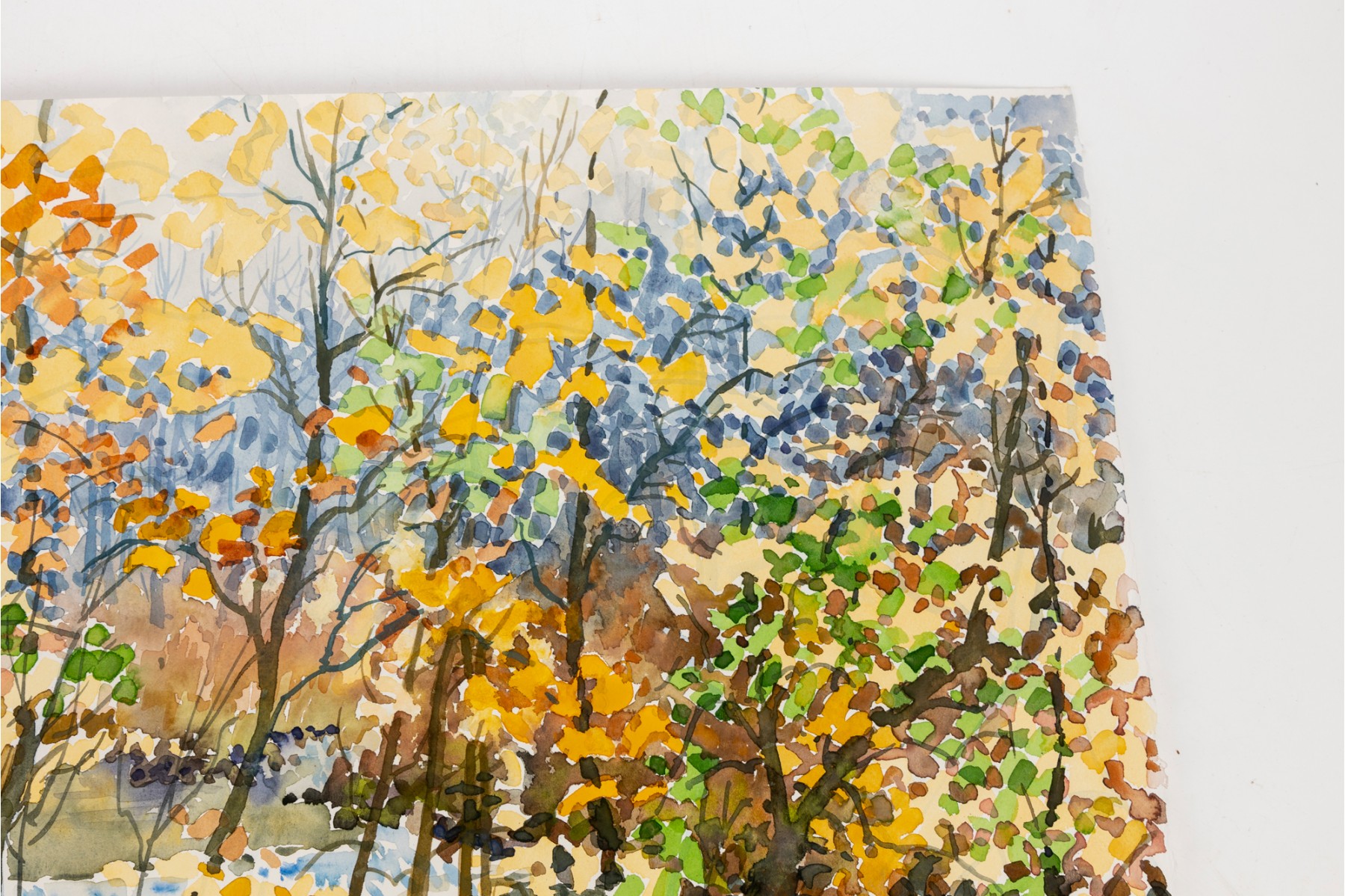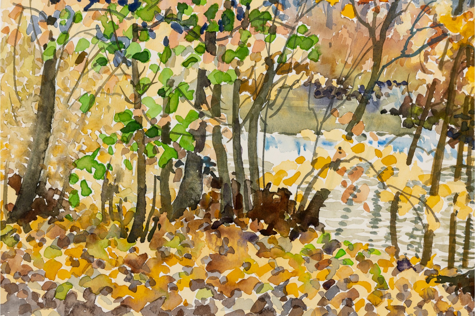 Watercolor on paper depicting an autumnal landscape with colorful trees and a rippling river in the background.