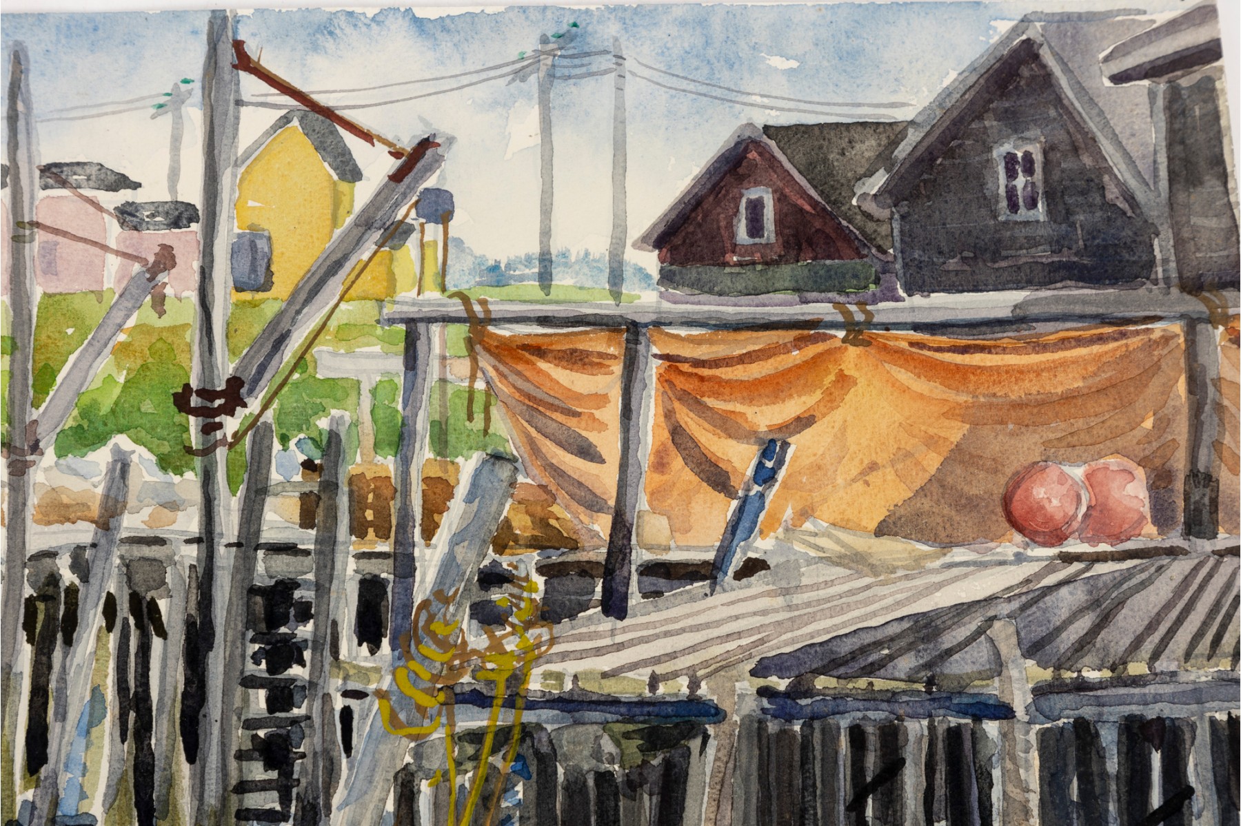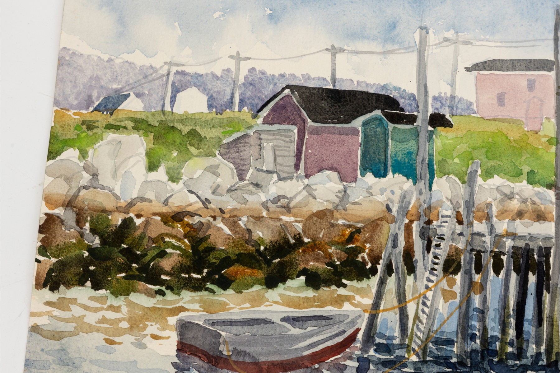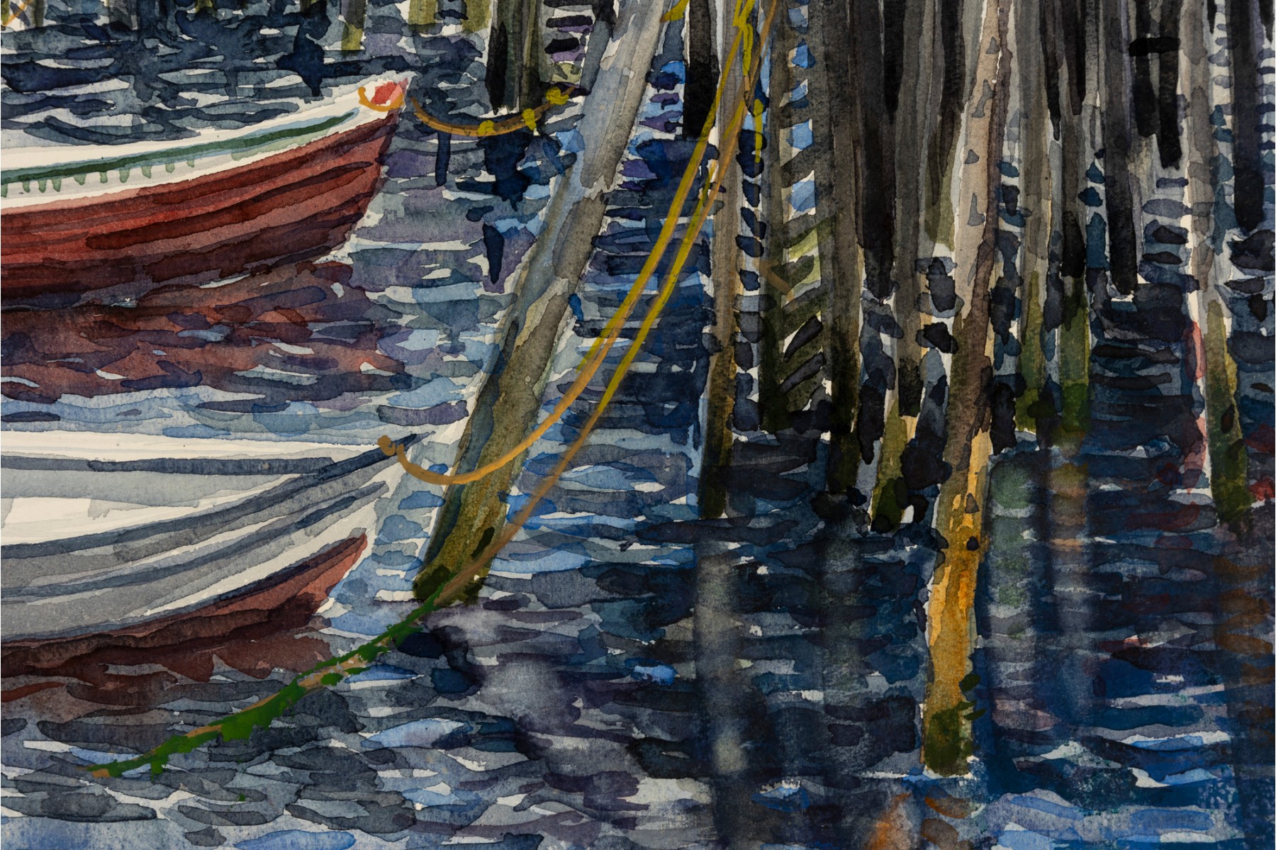 Watercolor on paper depicting colorful motorboats tied to the wharf and casting their reflections onto the choppy waters. Pastel colored structures off in the distance and telephone poles crossing the horizon.