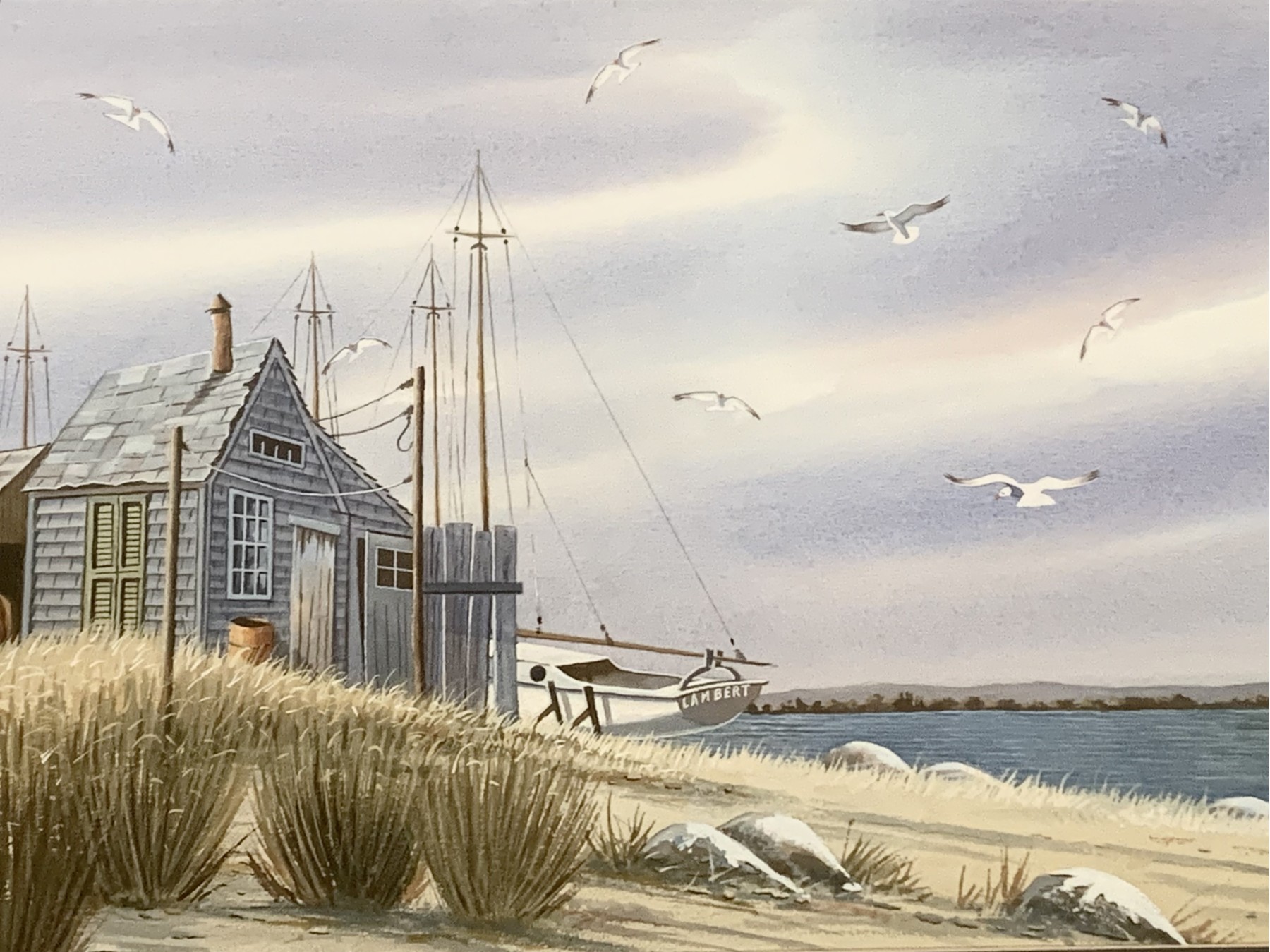 Watercolor depicting a coastal scene with grasses and sandy beach in the foreground, a blue structure to the left, water to the right and the pastel sky filled with seagulls.