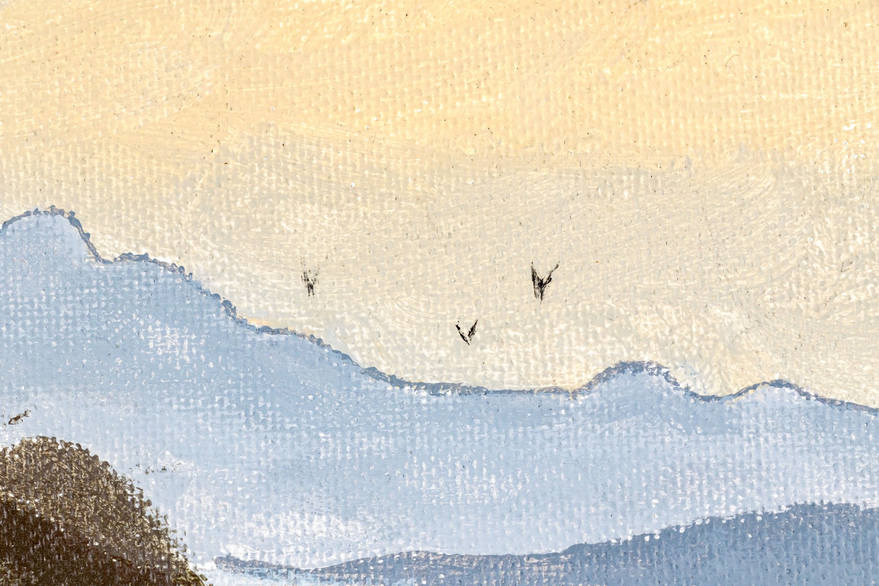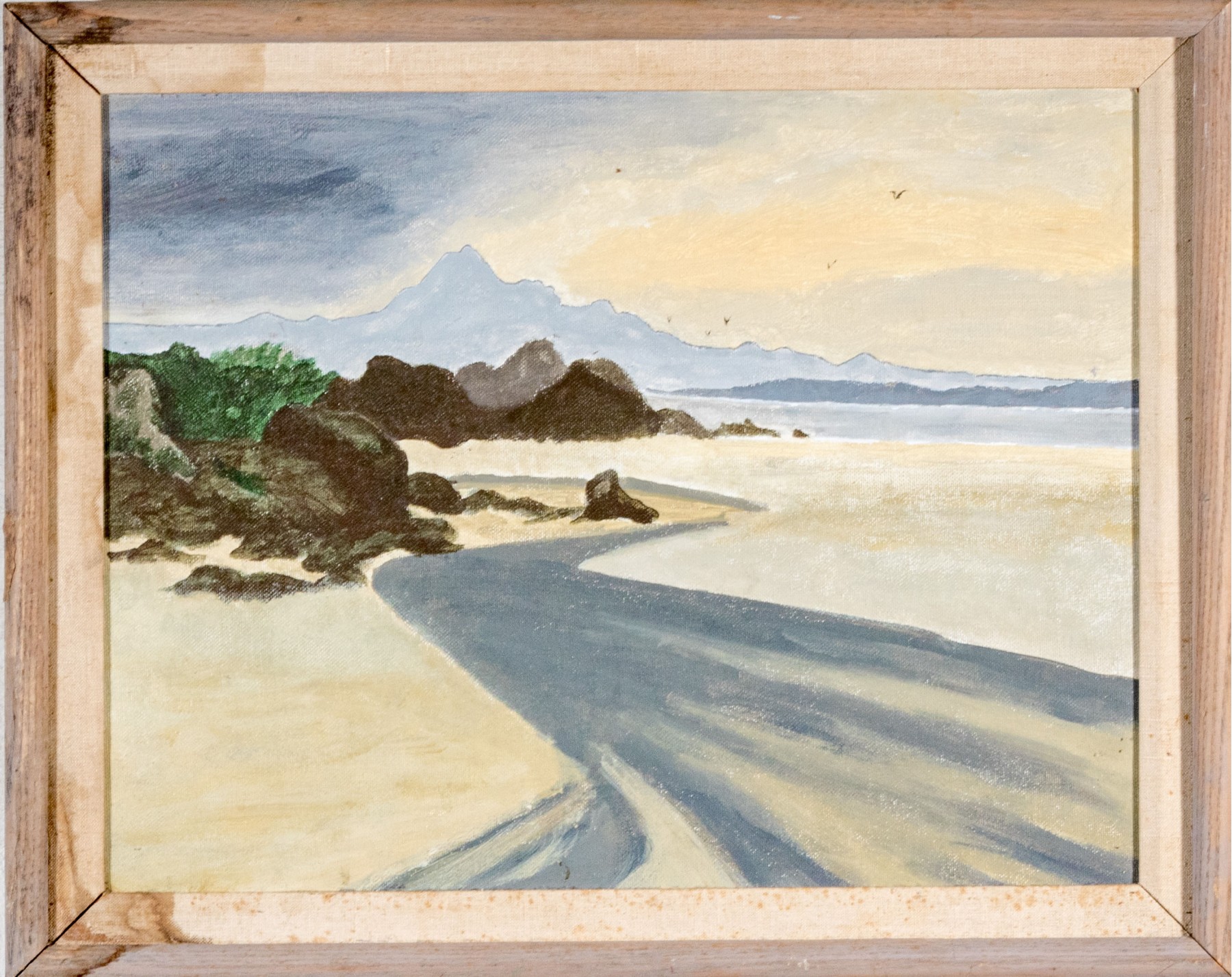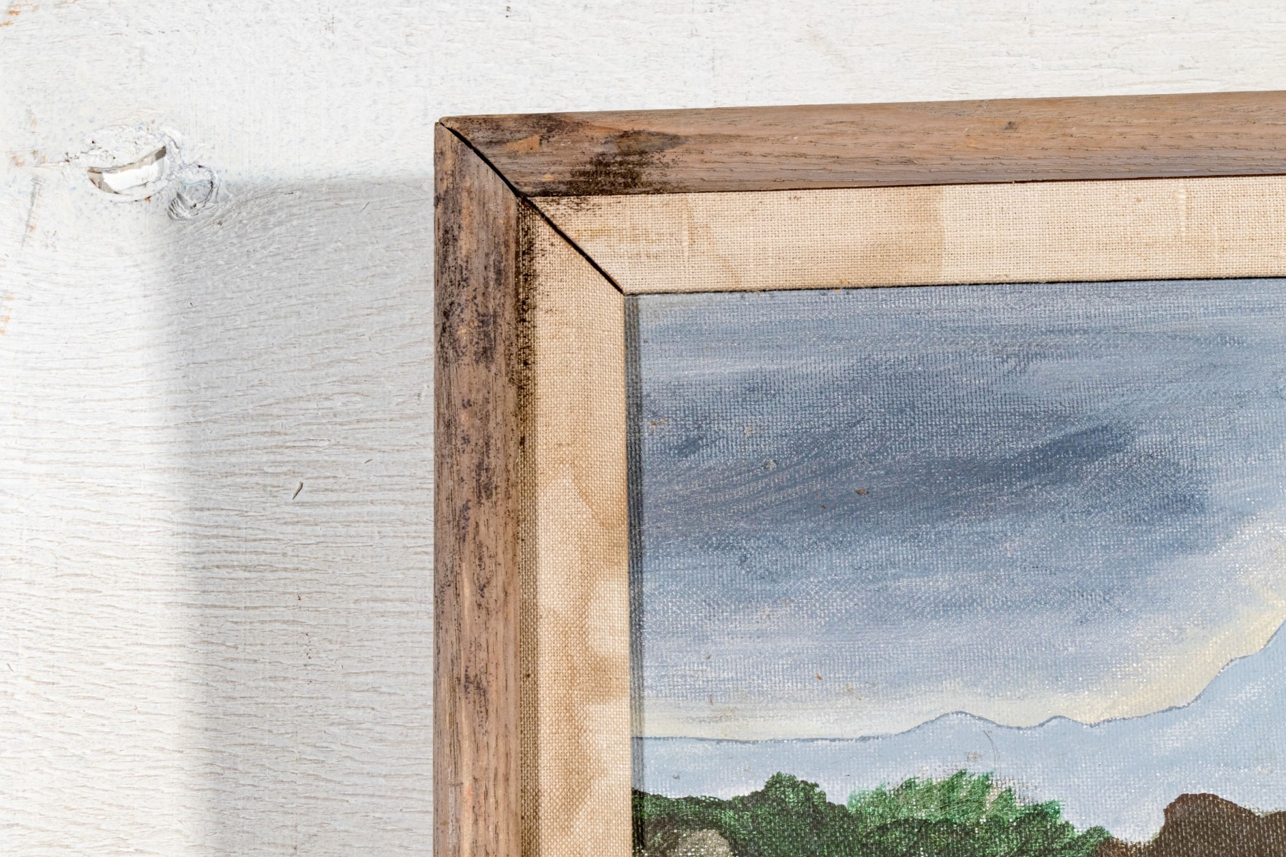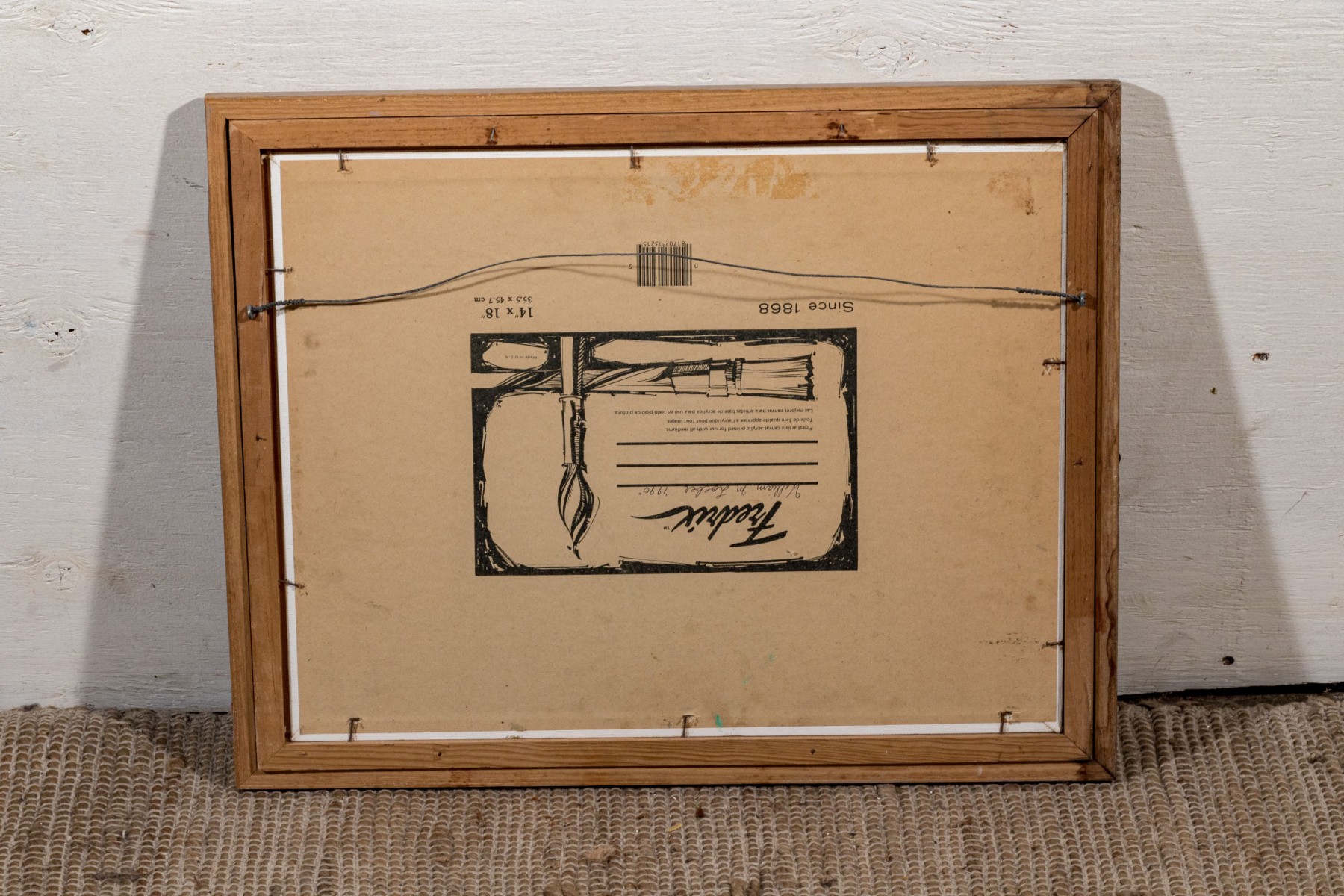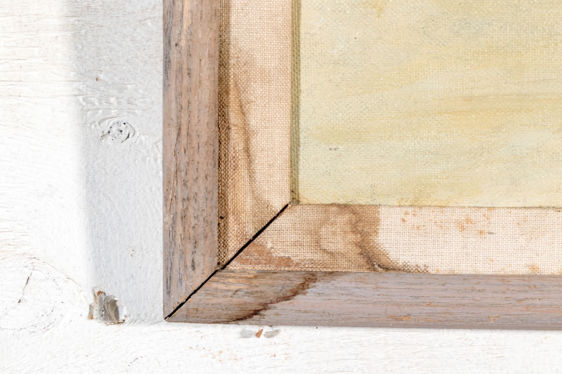 Stains to mat, staining to lower left corner of painting, heavy wear to the frame which is loose and should be re fitted to the work.
