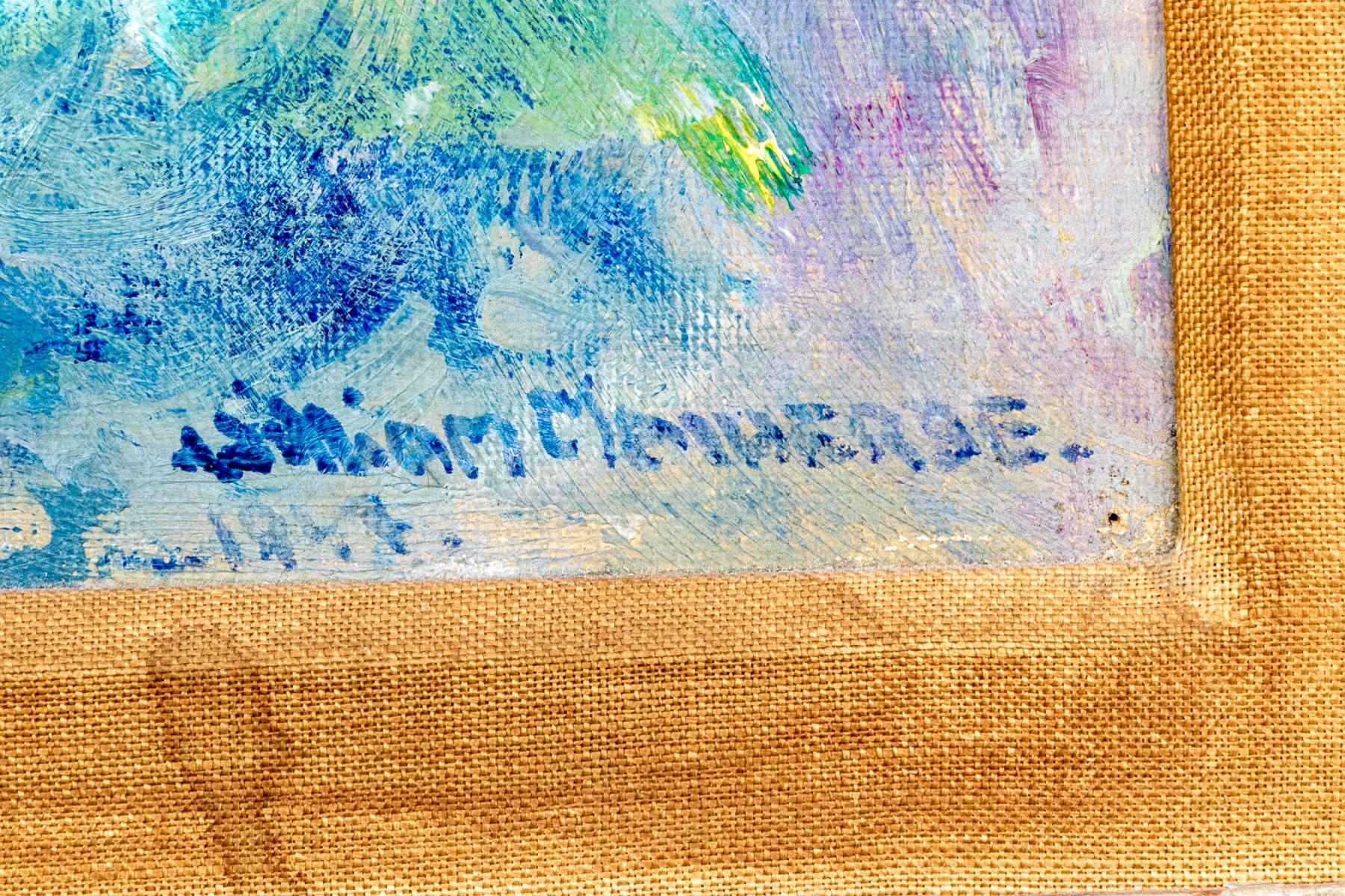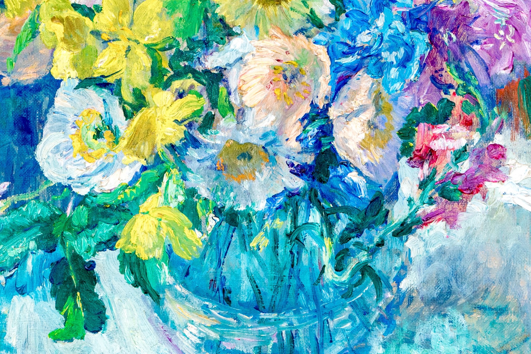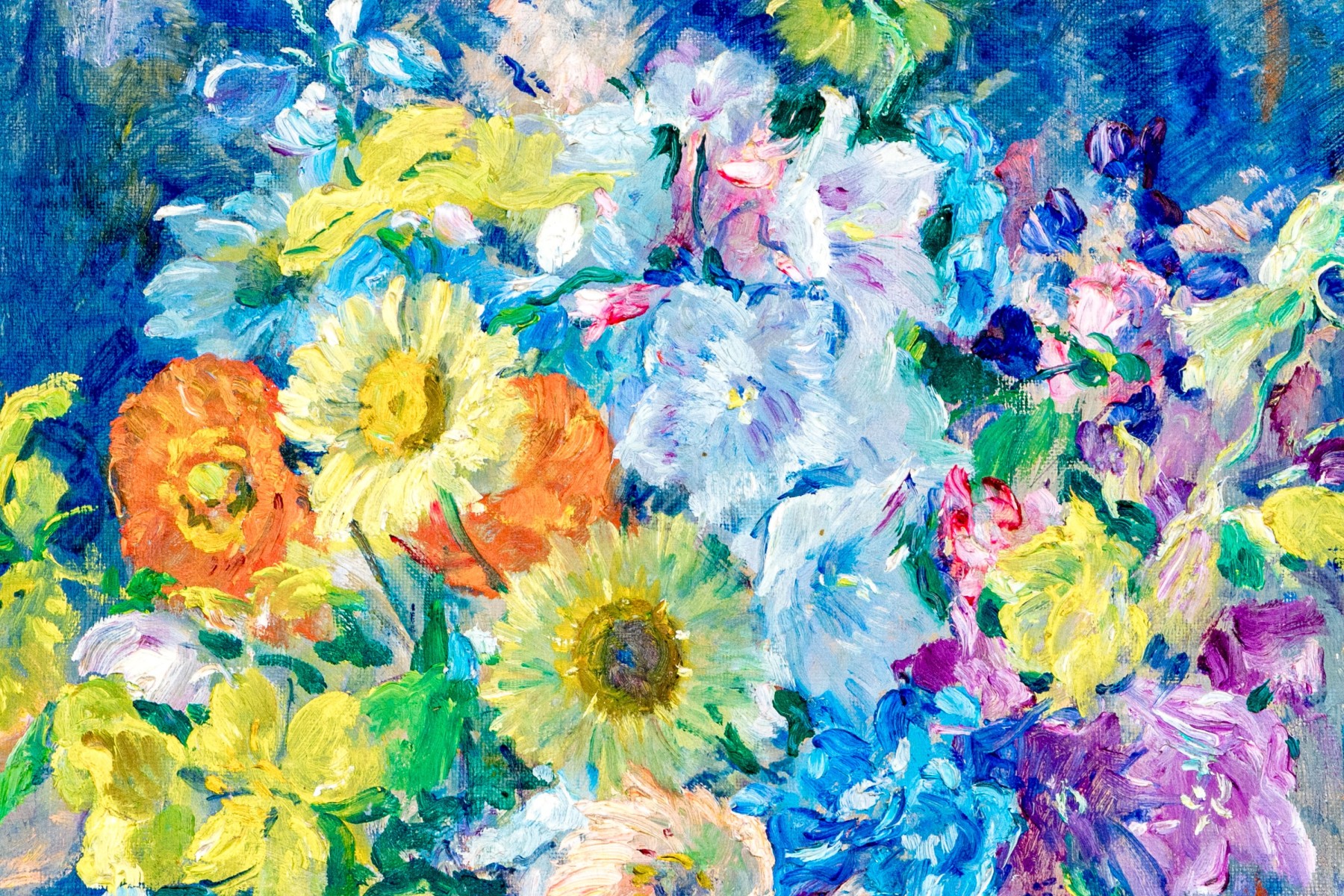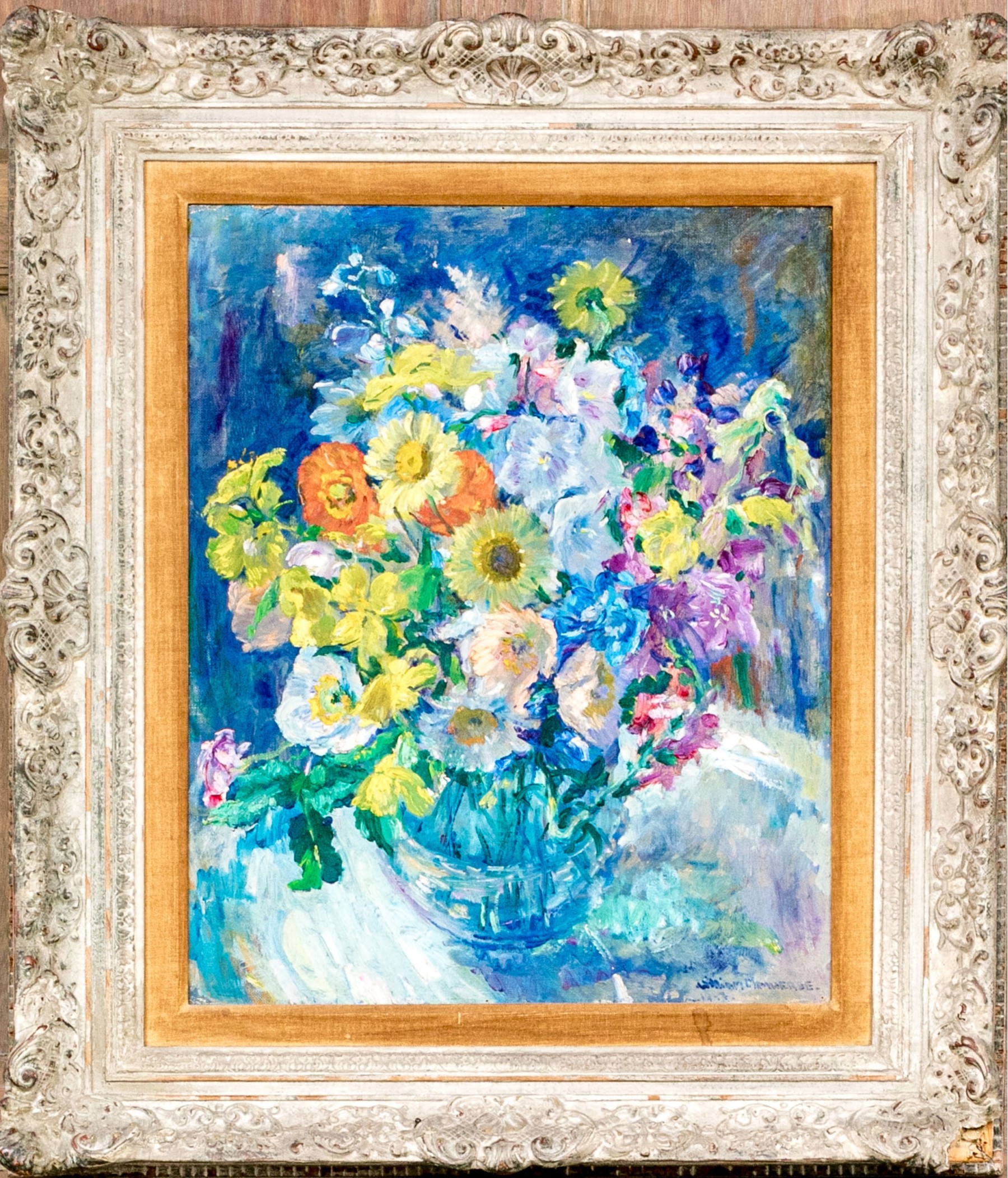 William Malherbe (French, 1884-1951) "Flowers-Vermont, 1941" oil painting on canvas depicting an impressionist still life of lush yellow, blue, and purple flowers in a blue glass vase over a white circular table against a textural blue ground. Signed lower right, with a paper label affixed to the verso.