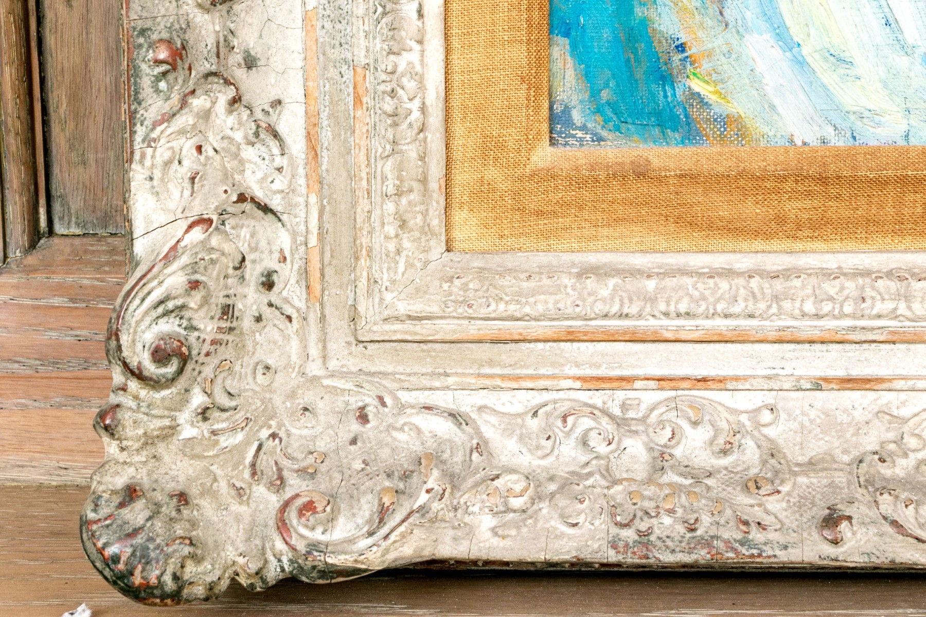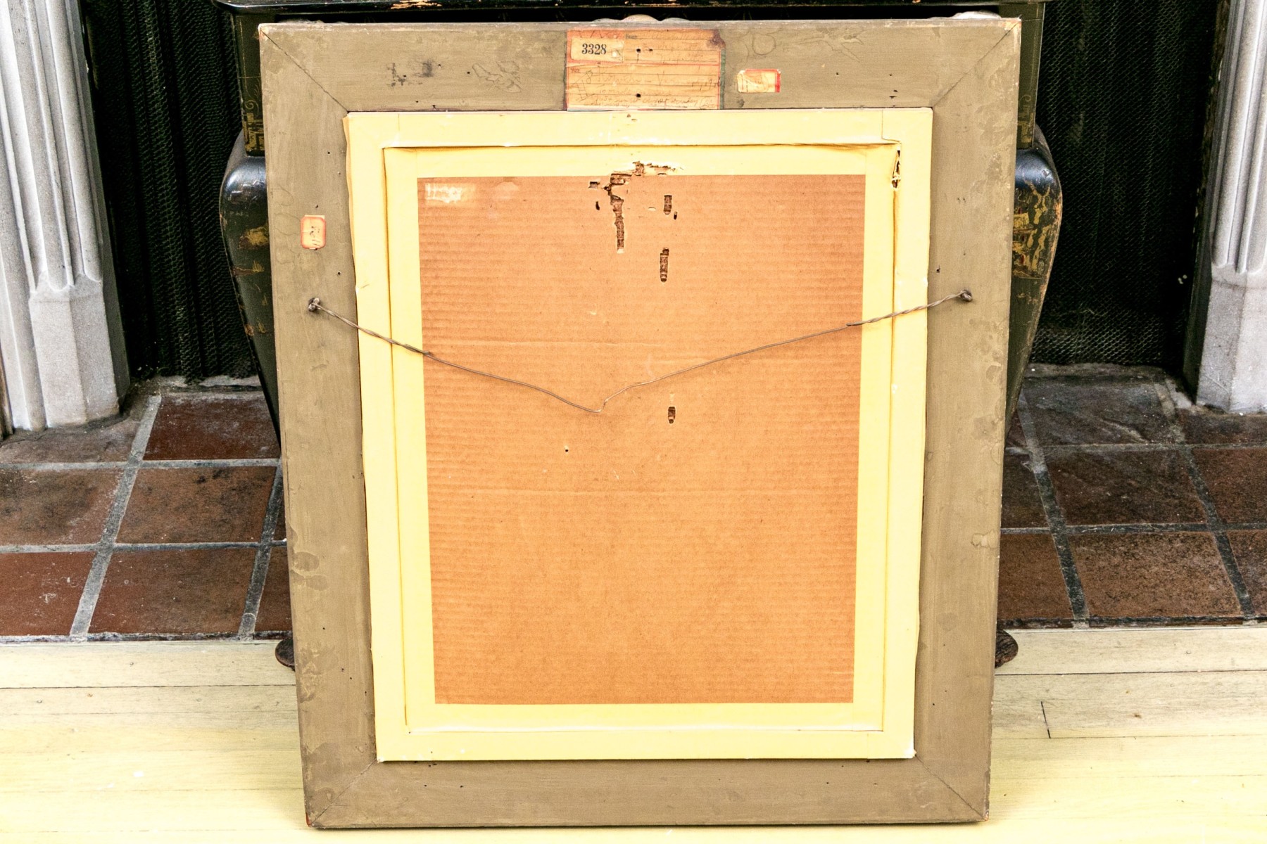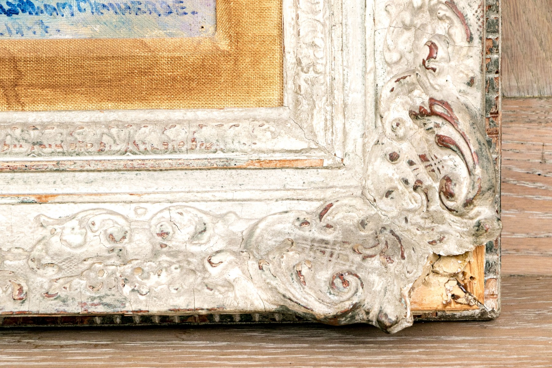 Displayed with a linen liner in a rustic ashen white gesso finished frame with ornate scrolled relief.