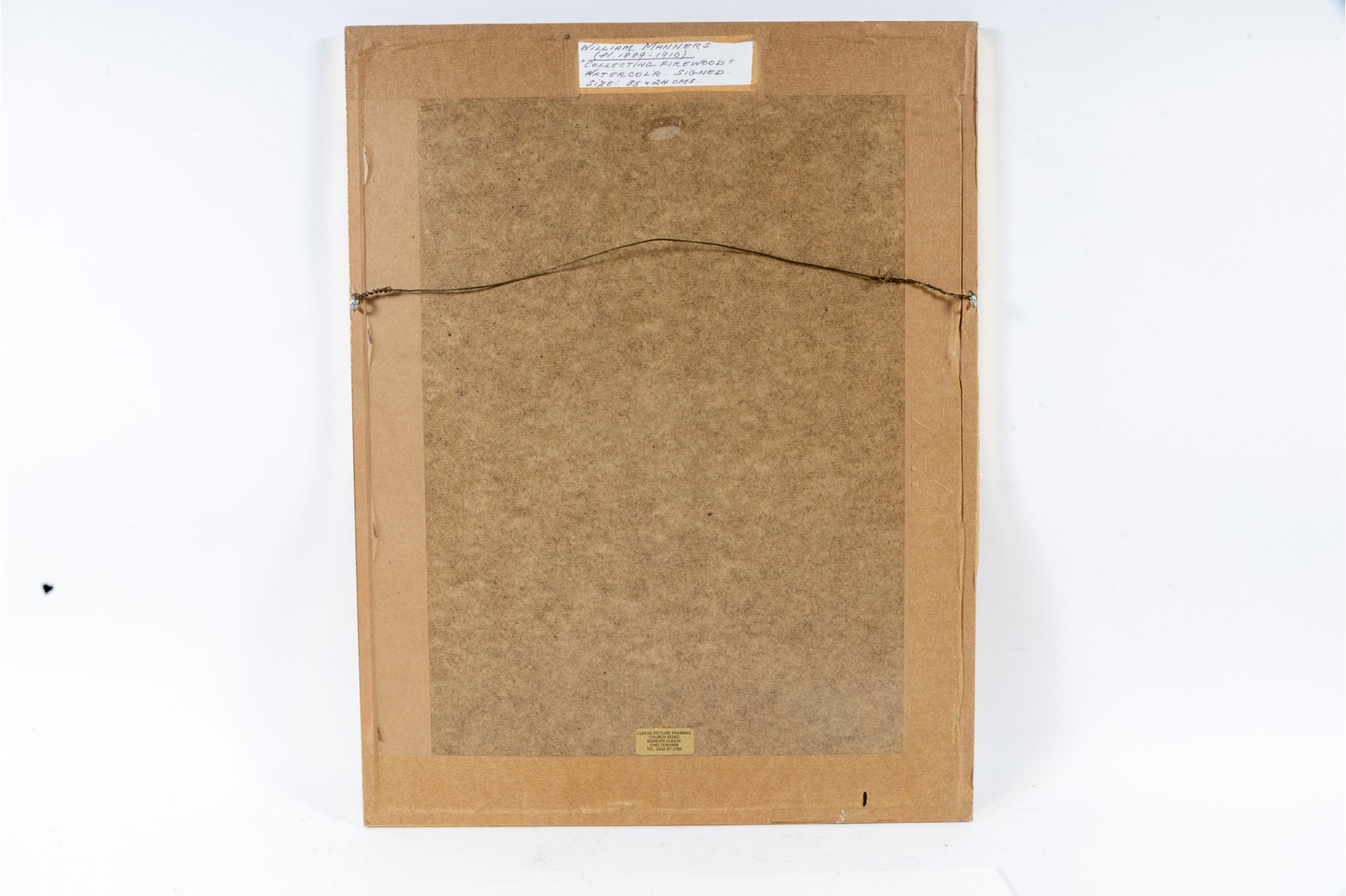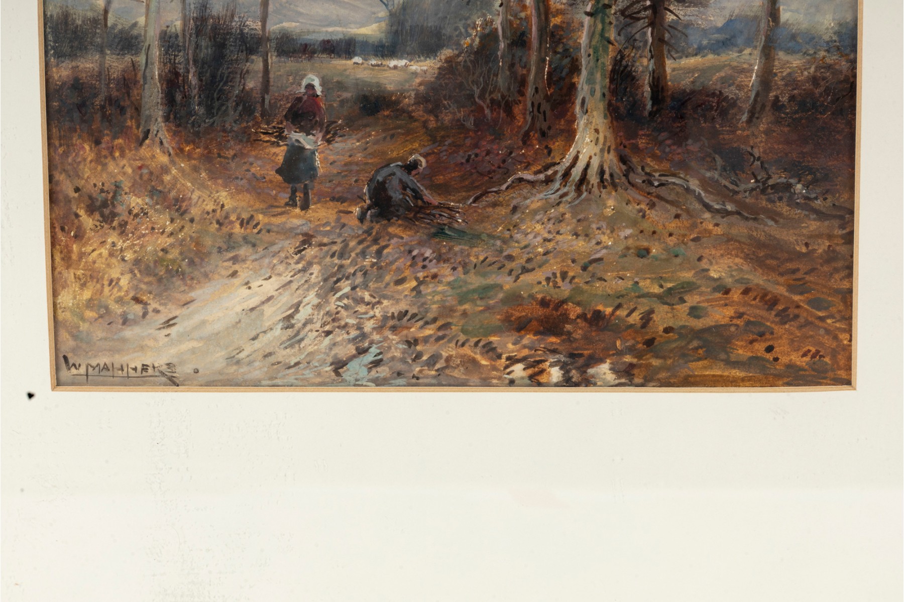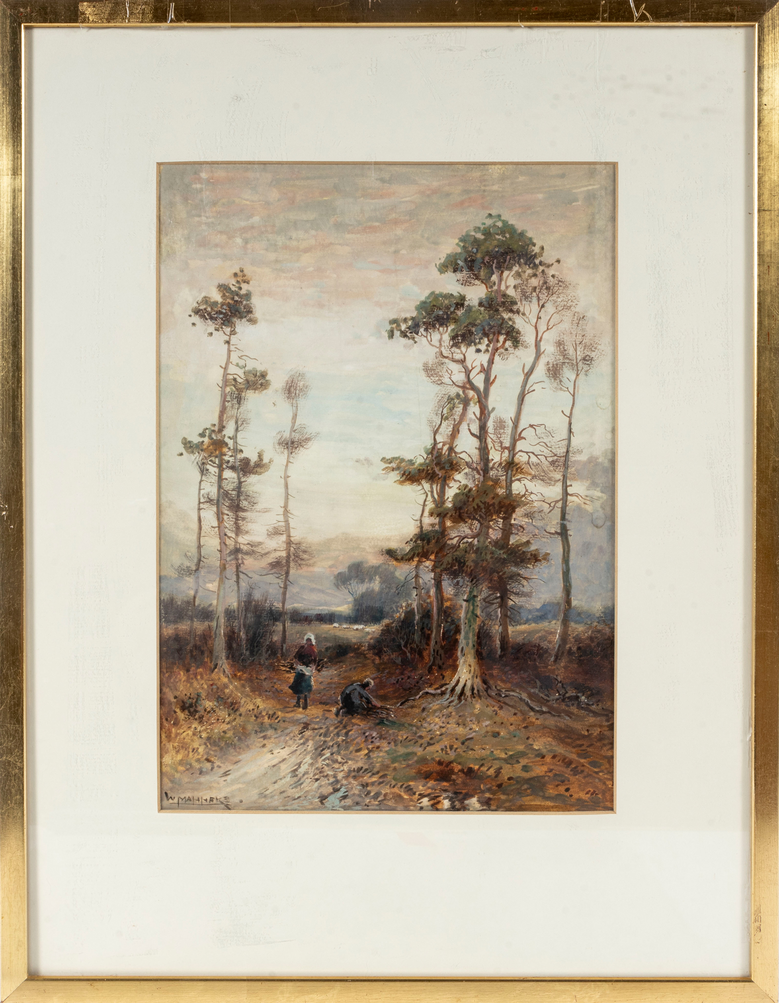 A watercolor on paper landscape entitled, "Collecting Firewood" by William Manners (English, 1860 - 1930) which displays a forest foraging scene The artwork is presented in a slim, gold-tone wood frame, faced with glass, and accented with an off-white mat-border.