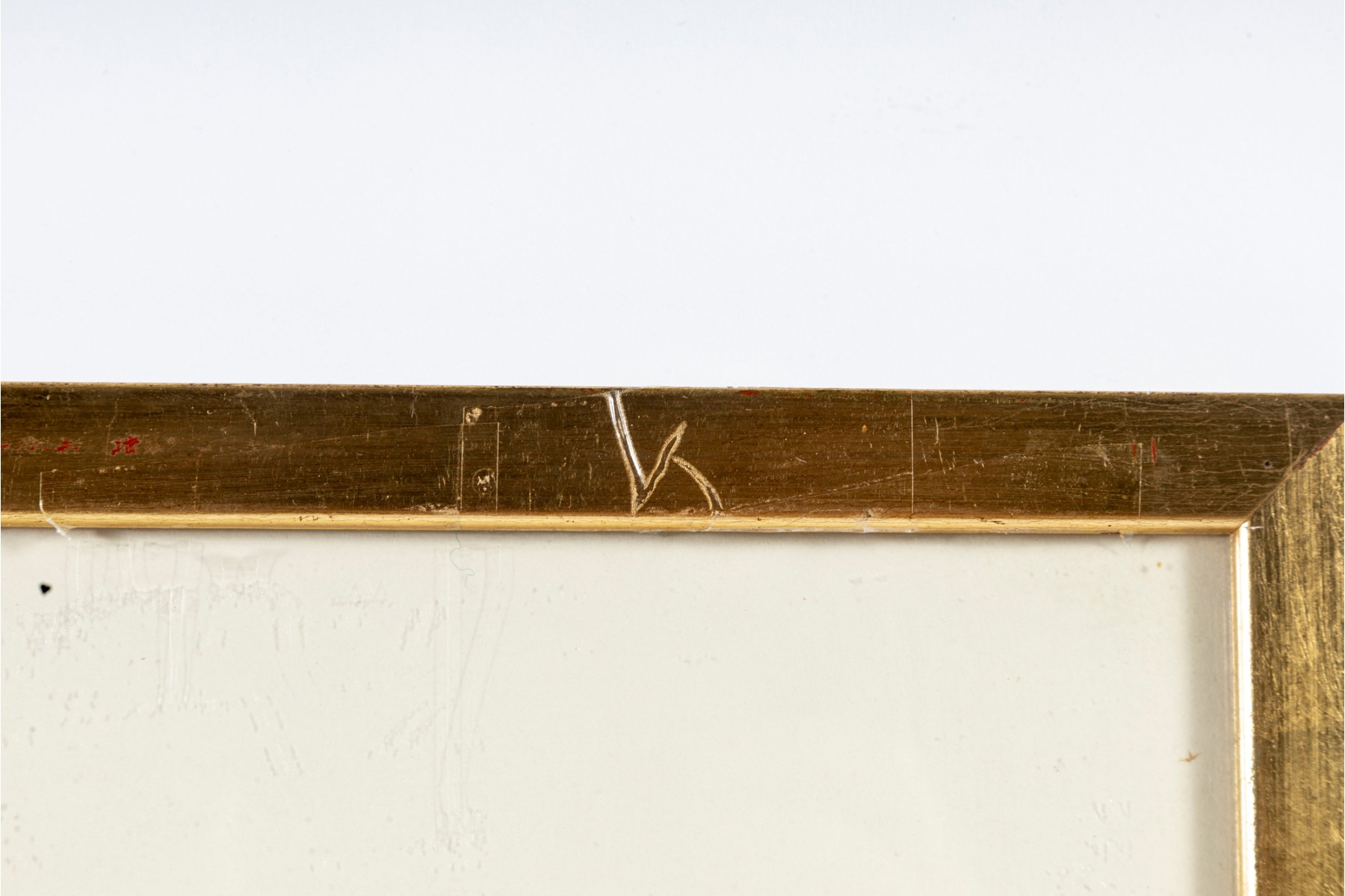 Excess adhesive residue to frame and glass. Overall in good condition.