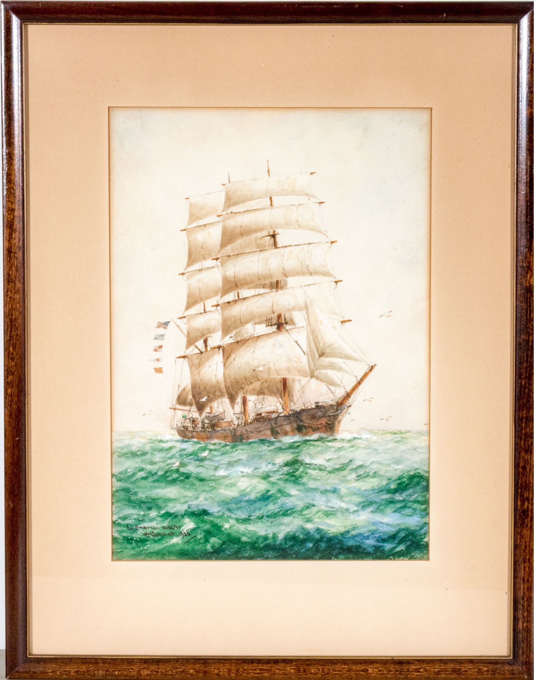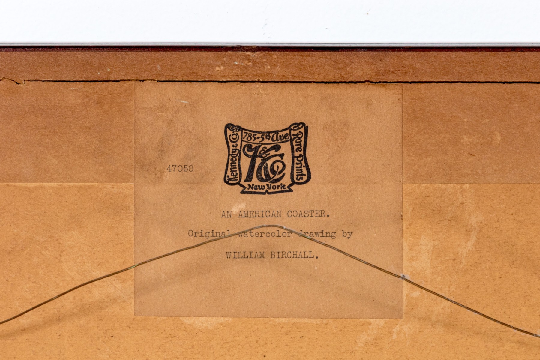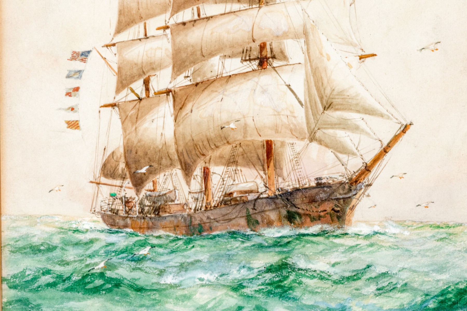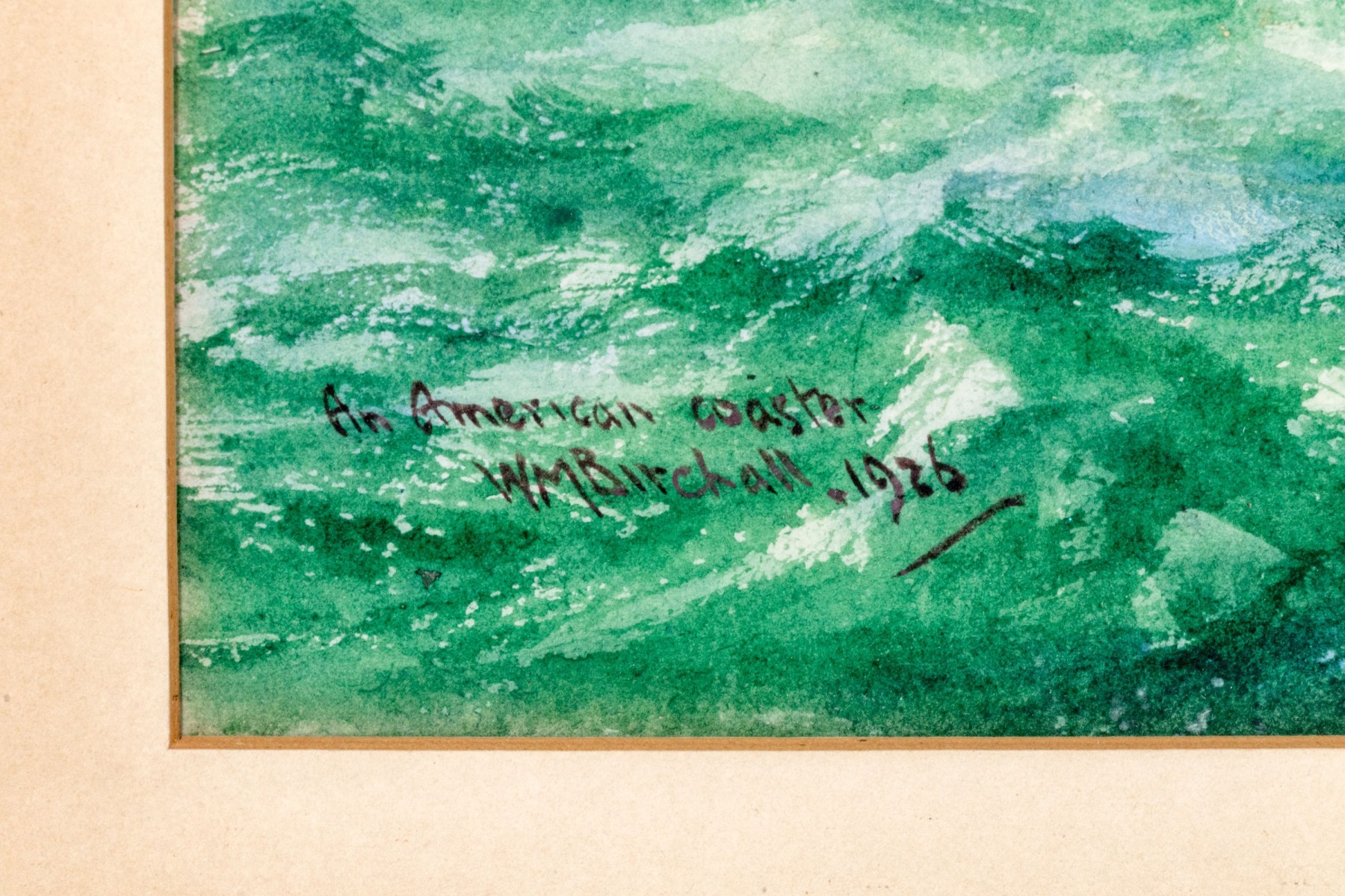 William Minshall Birchall (American, 1844-1941) "An American Coaster" watercolor painting on paper depicting an impressive clipper ship sailing on green ocean waves. Signed, titled and dated 1926 lower left.