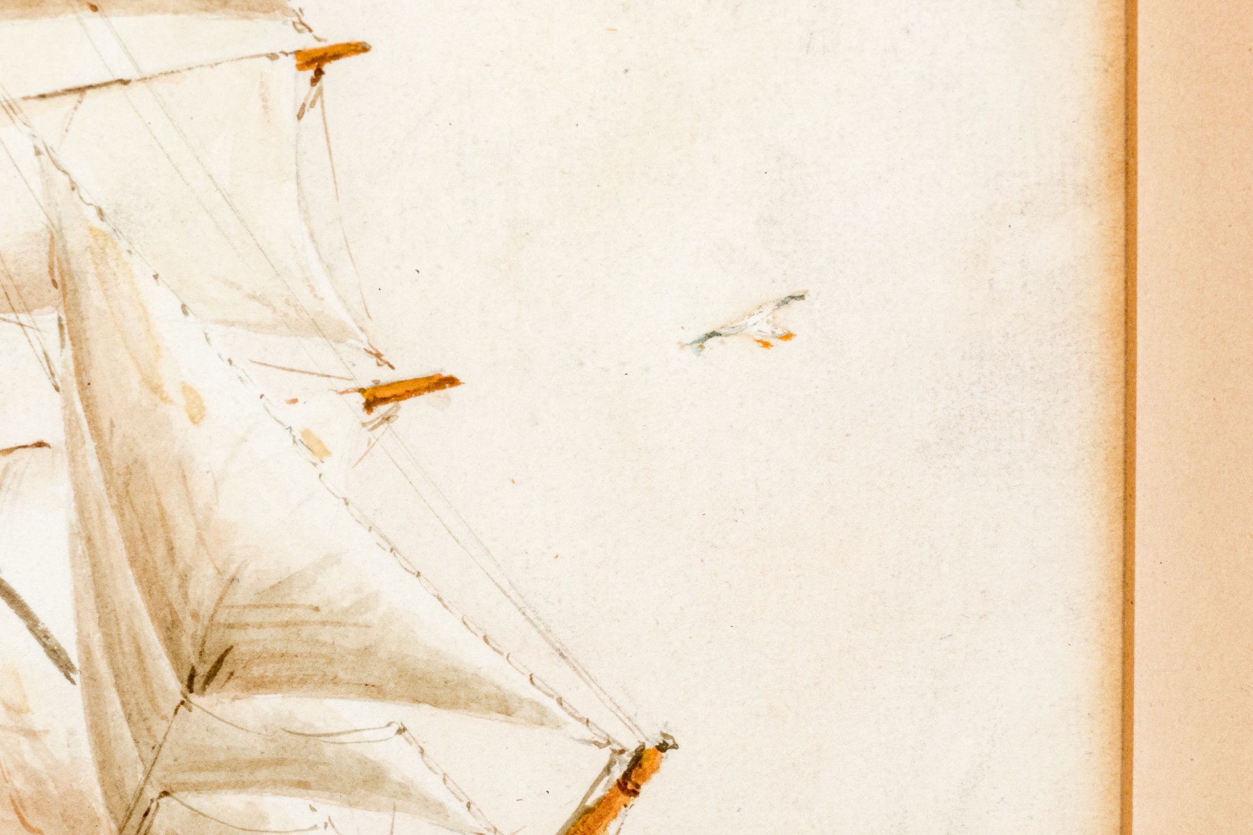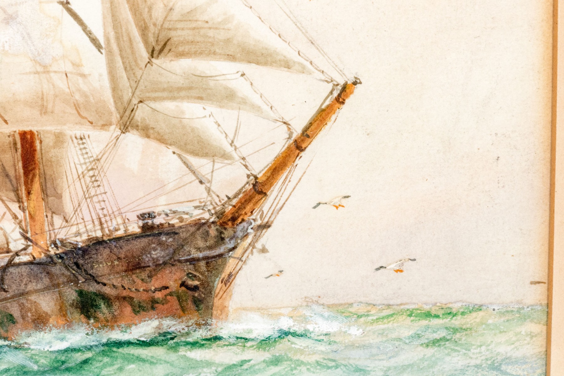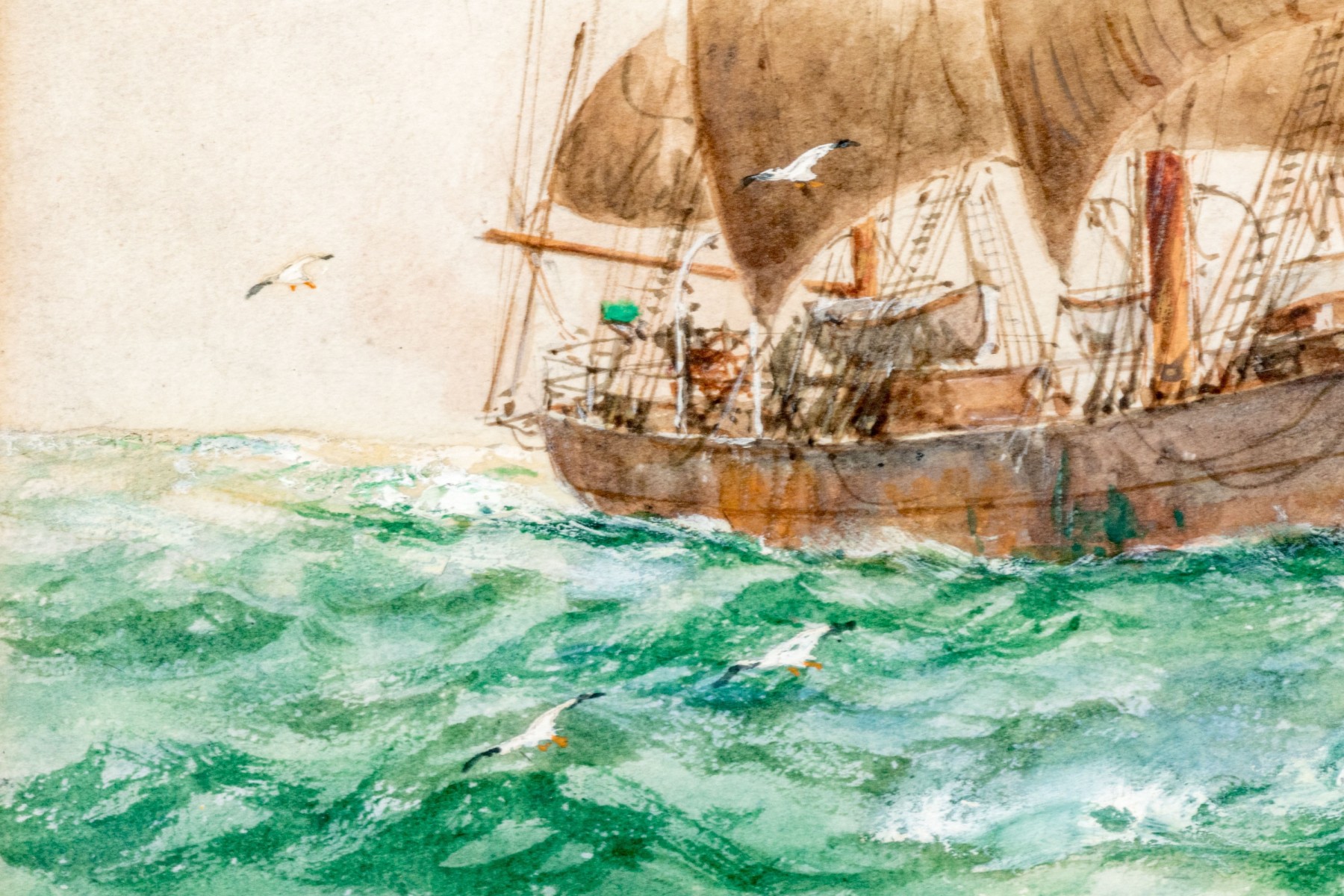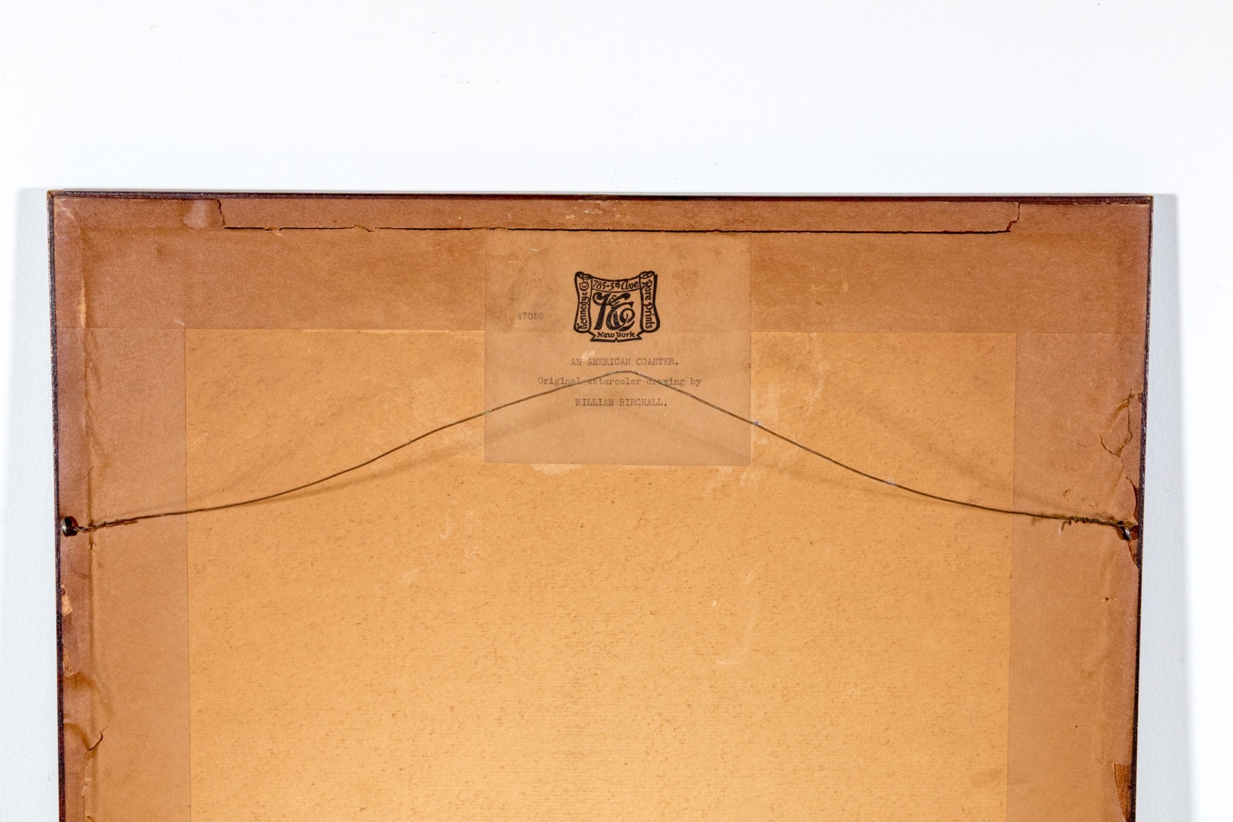 William Minshall Birchall (American, 1844-1941) "An American Coaster" watercolor painting on paper depicting an impressive clipper ship sailing on green ocean waves. Signed, titled and dated 1926 lower left.