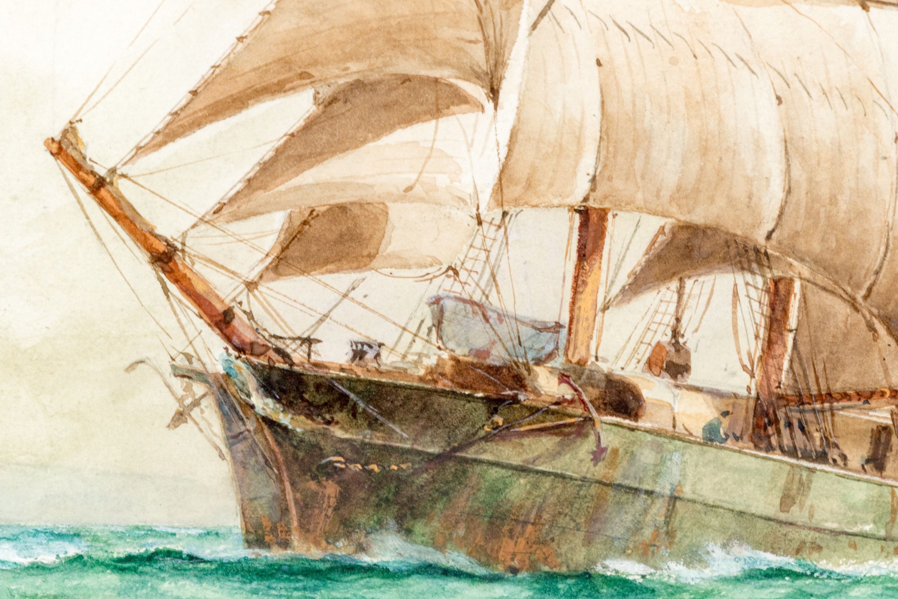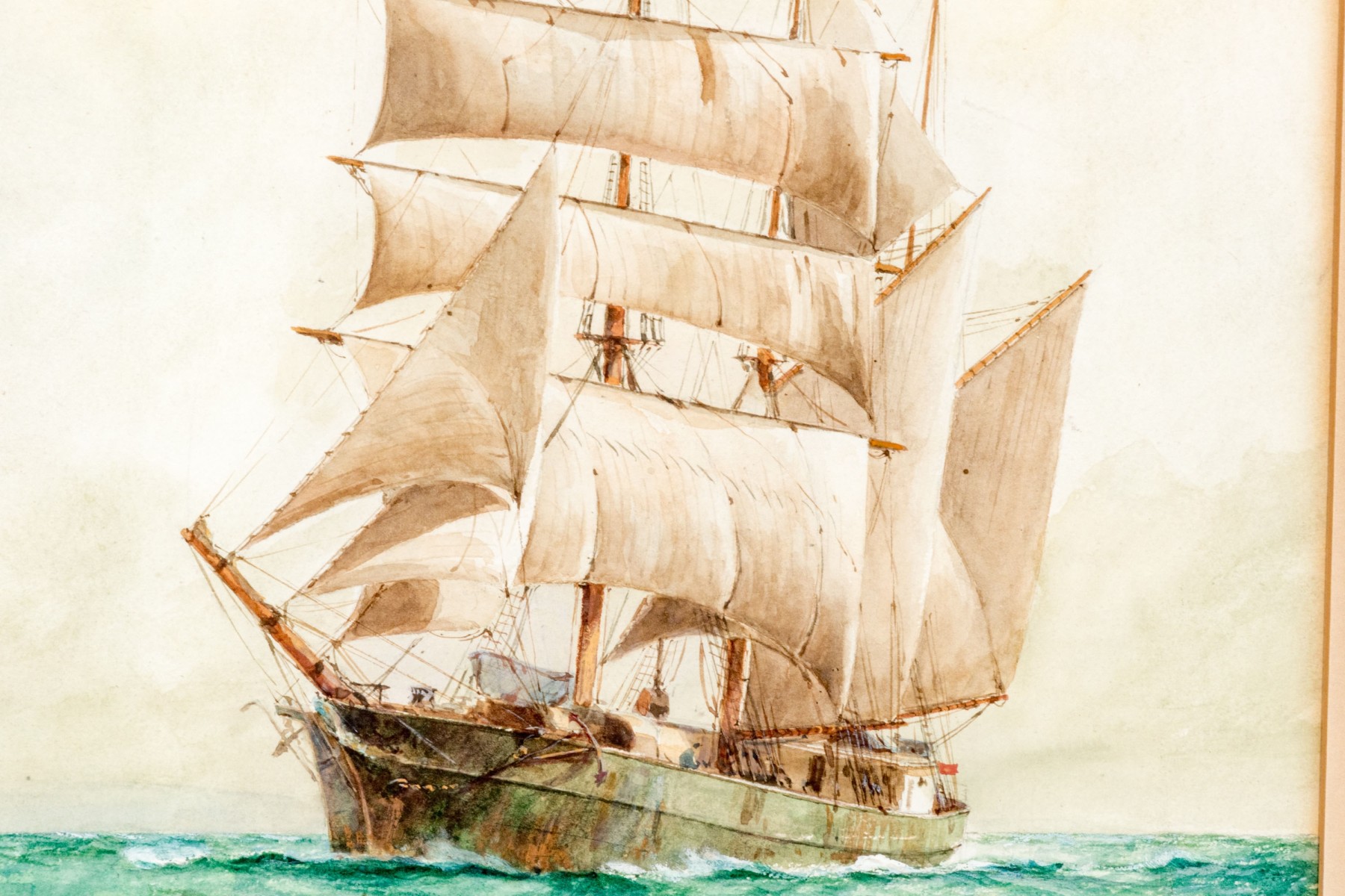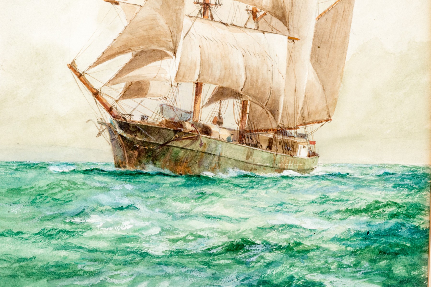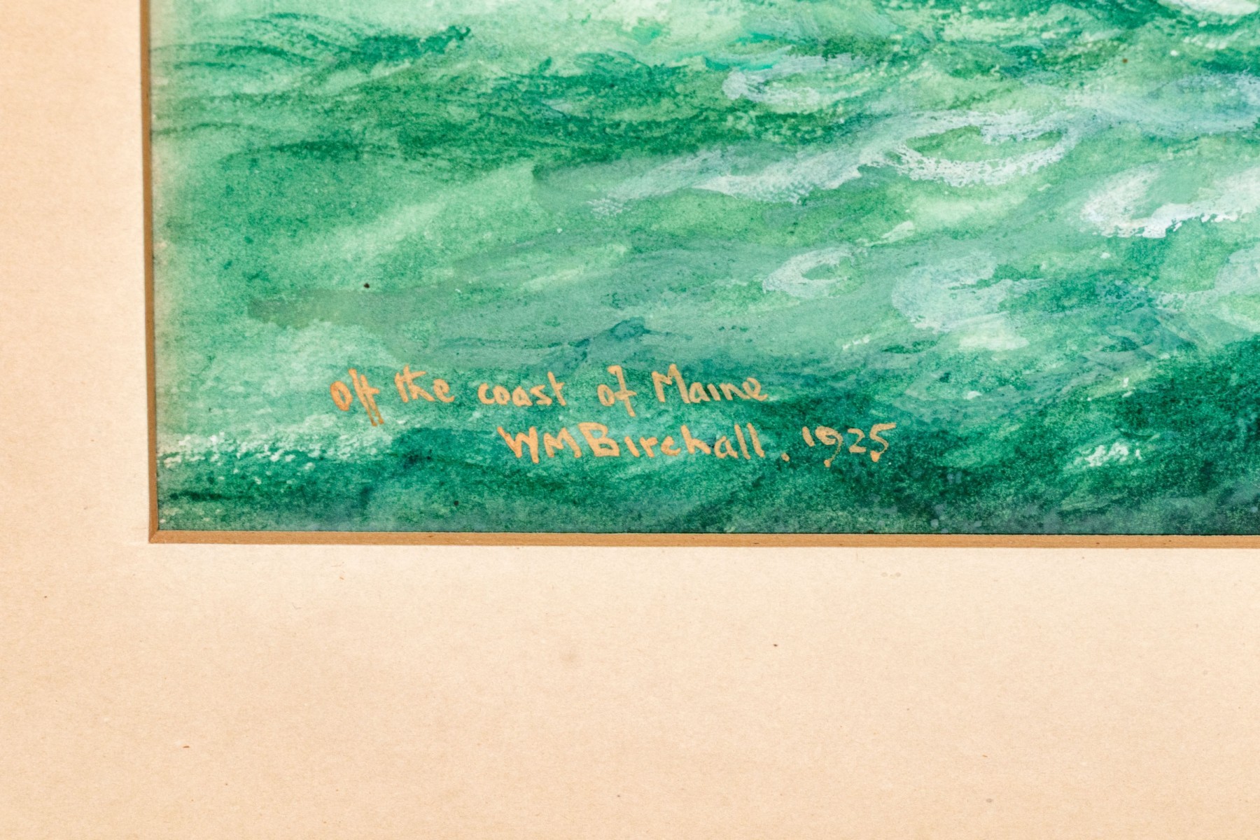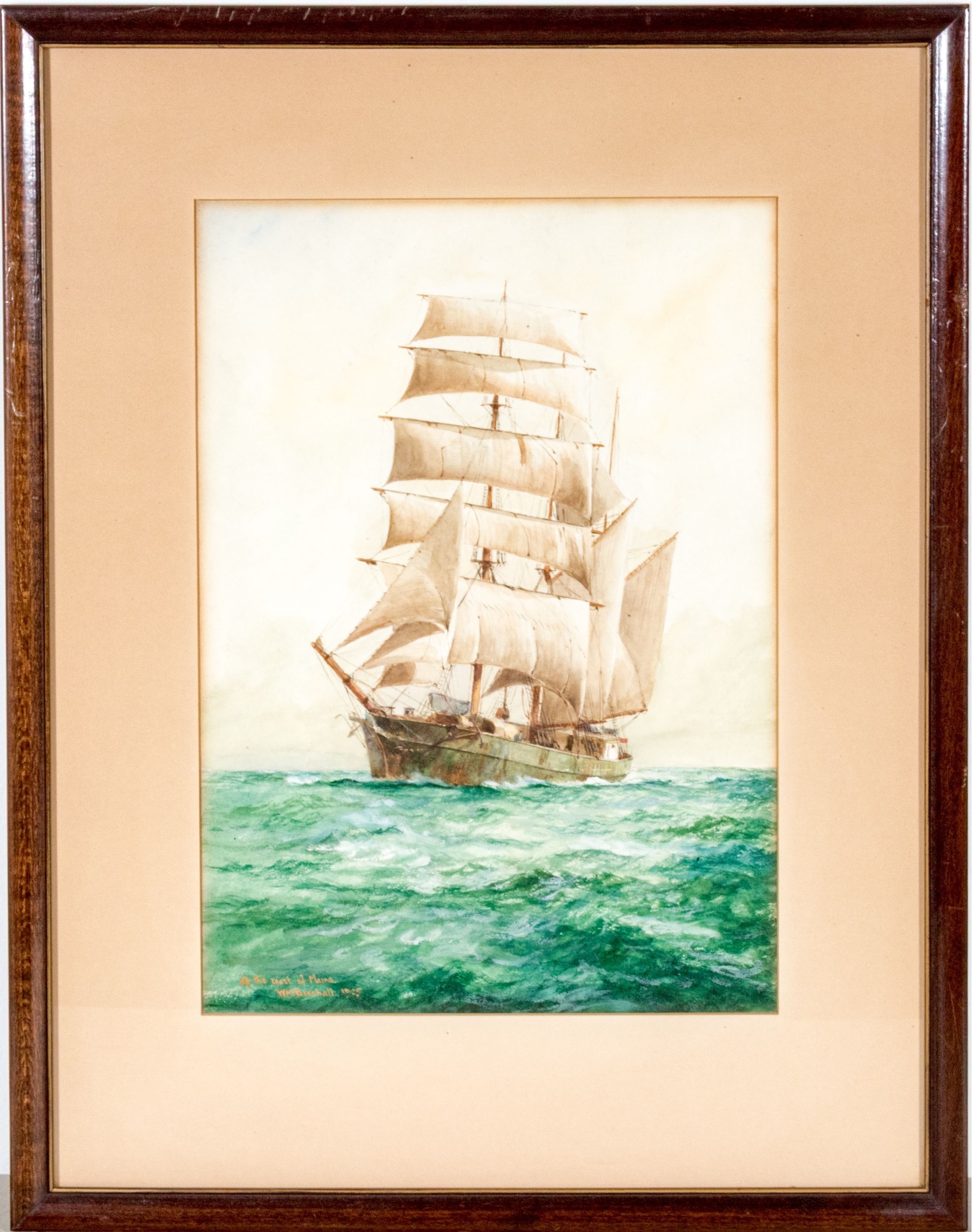 William Minshall Birchall (American, 1844-1941) "Off The Coast Of Maine" watercolor painting on paper depicting an impressive clipper ship on vibrant green and blue ocean water. Signed, titled, and dated 1925 lower left.