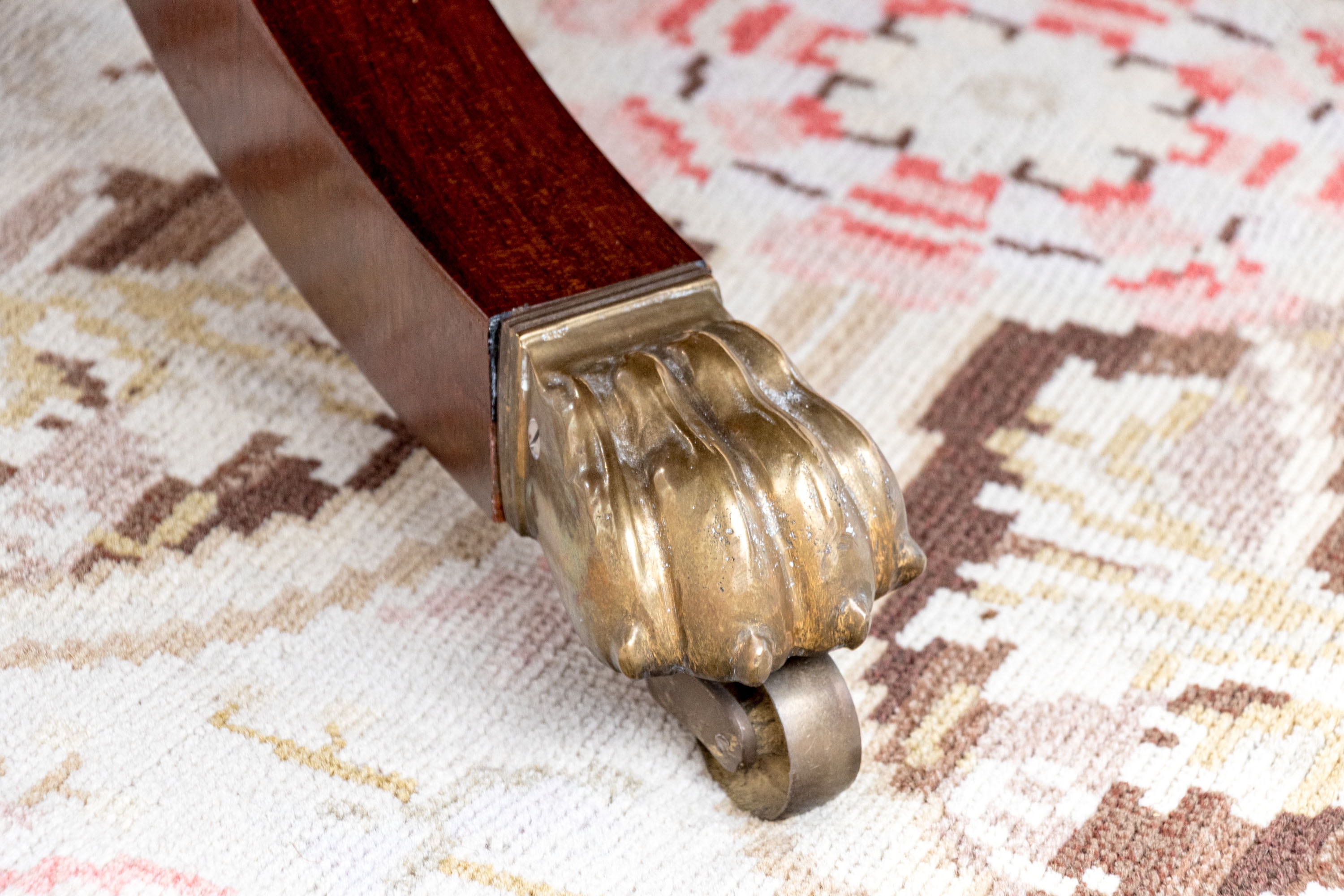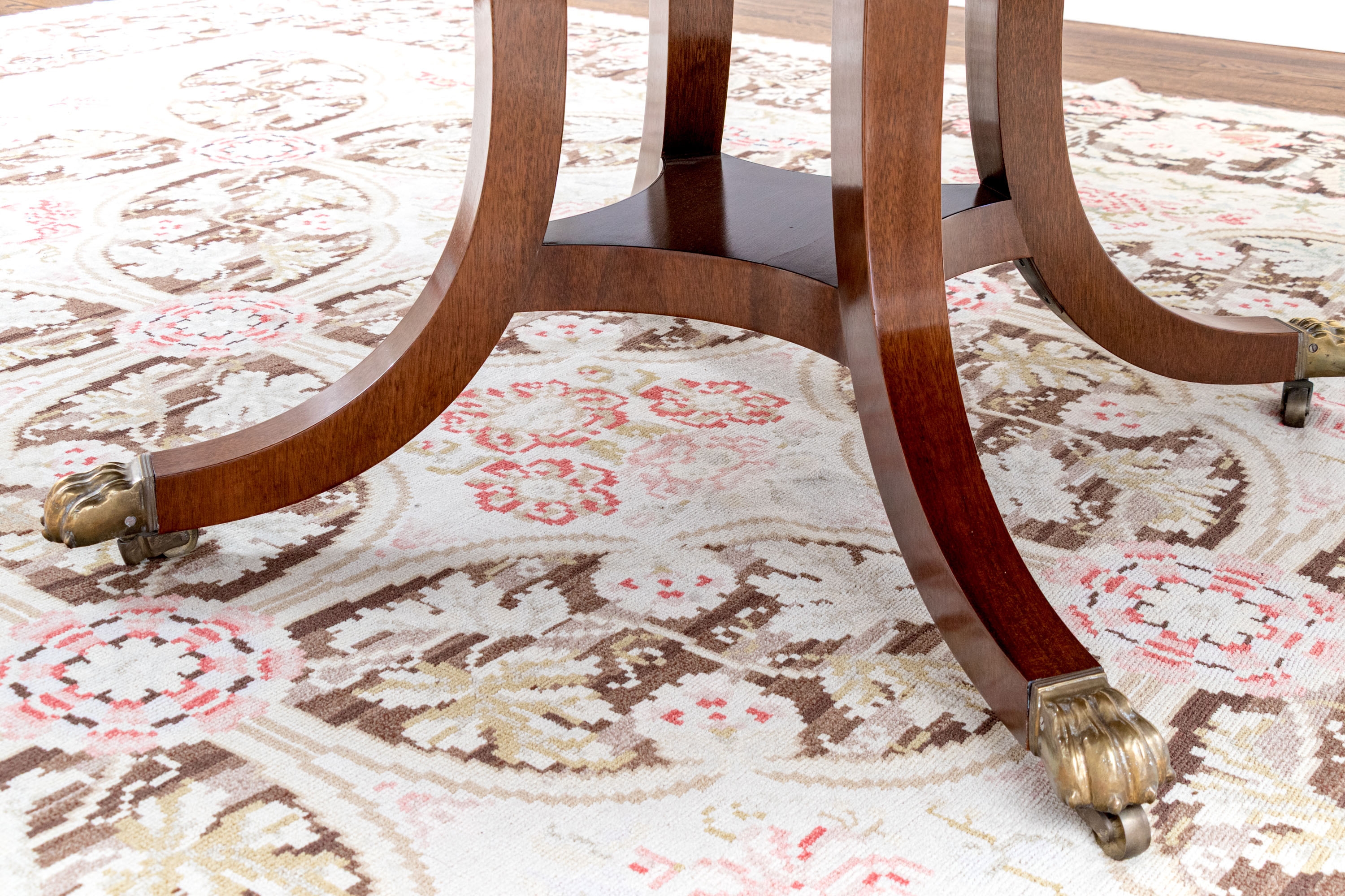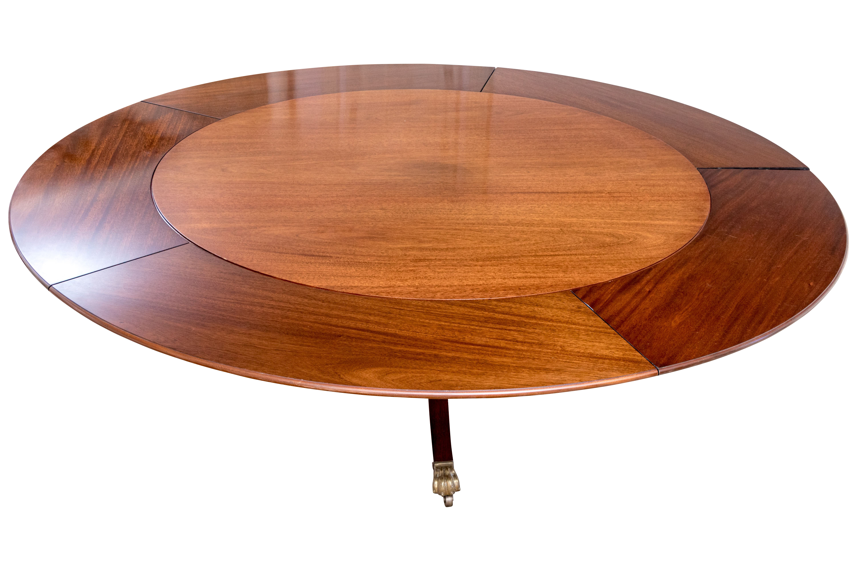 The table stands on four curved legs with brass lion paw form feet and brass casters. The curved legs have a lower tiered shelf with the circular table top above. The circular table with five extension leaves which are all curved and fit around the table making it 90 1/4" W.