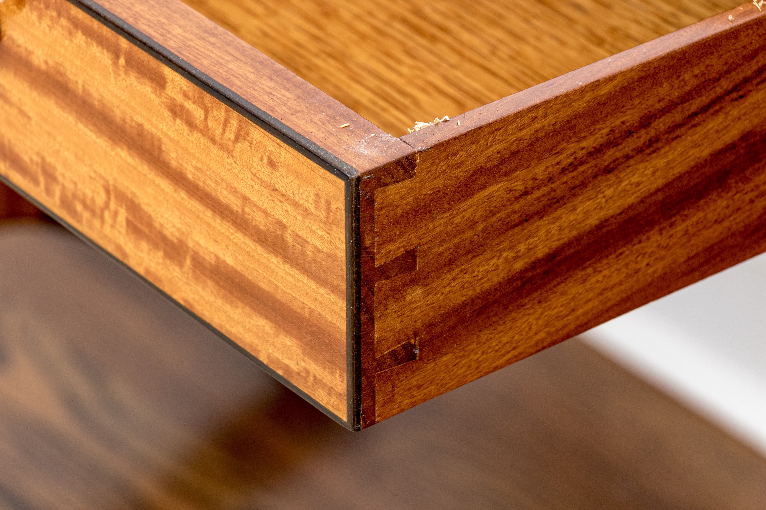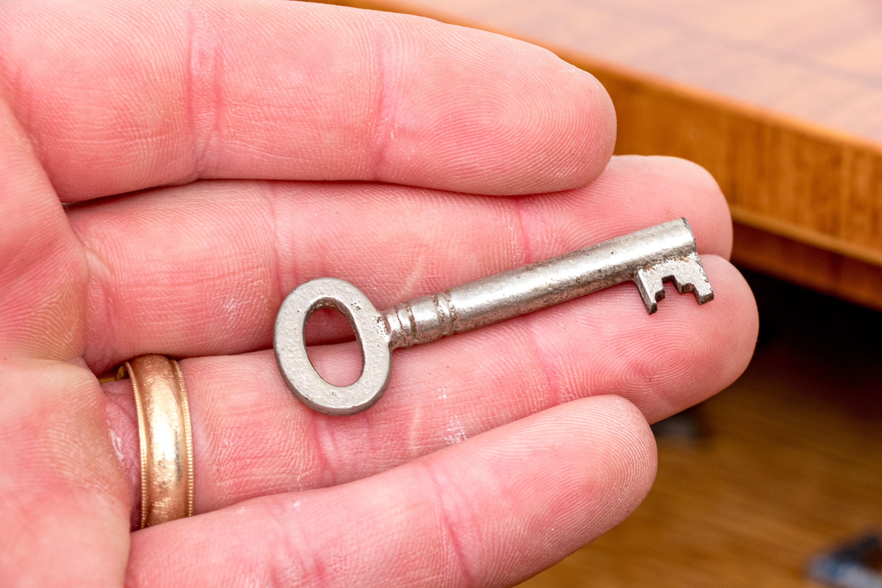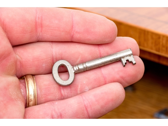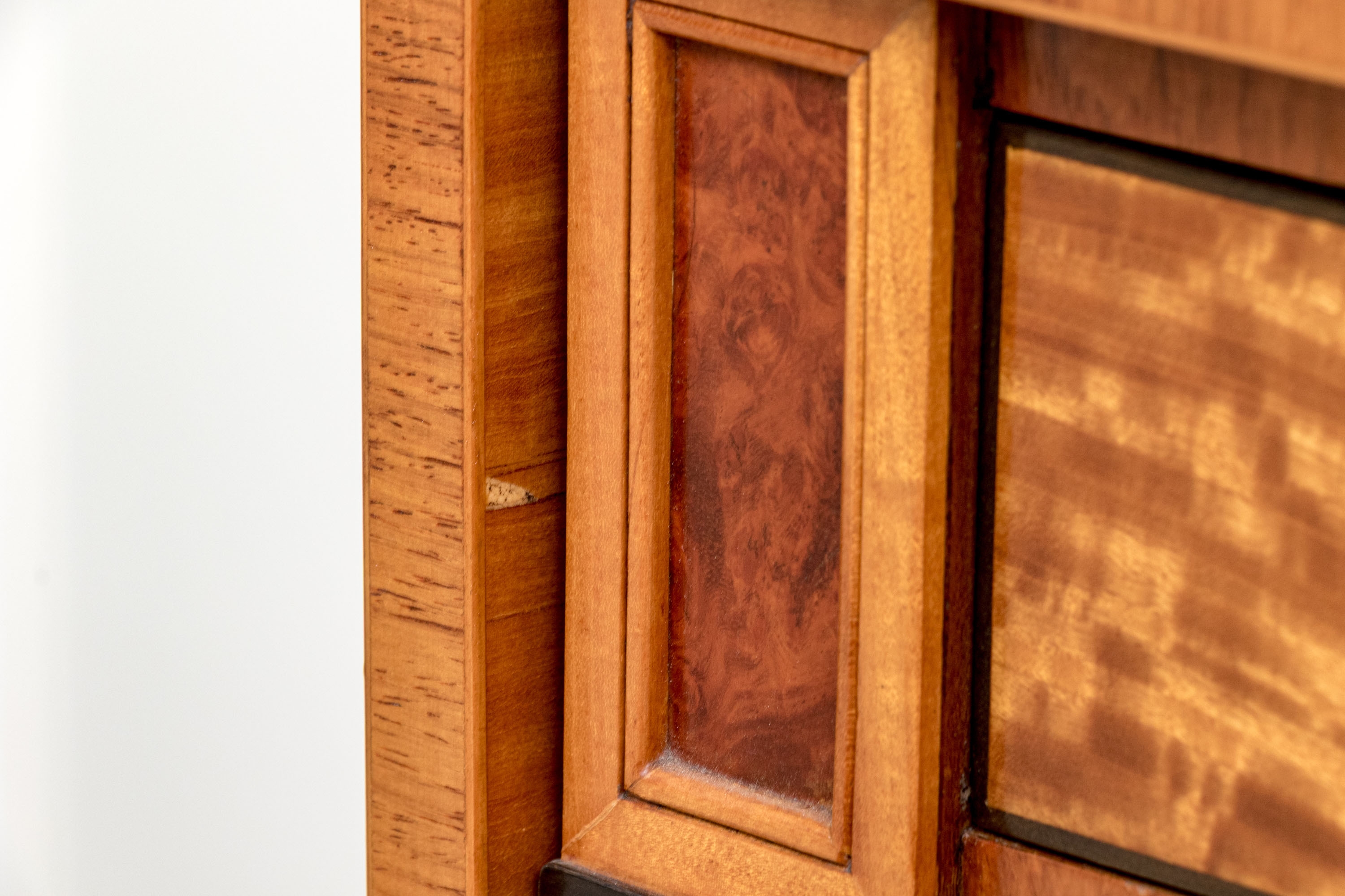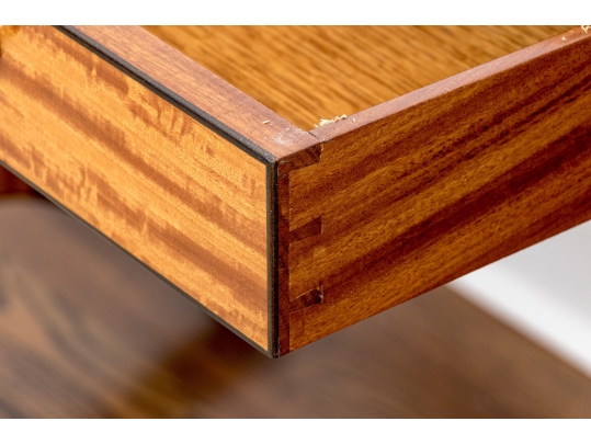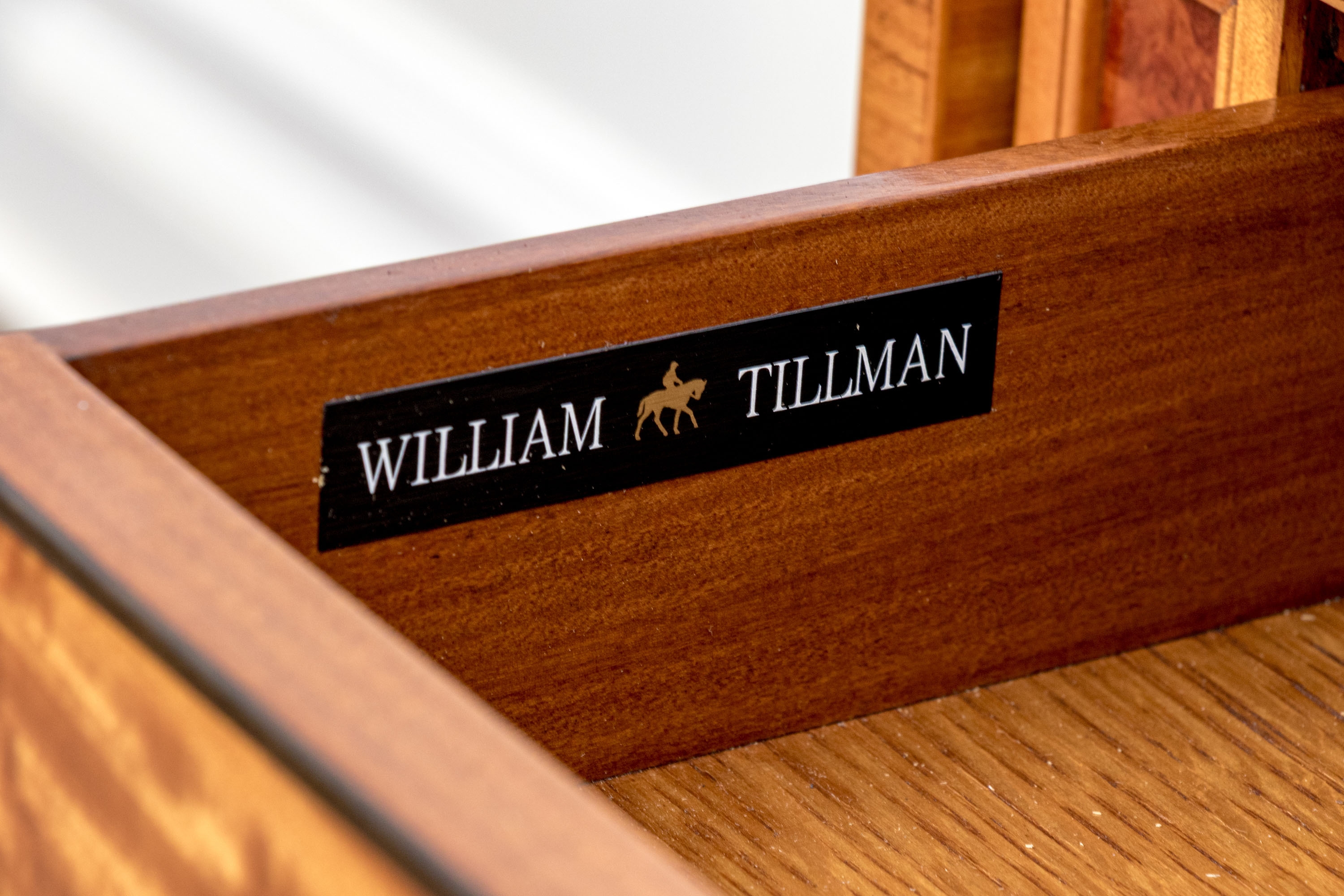 Each drawer with silver plate pulls, key escutcheons and working key. Tillman label inside drawer.