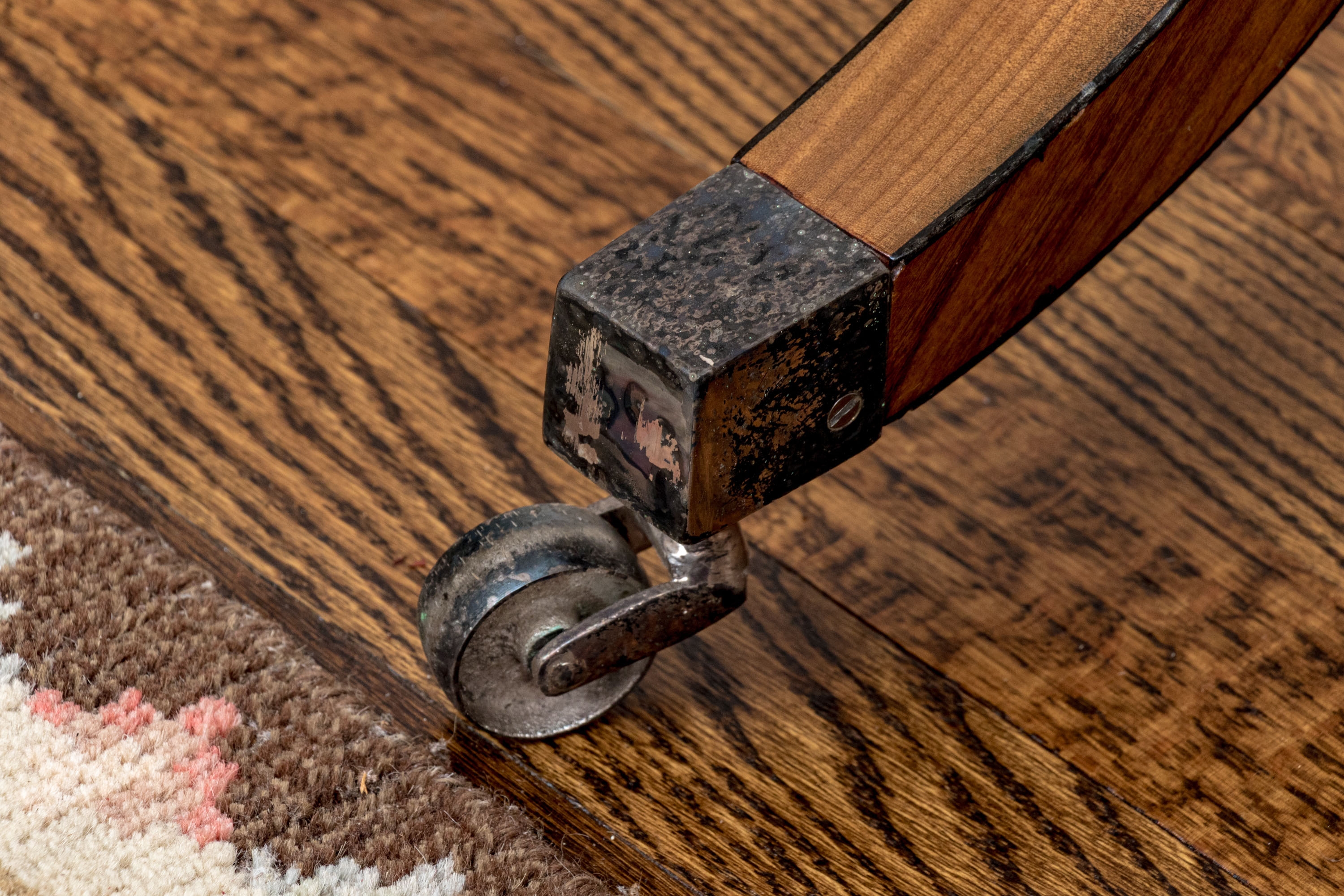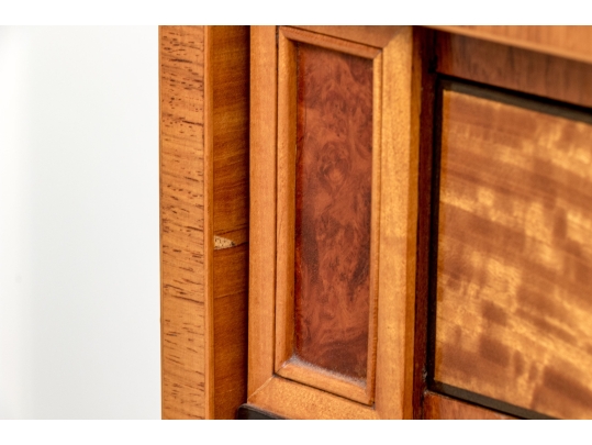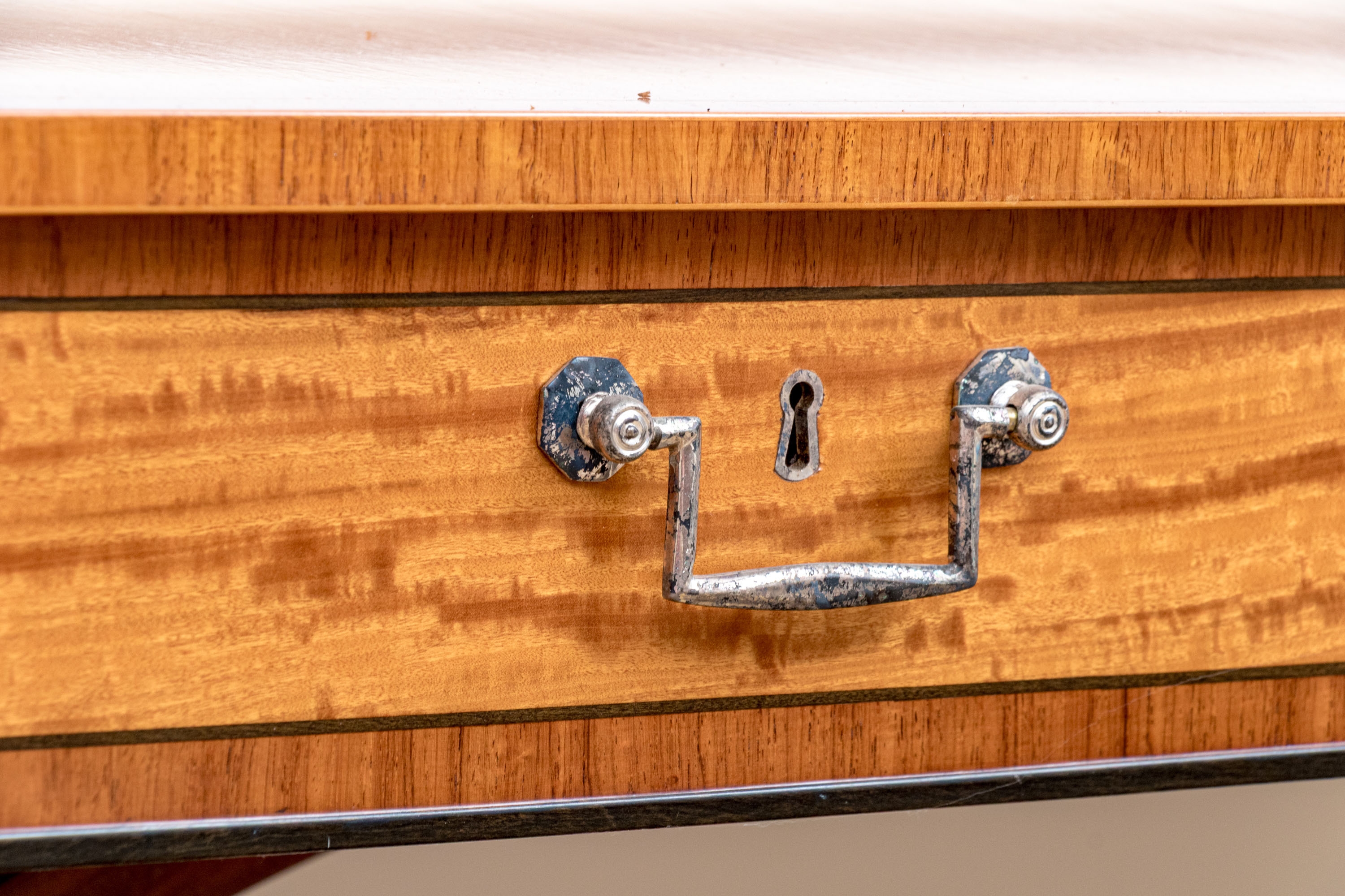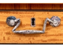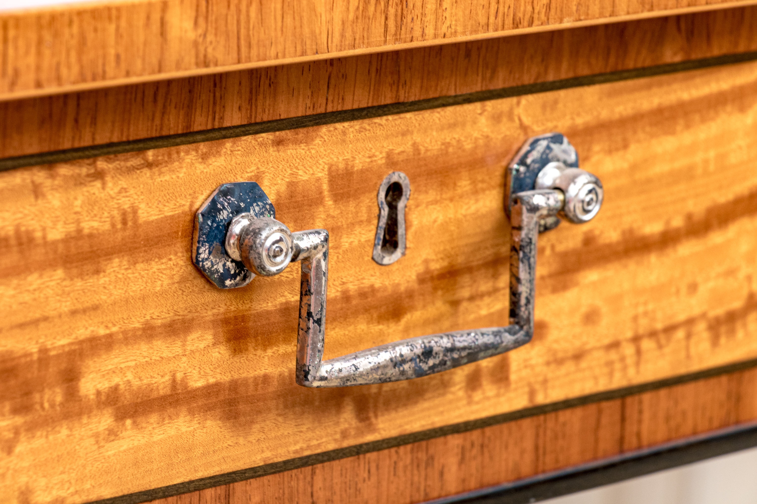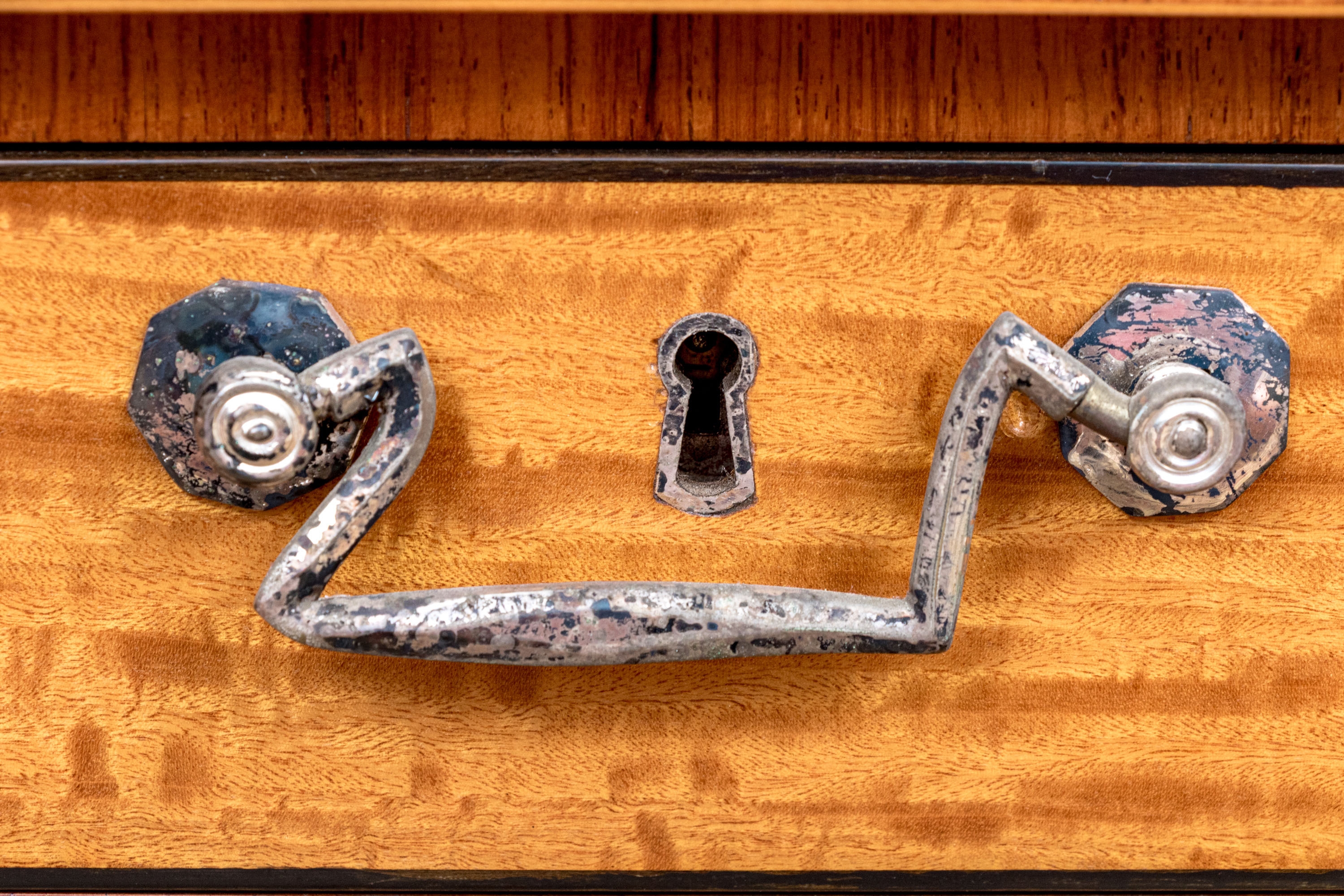 Condition: the front drawer pulls have been replaced and are slightly different from the ones on verso and a little tight. Tarnish to the silver-plate hardware. Very faint alligatoring and scratches. Overall presents very well with traces of wear.