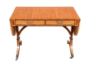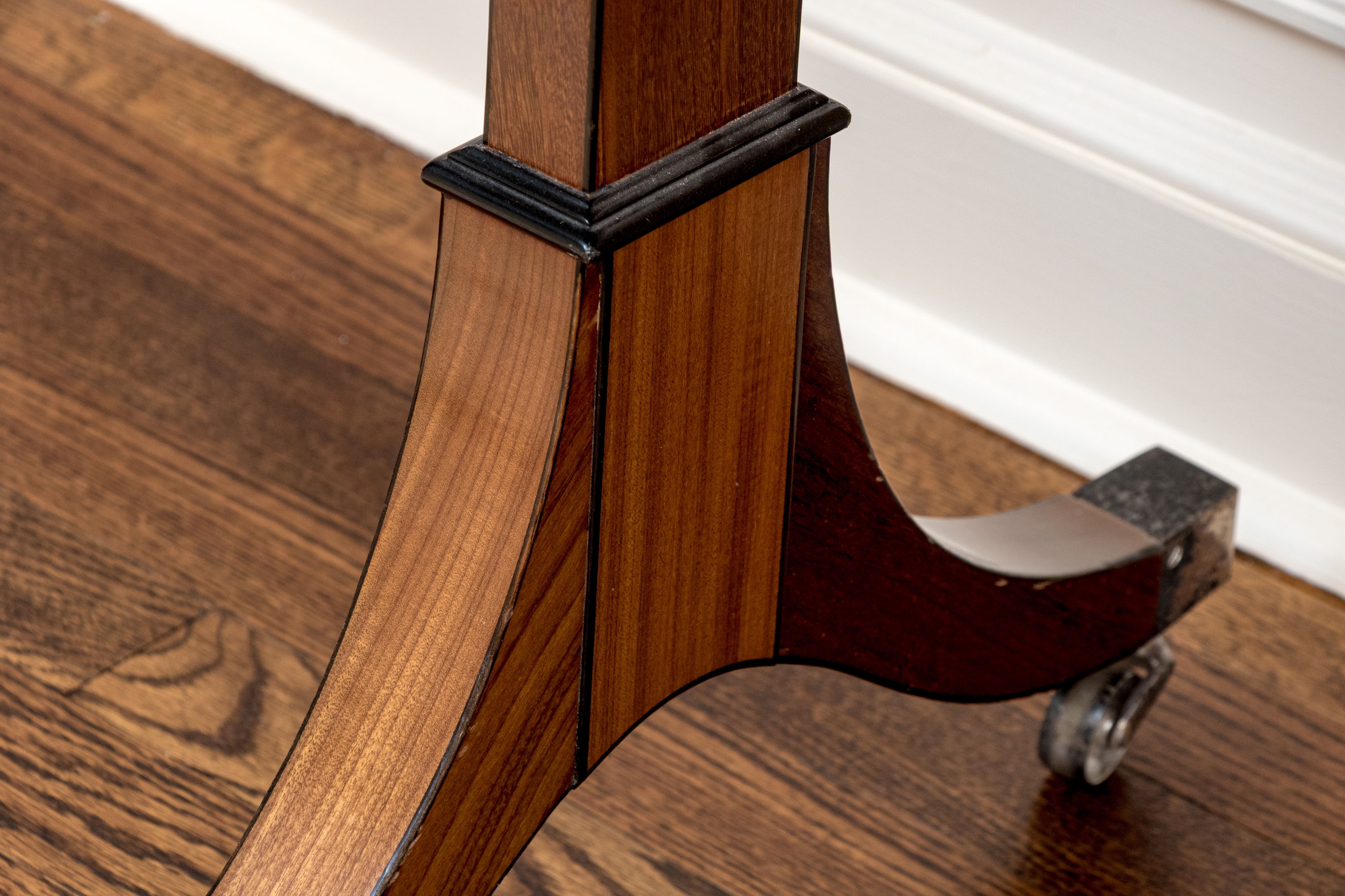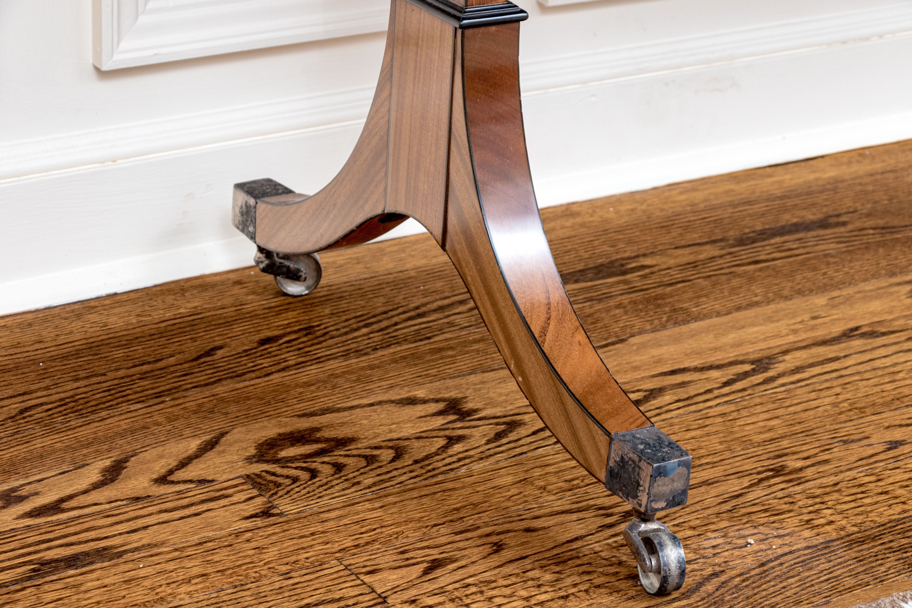 William Tillman regency style sofa table with two short front drawers, string inlay, faux drawers on verso, upper arched support bracket, twin pedestal supports with splayed sabre legs terminating in silver plate capped feet with iron castors.