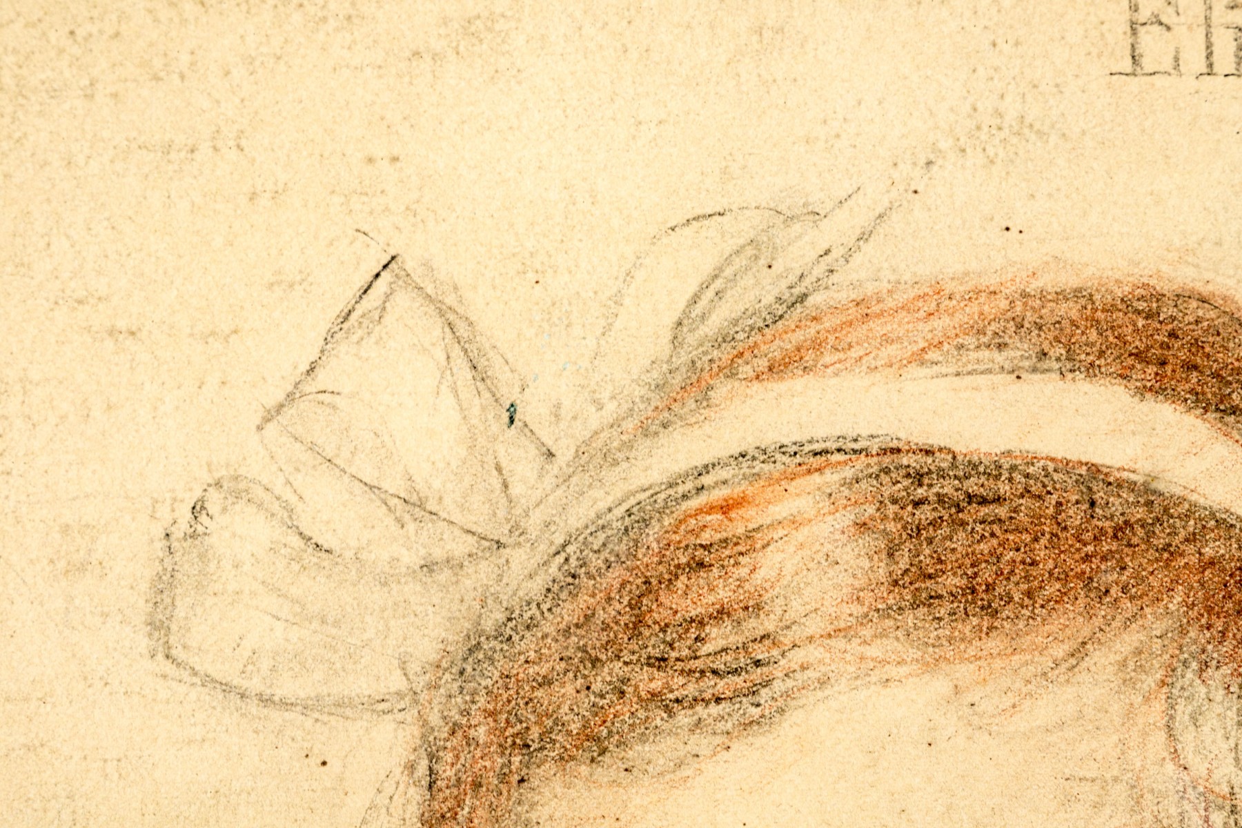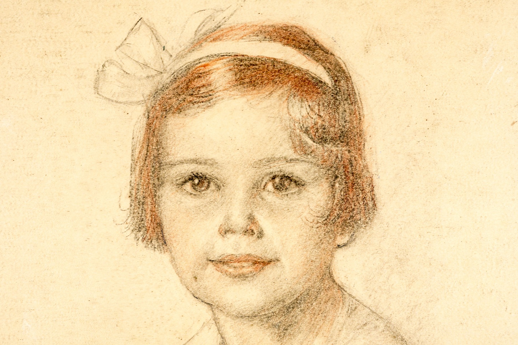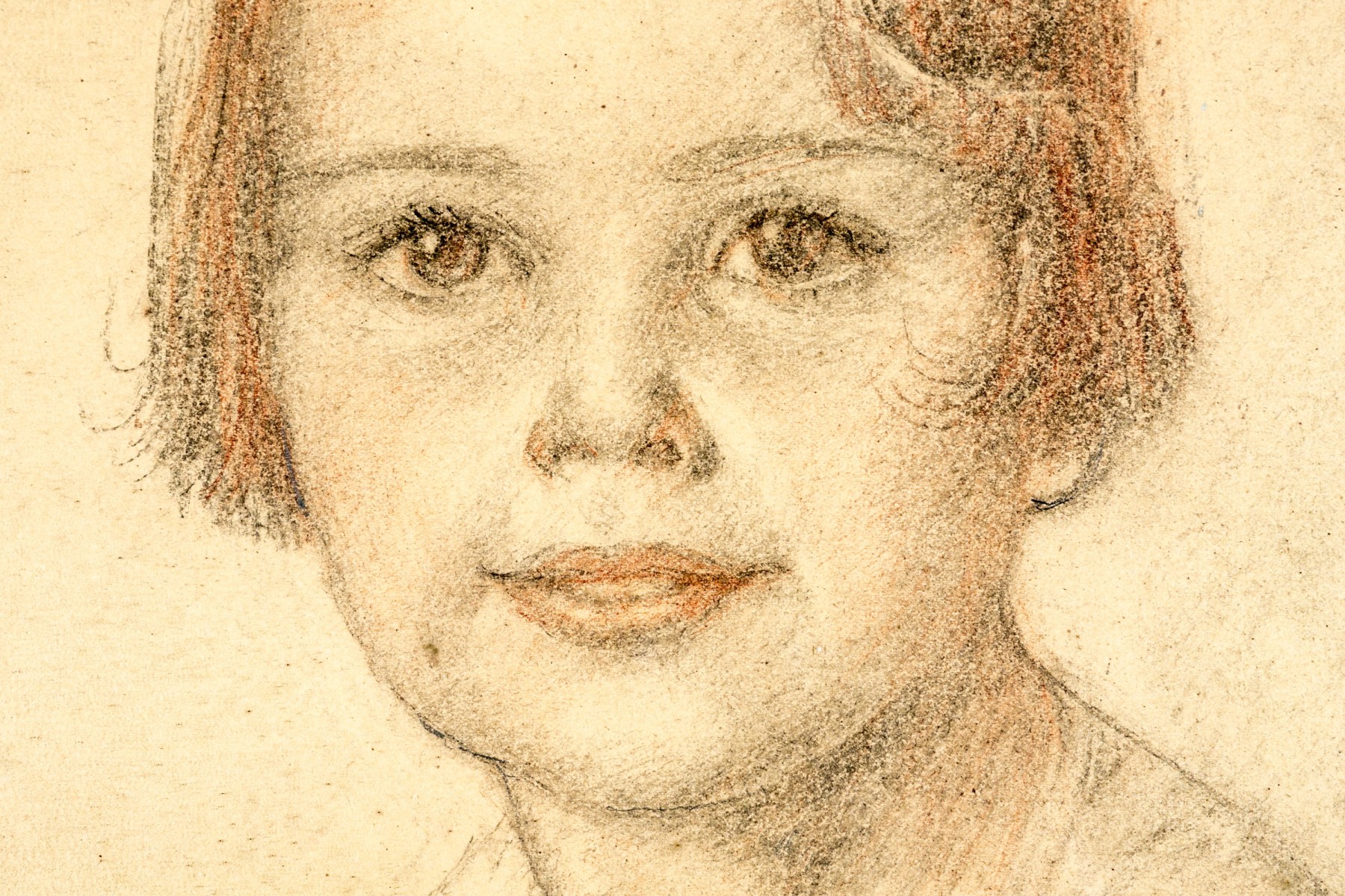 The current work is a lovely mixed media portrait of a young girl with short cropped hair tied back with a ribbon.