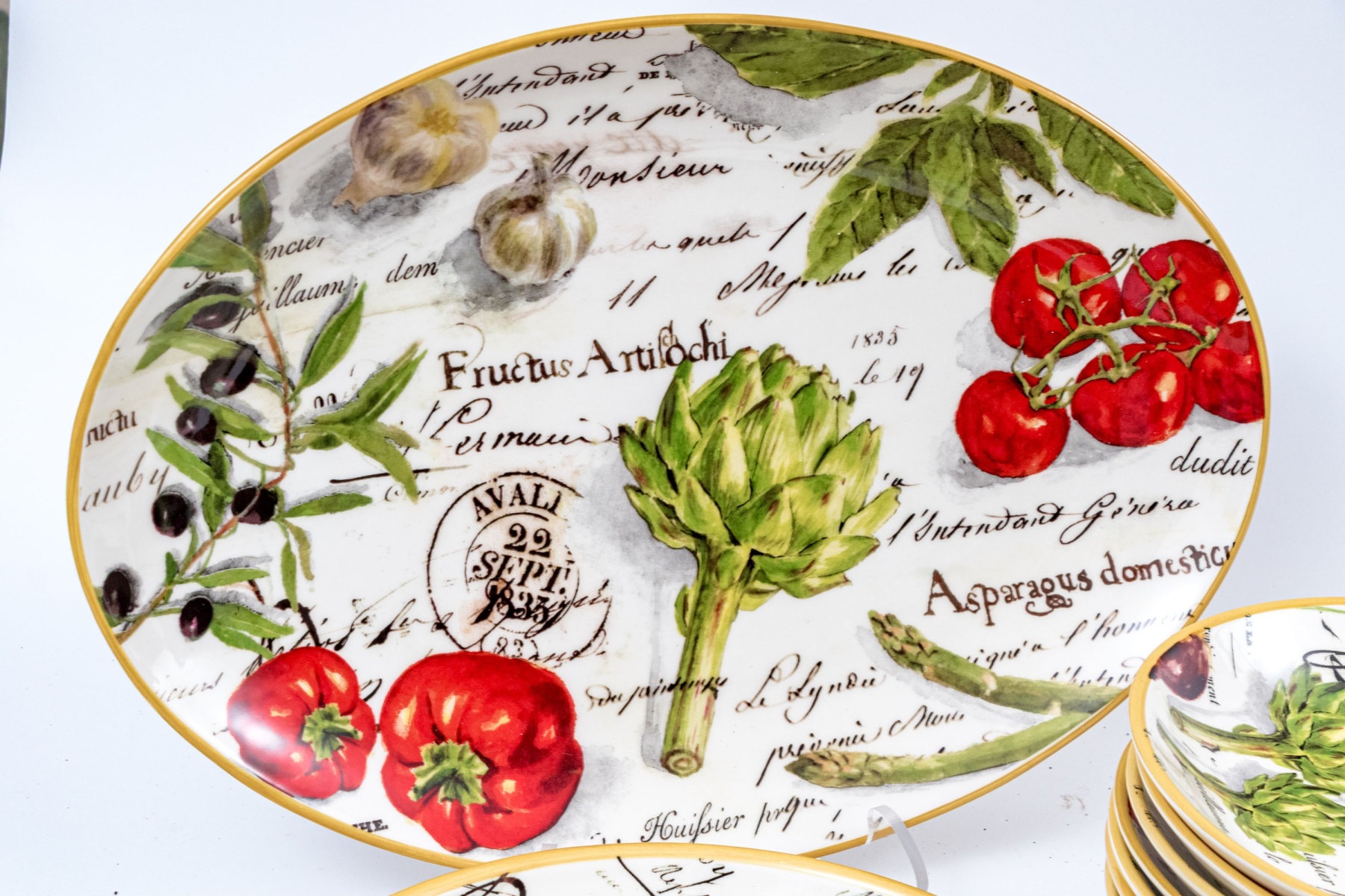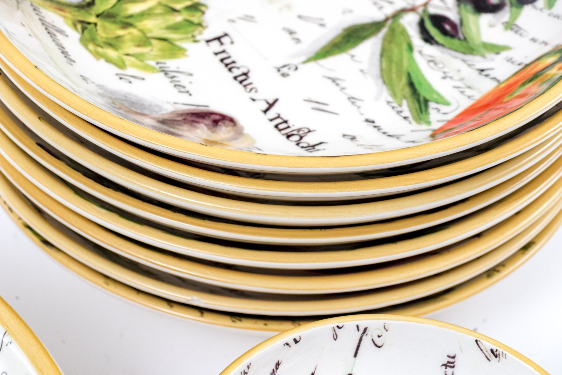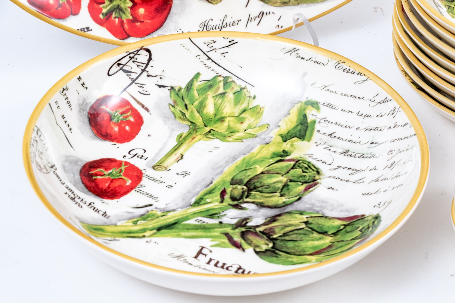 A wonderful collection of Williams Sonoma "Marche" ceramics designed with vibrant vegetable imagery including artichokes, garlic, tomatoes, olives, and asparagus laid against white backgrounds with script and postage stamps for a wonderful vintage wordly touch.