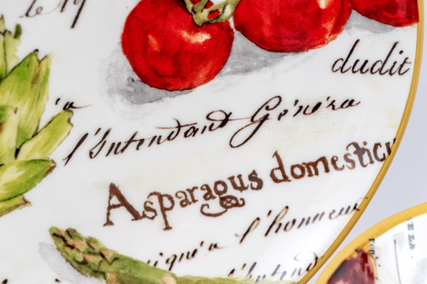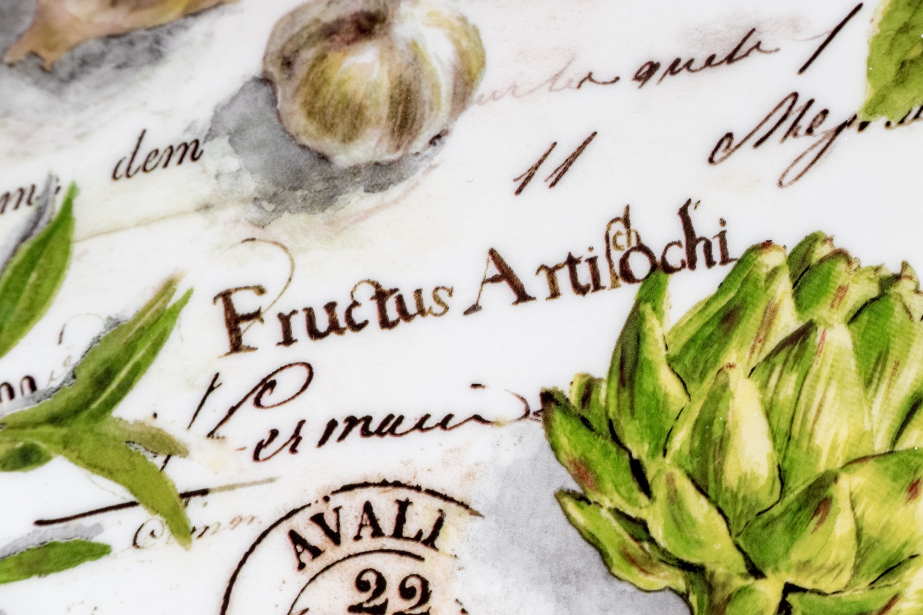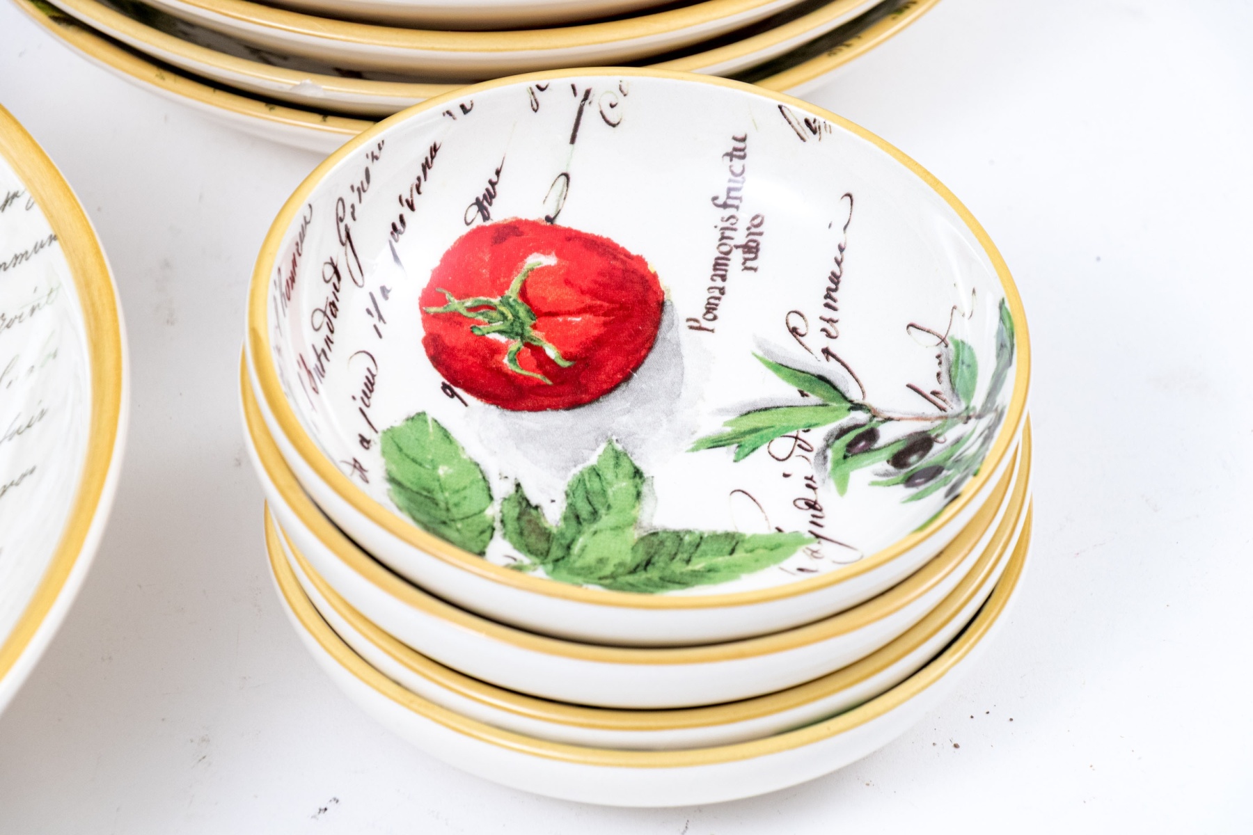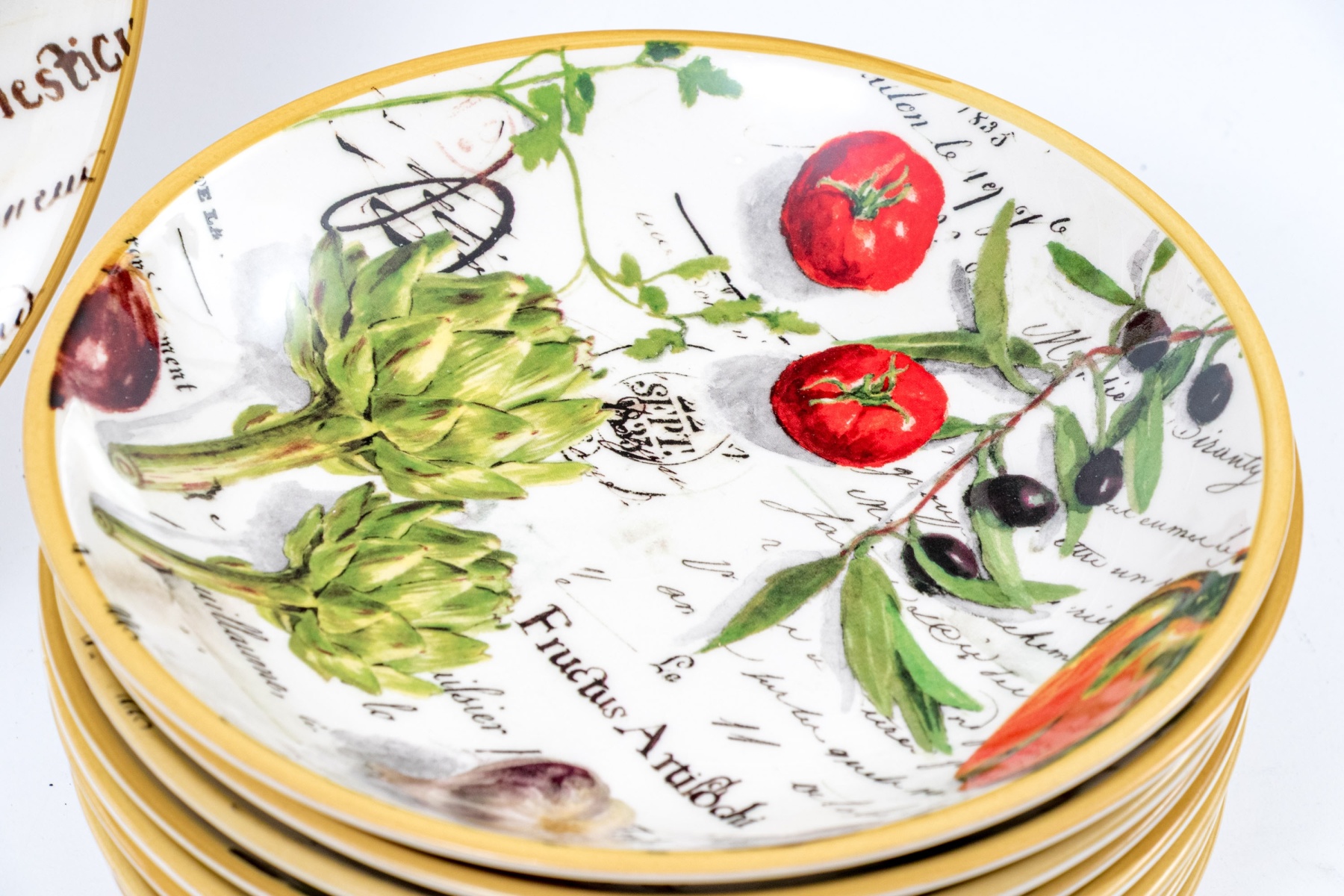 A wonderful collection of Williams Sonoma "Marche" ceramics designed with vibrant vegetable imagery including artichokes, garlic, tomatoes, olives, and asparagus laid against white backgrounds with script and postage stamps for a wonderful vintage wordly touch.