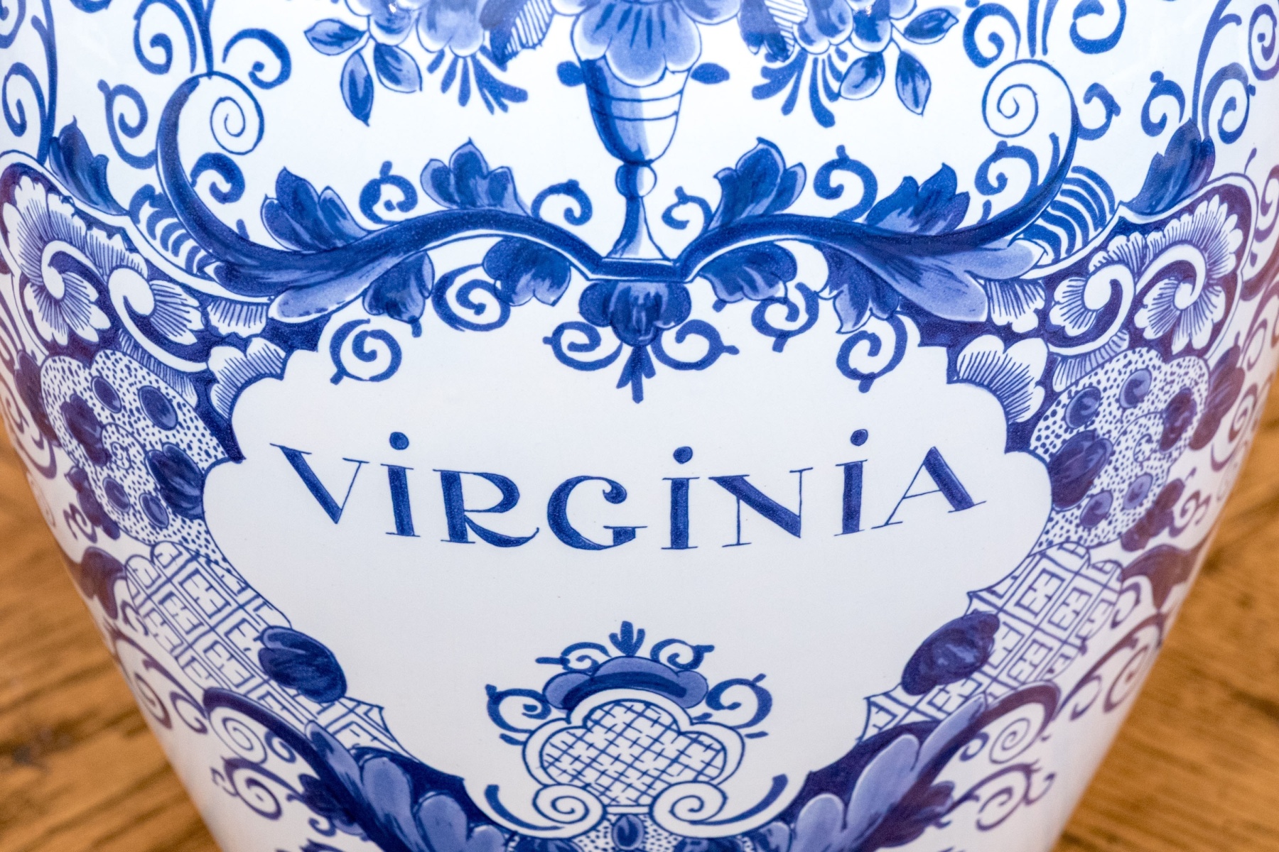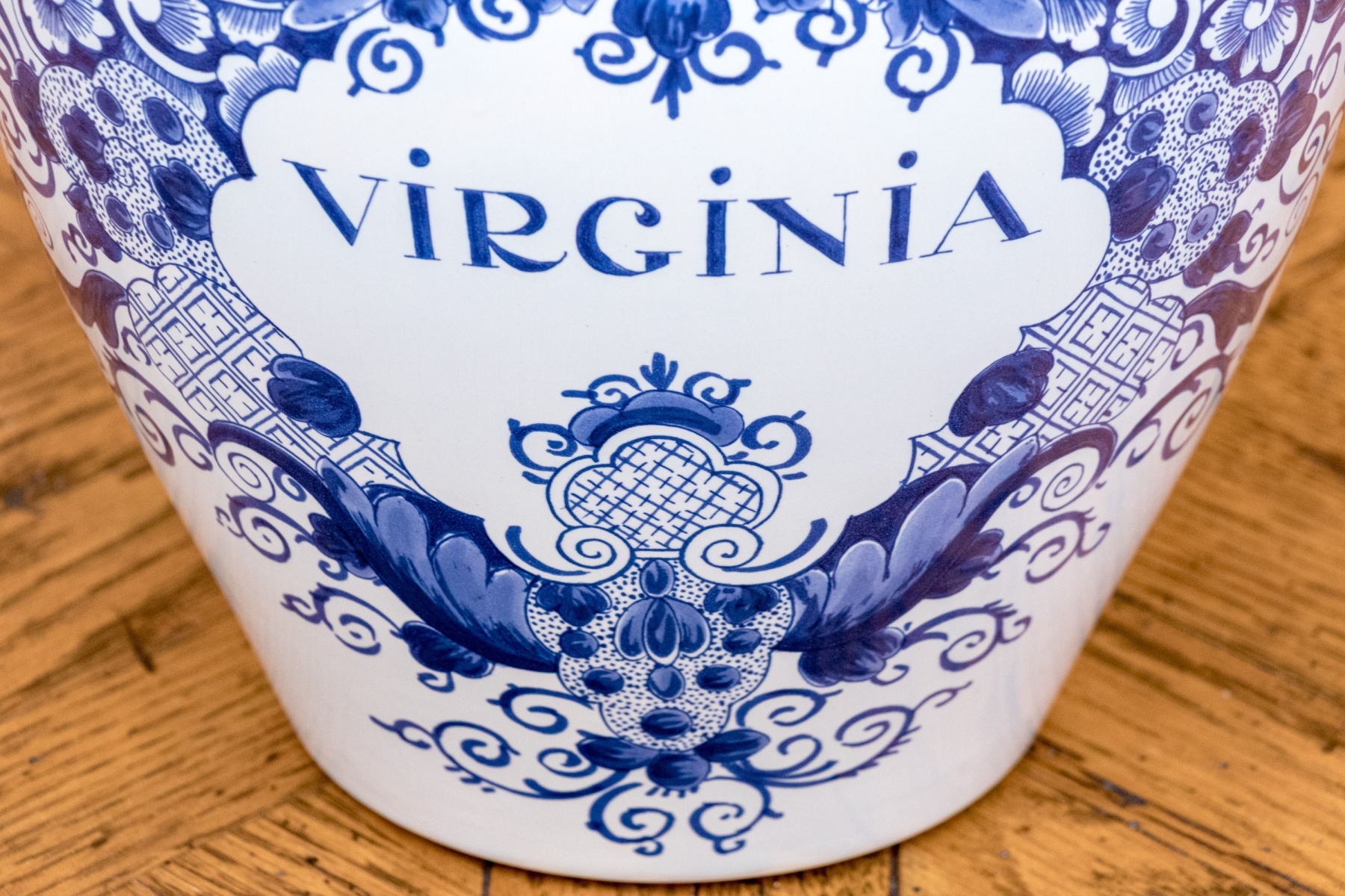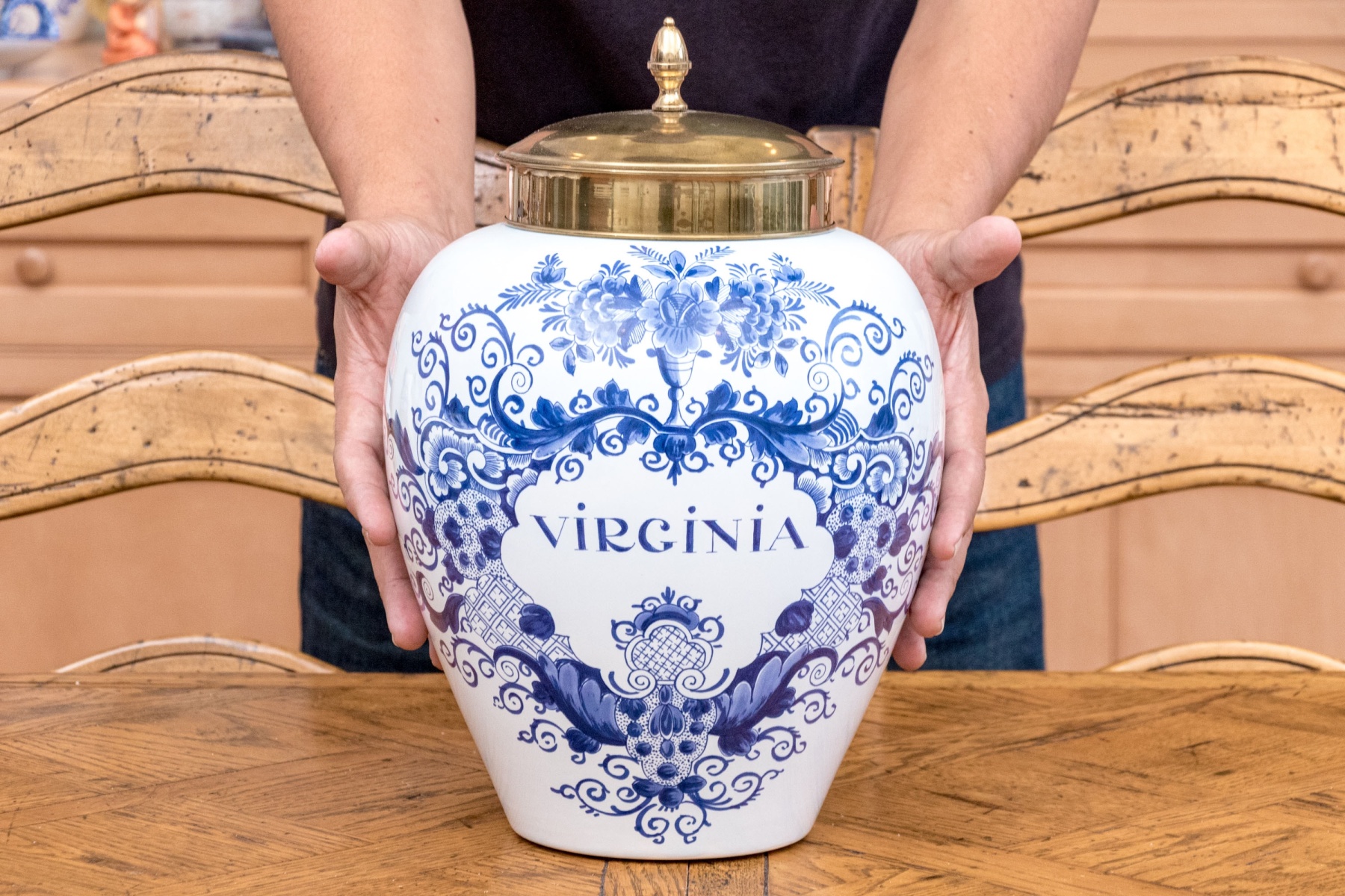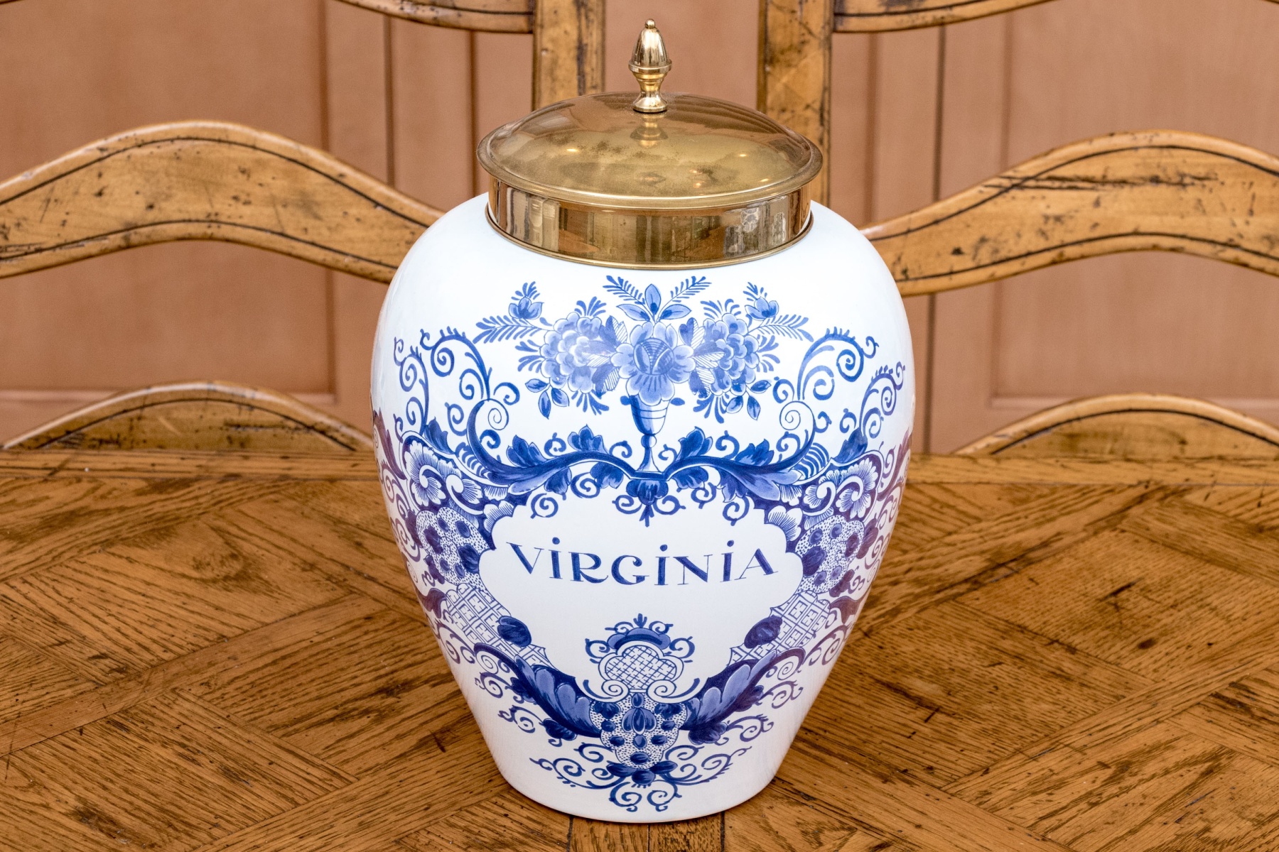 The blue and white ceramic jar marked underfoot. Decorated with lavish scrolling and meandering foliate motifs with central reserve bearing the name "Virginia". With brass finished lid, having spade form finial.
