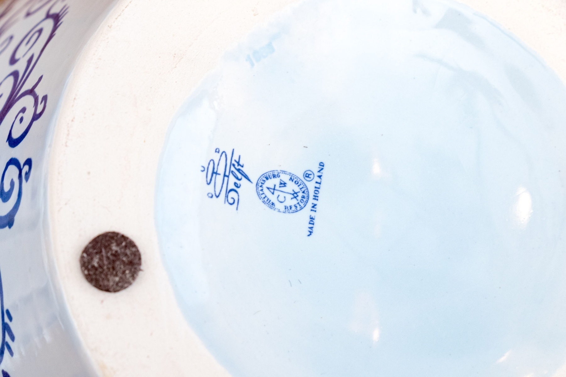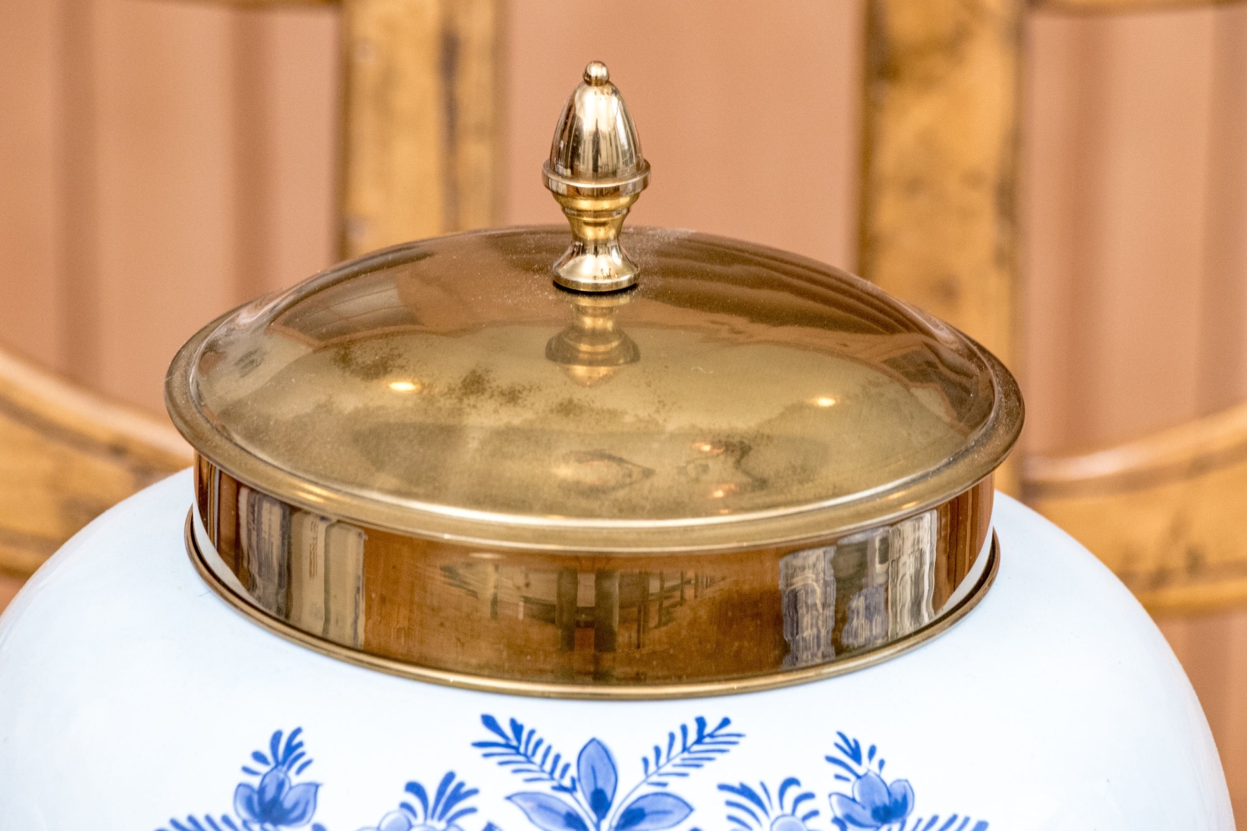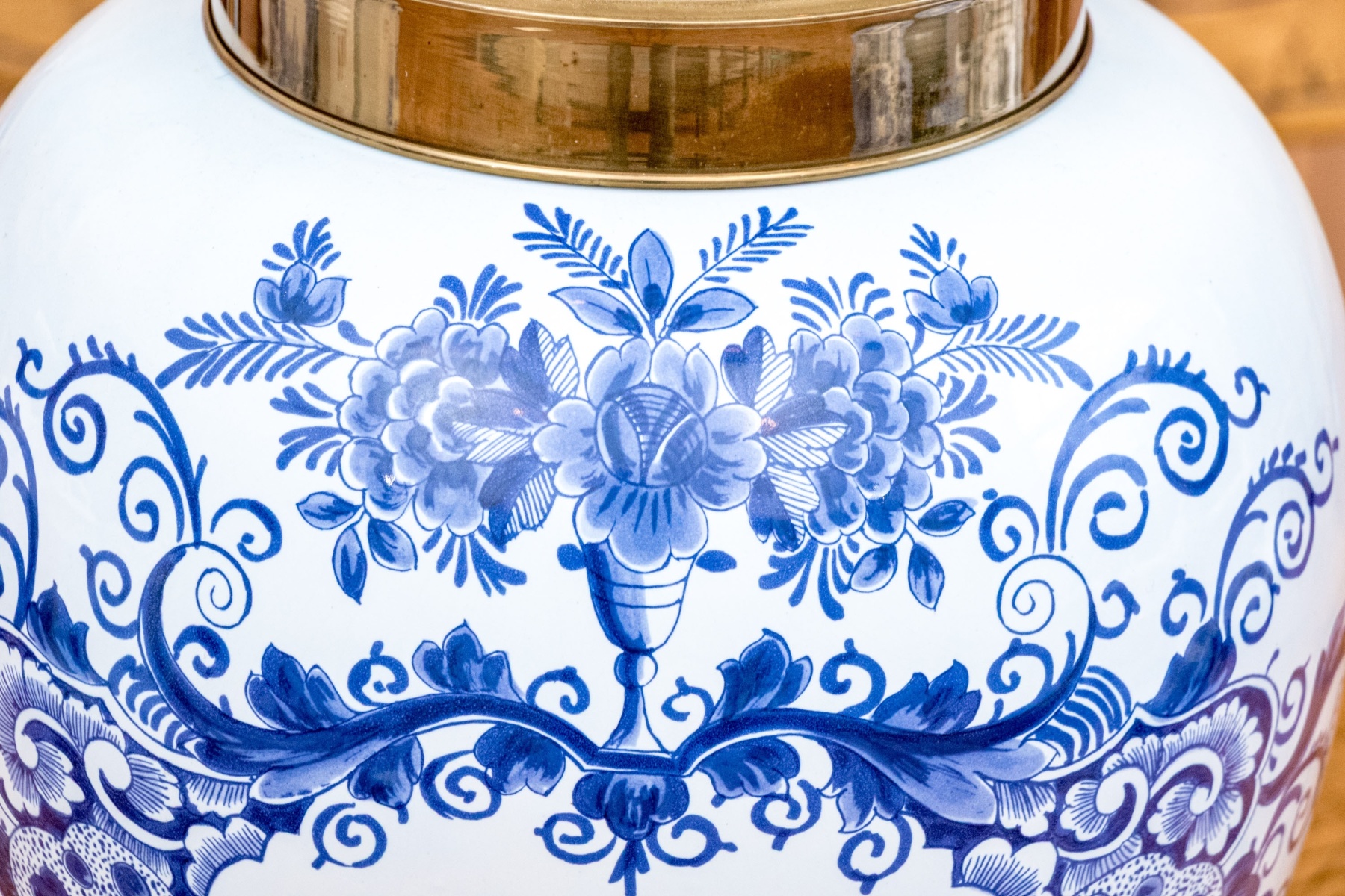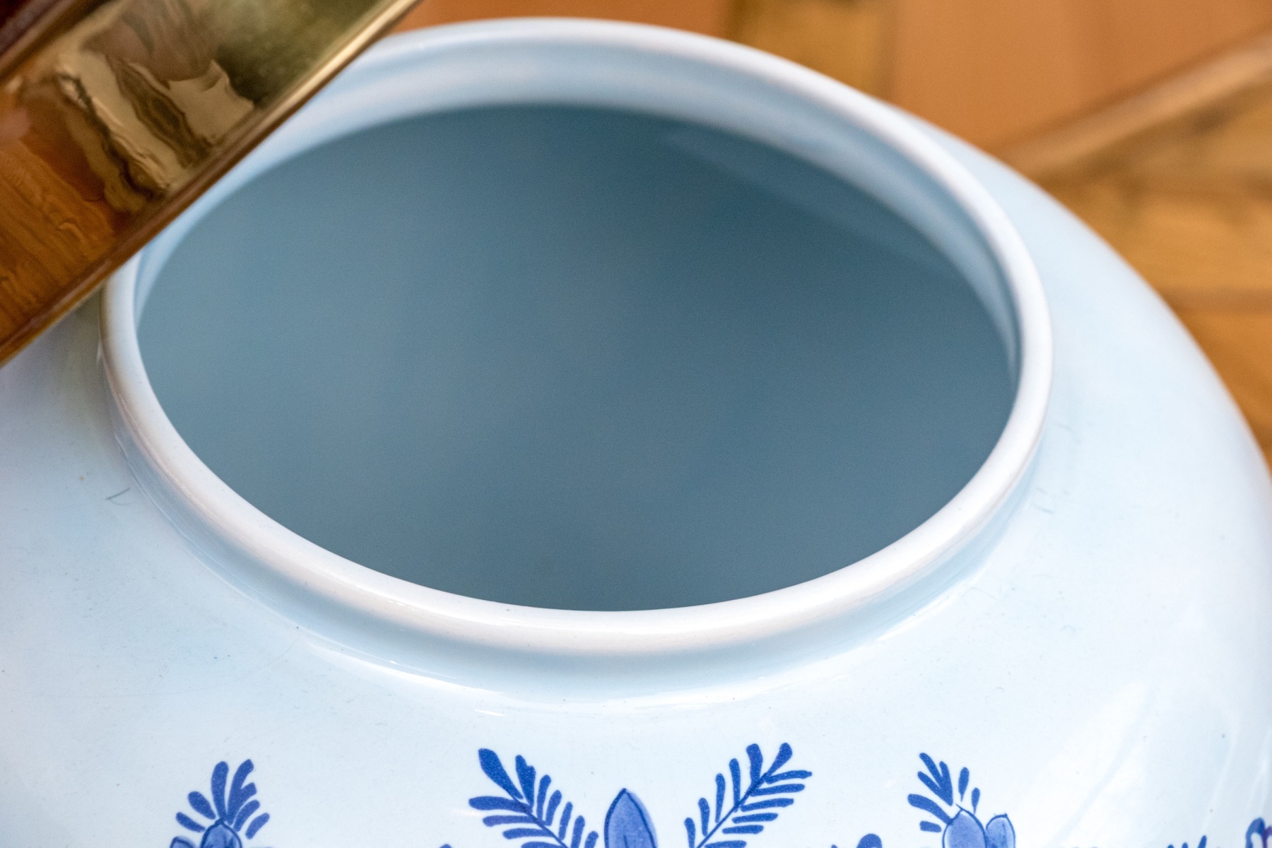 The blue and white ceramic jar marked underfoot. Decorated with lavish scrolling and meandering foliate motifs with central reserve bearing the name "Virginia". With brass finished lid, having spade form finial.
