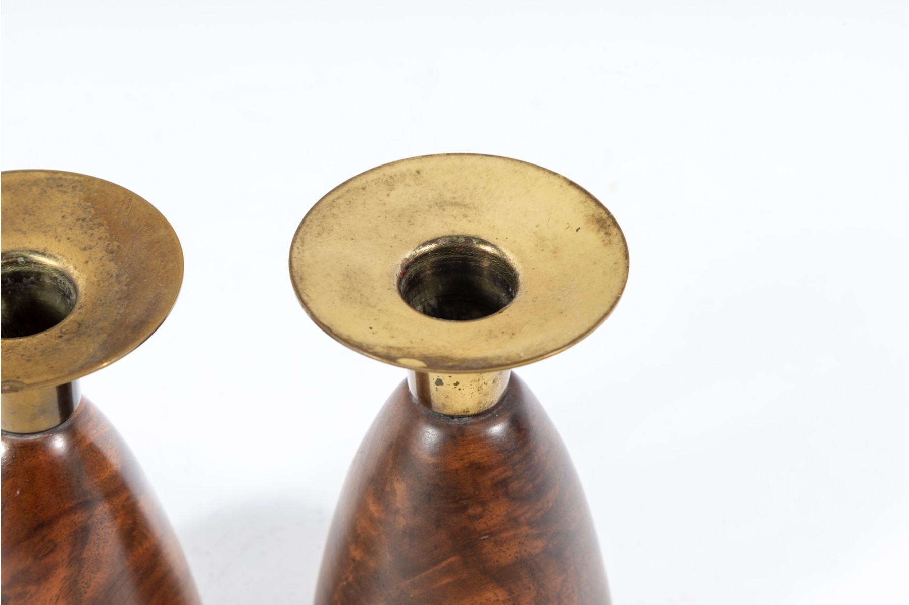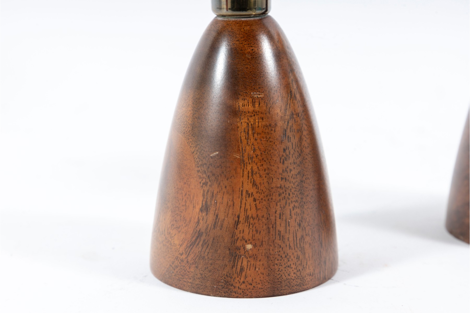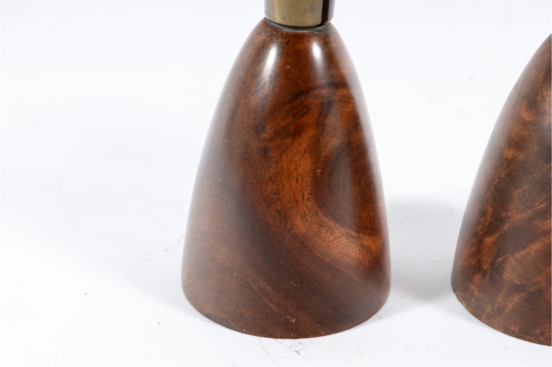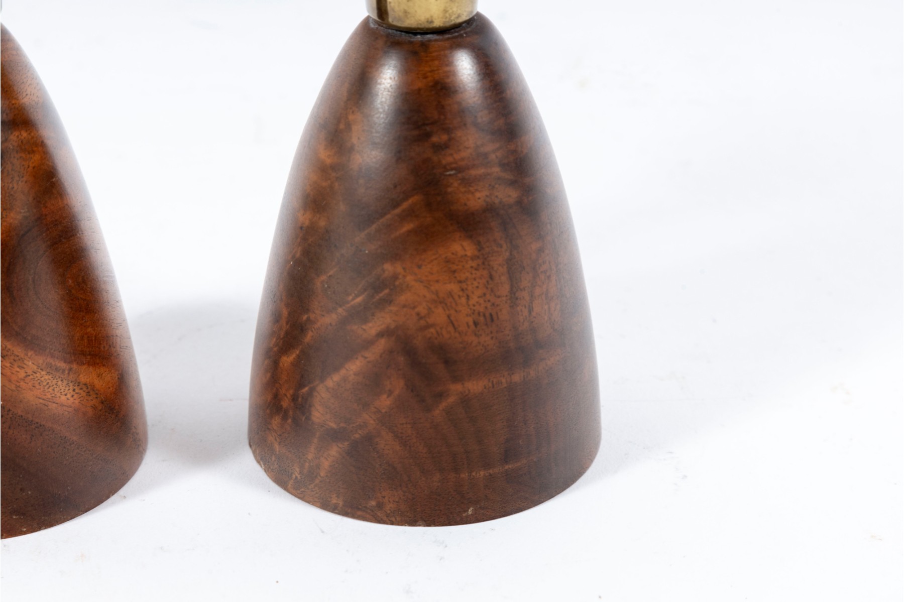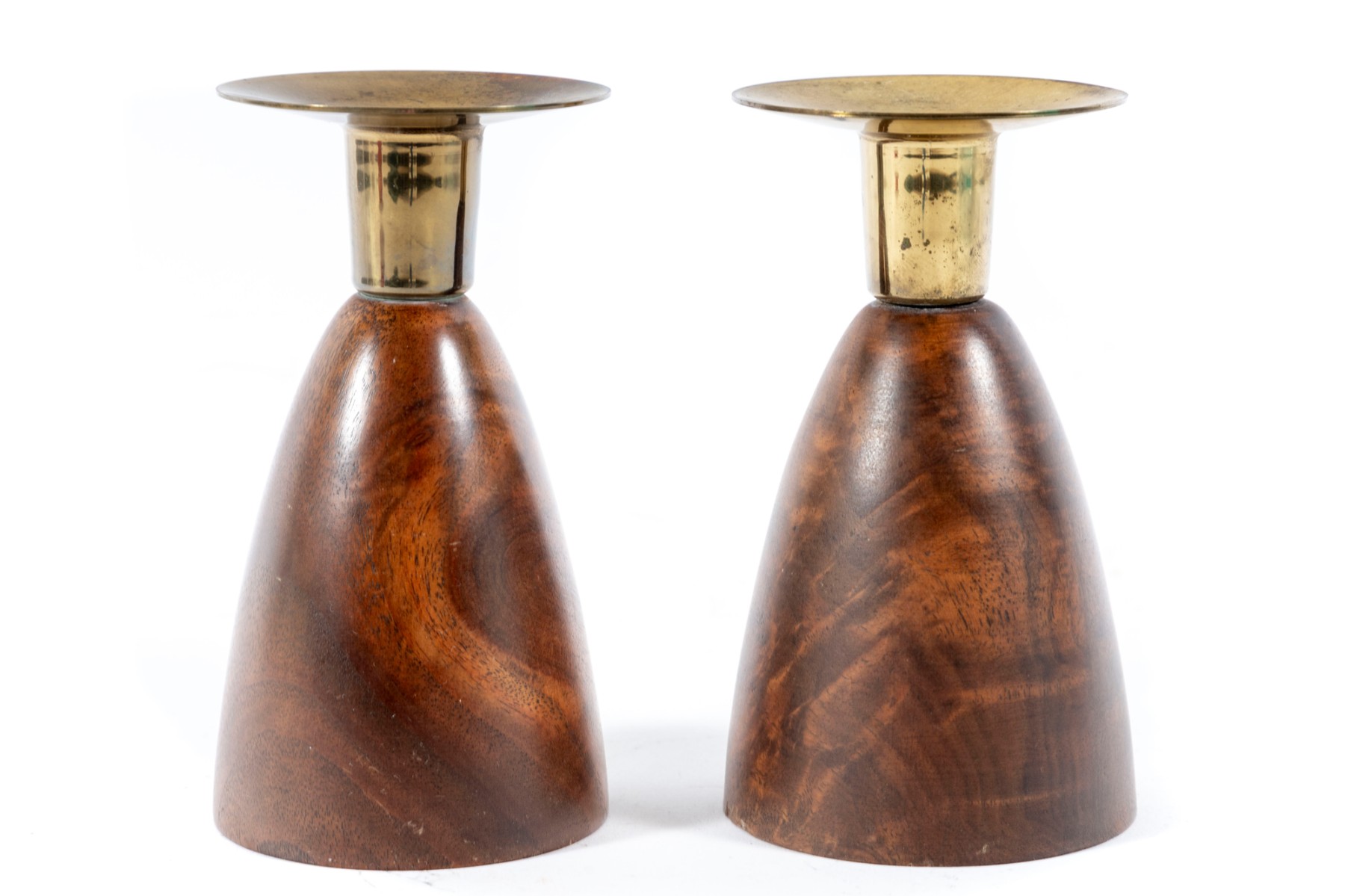 A pair of mid-century lathe-turned Wilson's Carmel candlestick holders with beautiful base forms crafted from mahogany, and topped with brass bobeches.