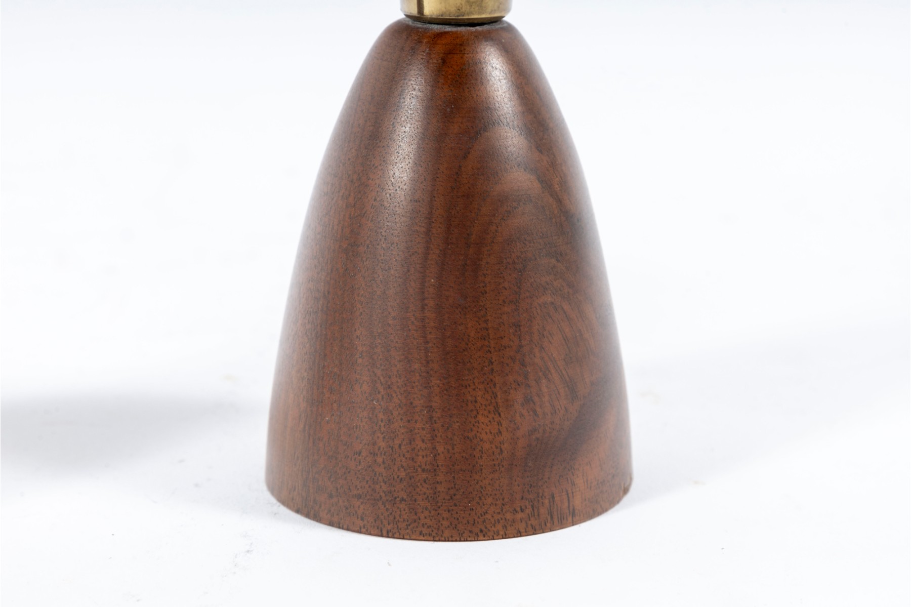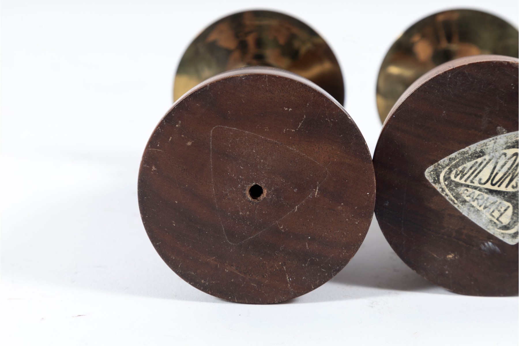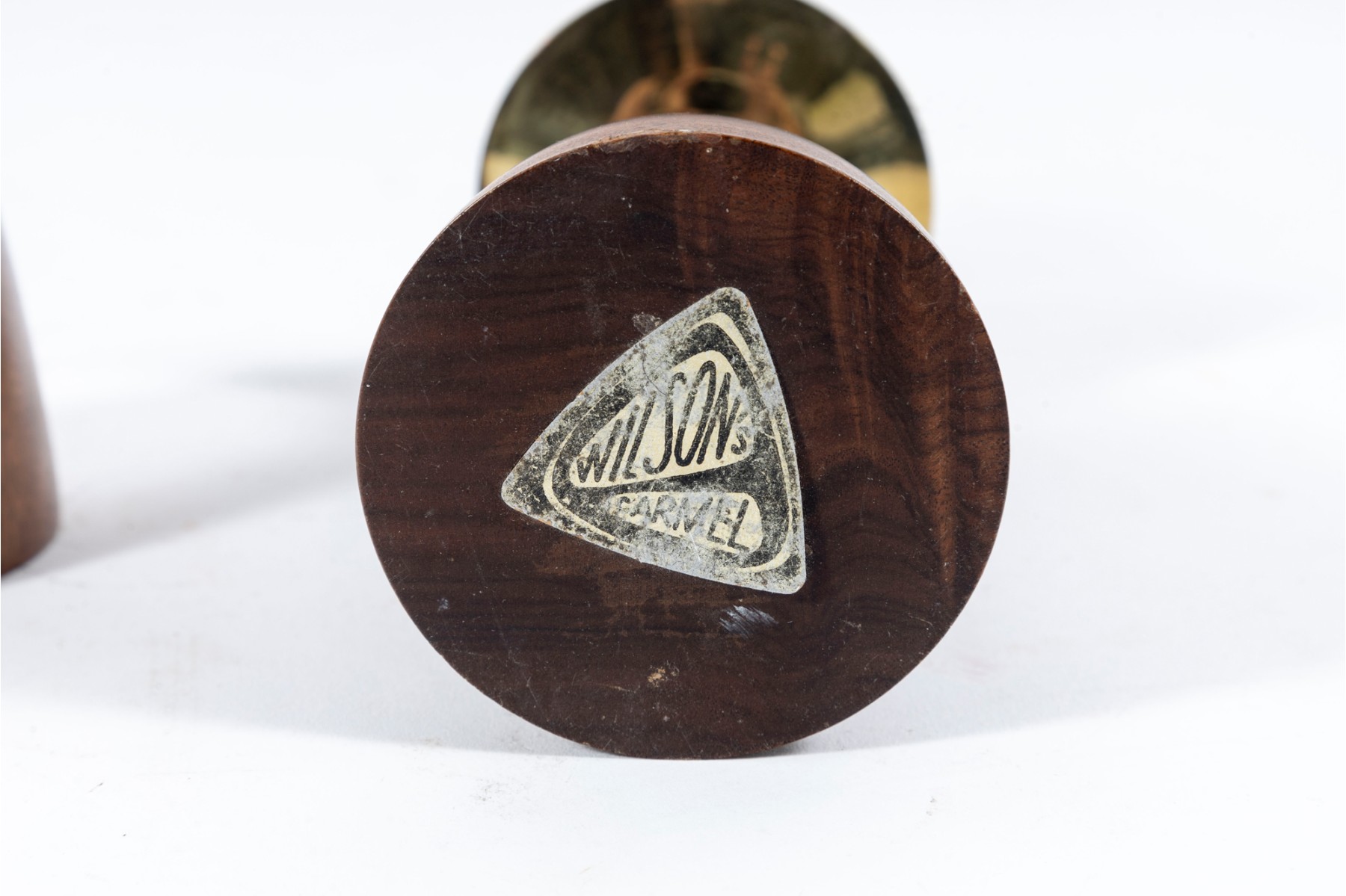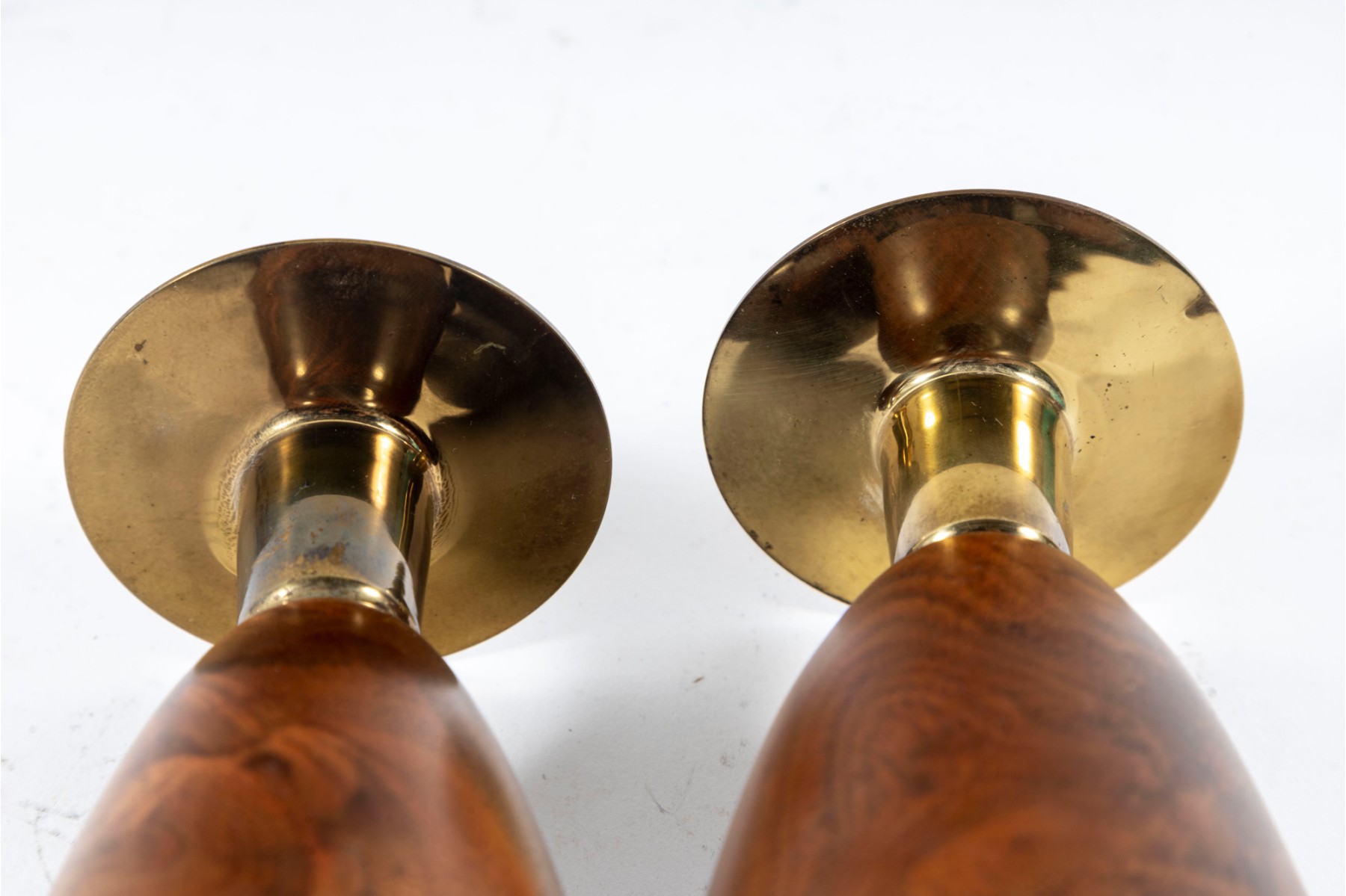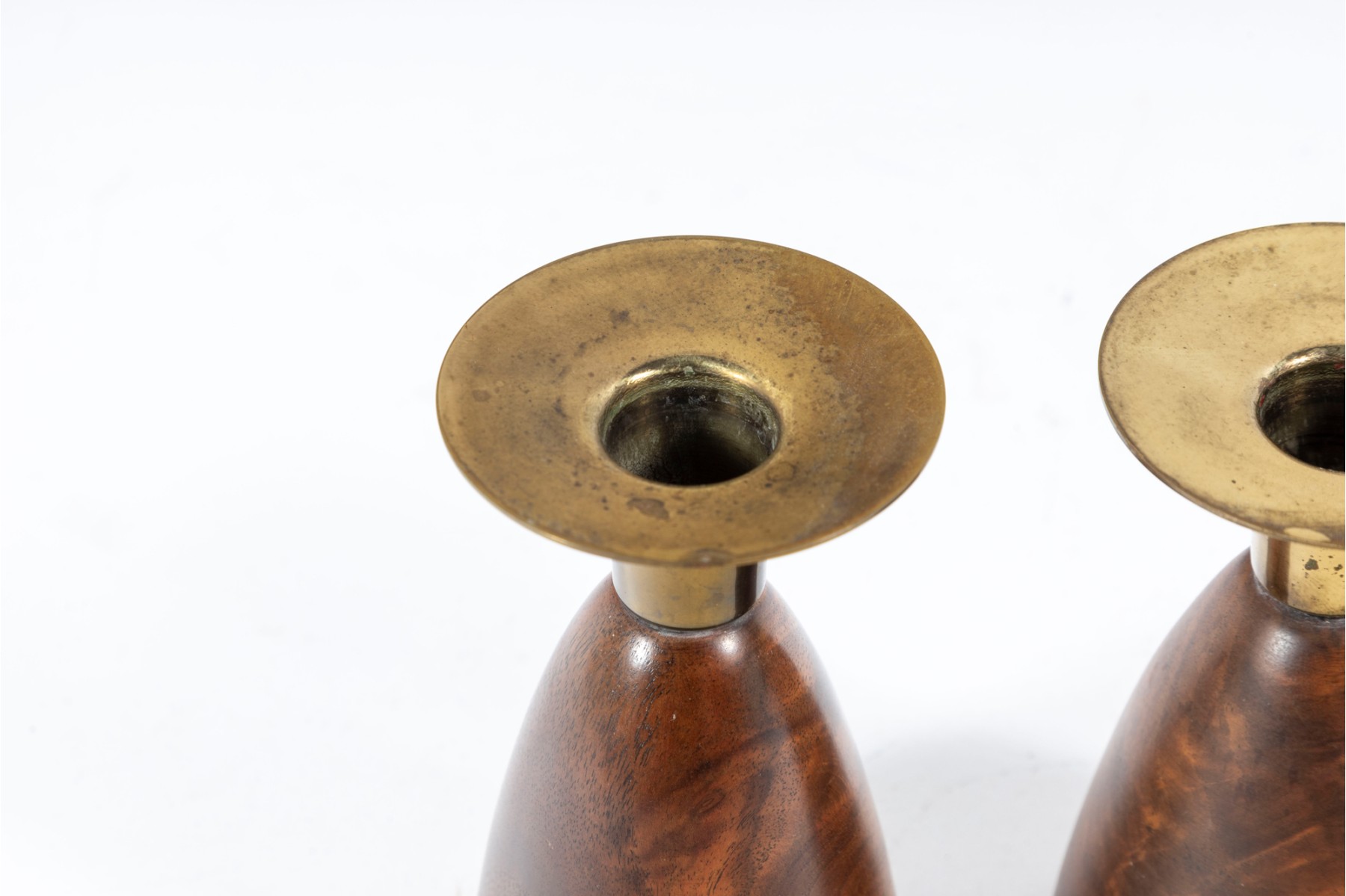A pair of mid-century lathe-turned Wilson's Carmel candlestick holders with beautiful base forms crafted from mahogany, and topped with brass bobeches.