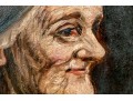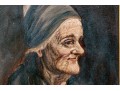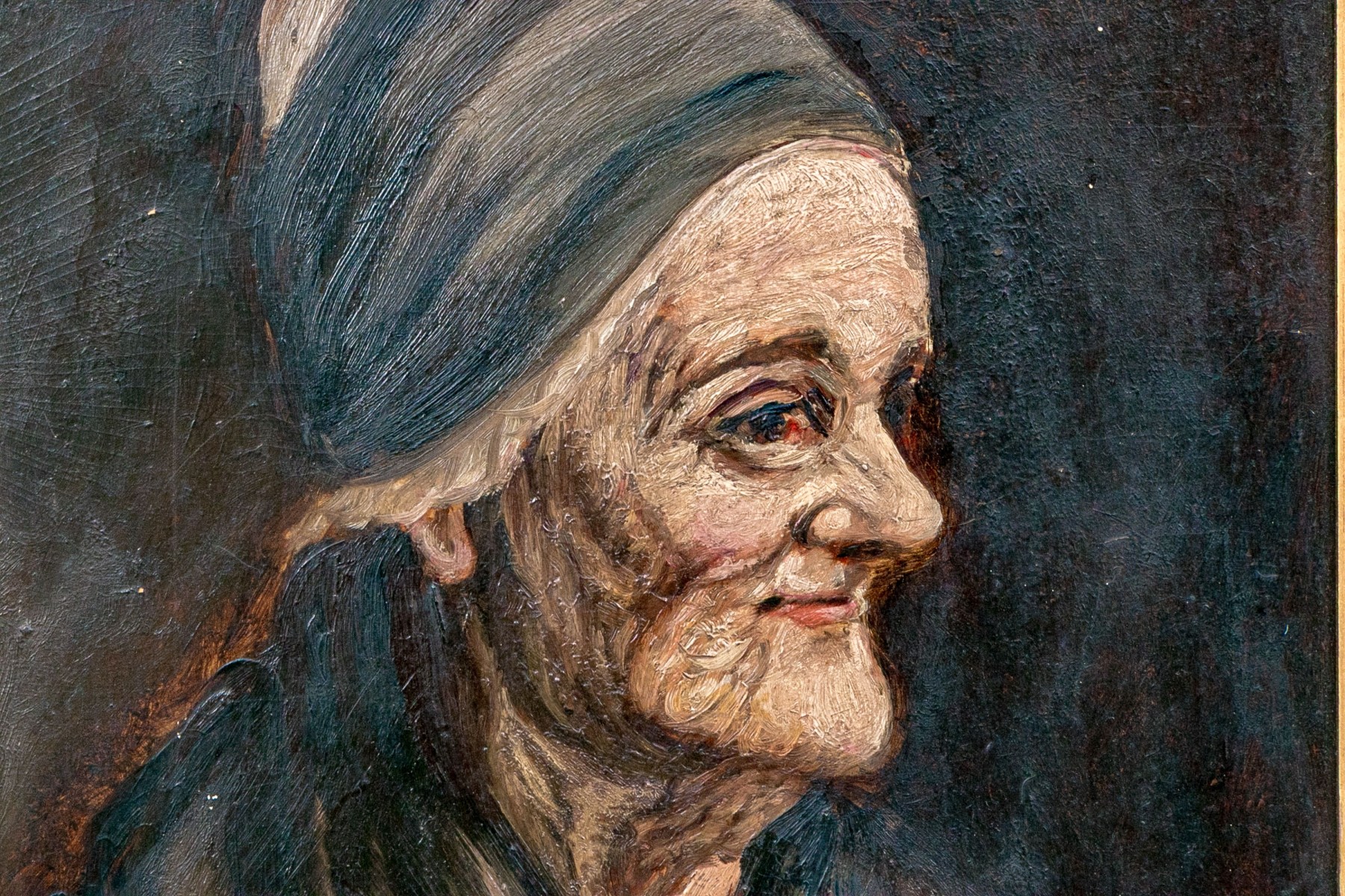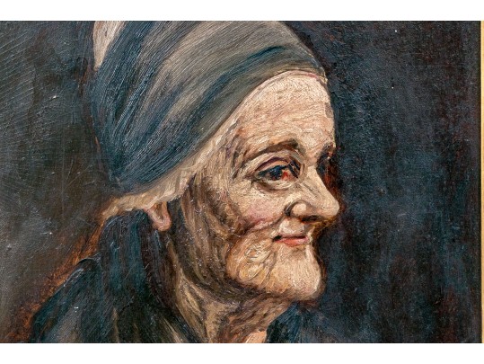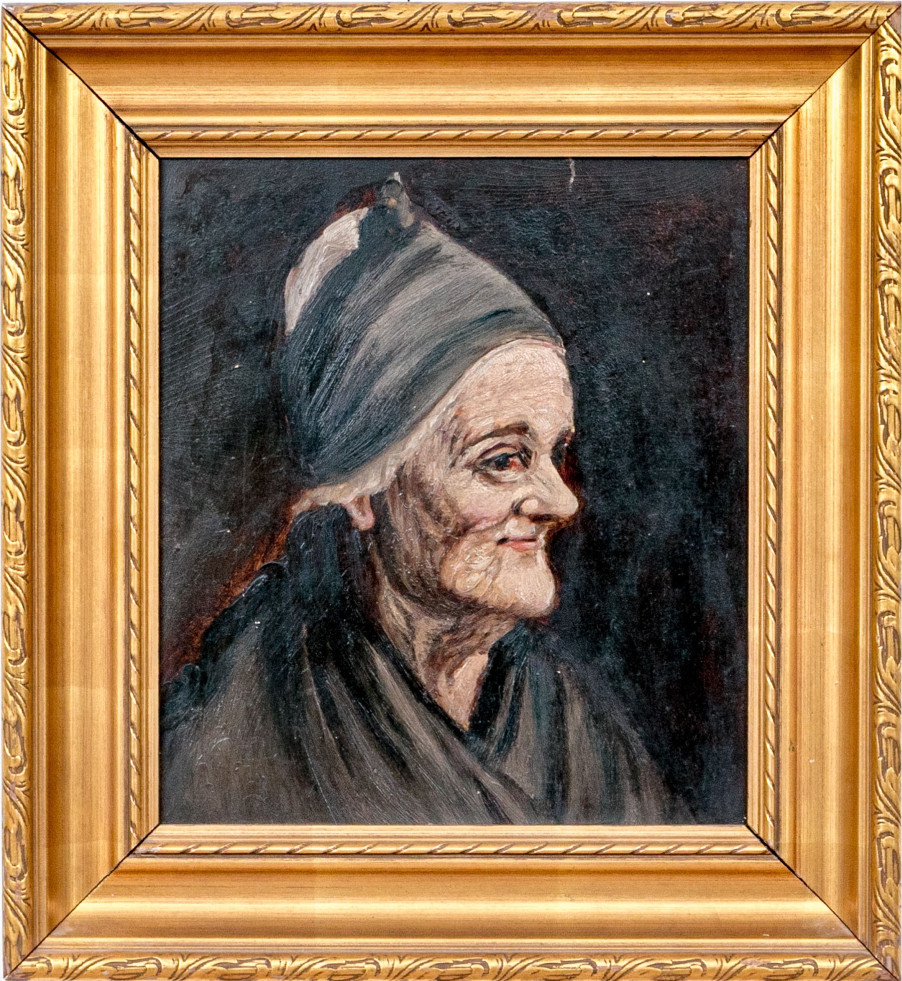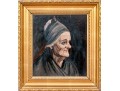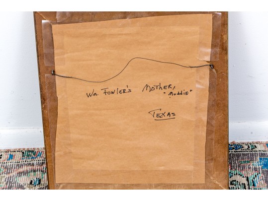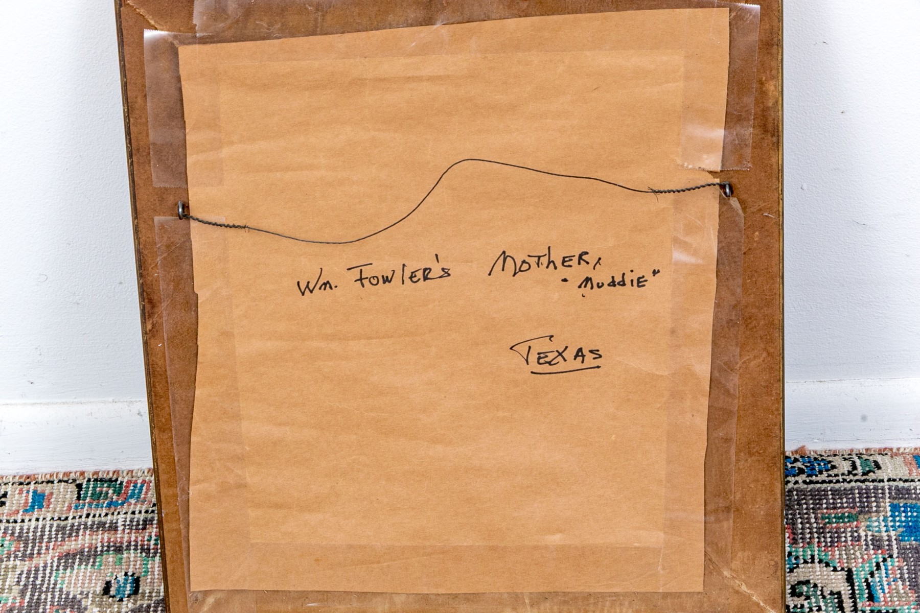 A charming oil painting on artist board depicting a portrait of an elderly woman in three quarter profile facing the right, wearing a dark bandana and wrapped shawl against a dark background. Appears to be unsigned. Handwritten label "Wm. Fowler's Mother 'Muddie'; Texas" on the verso.