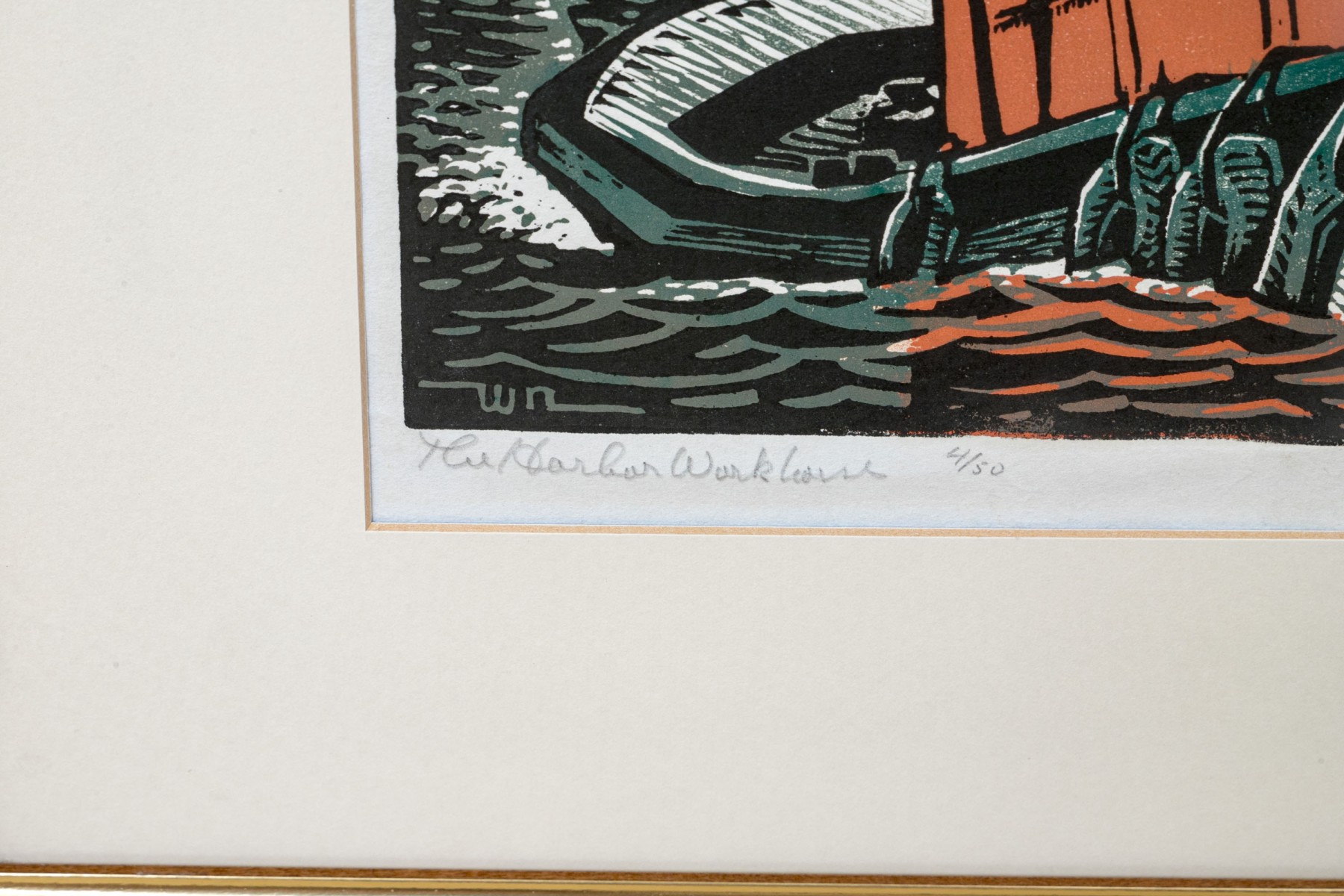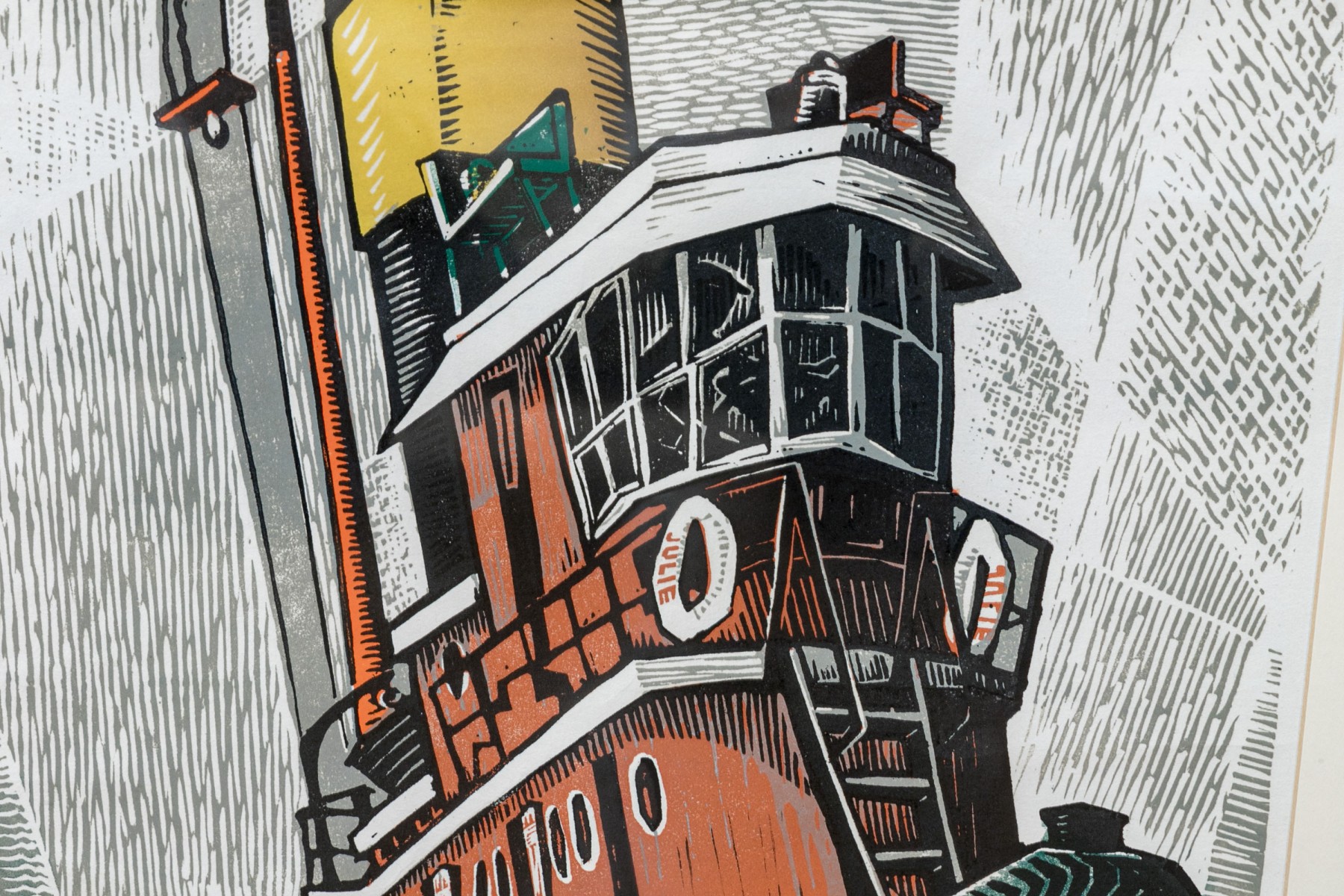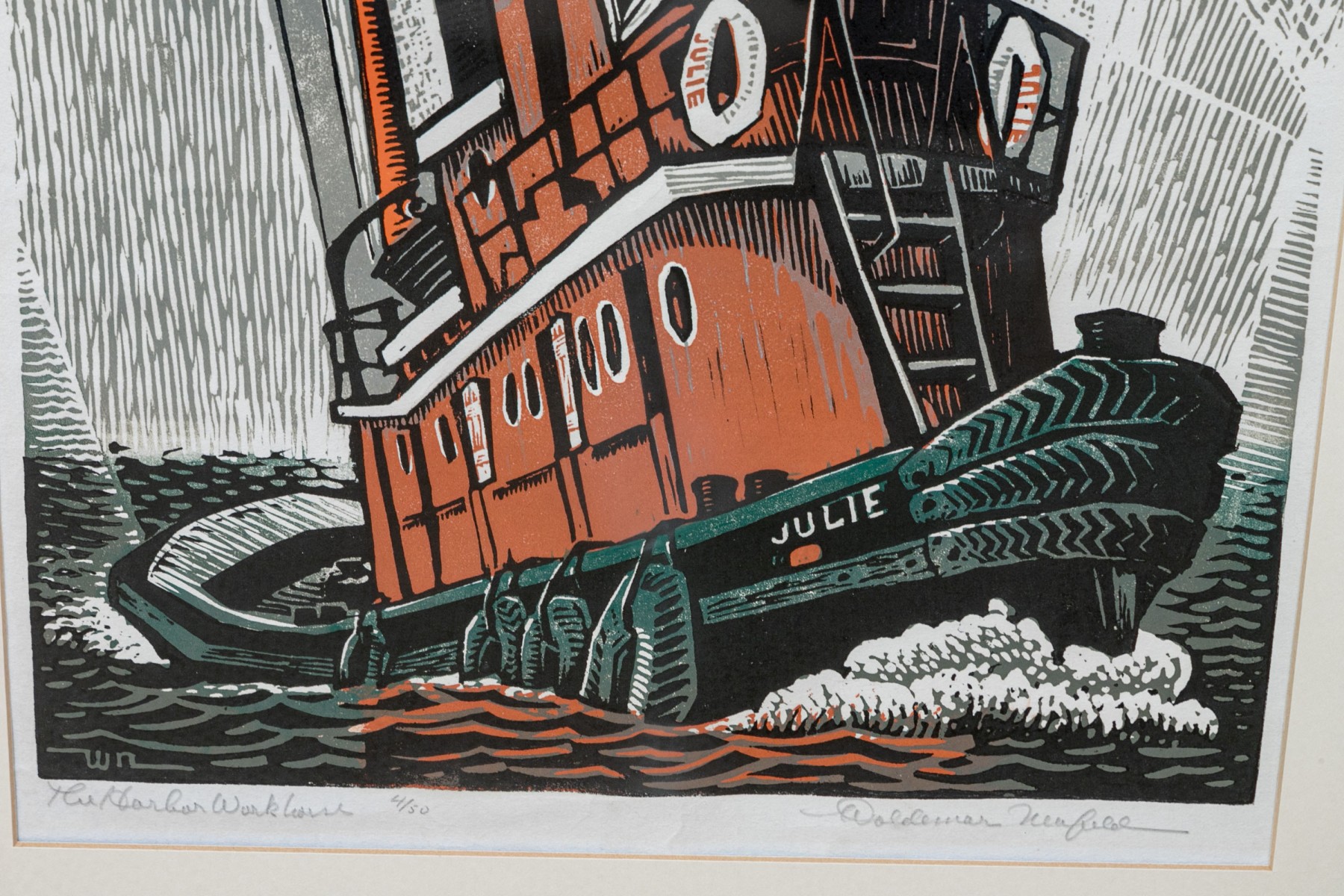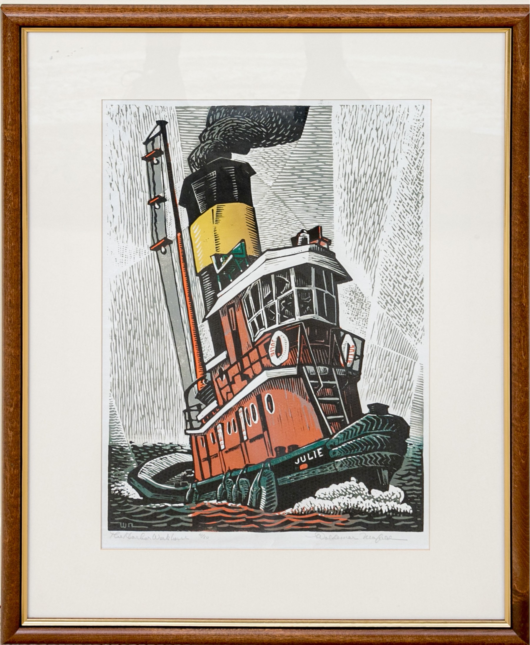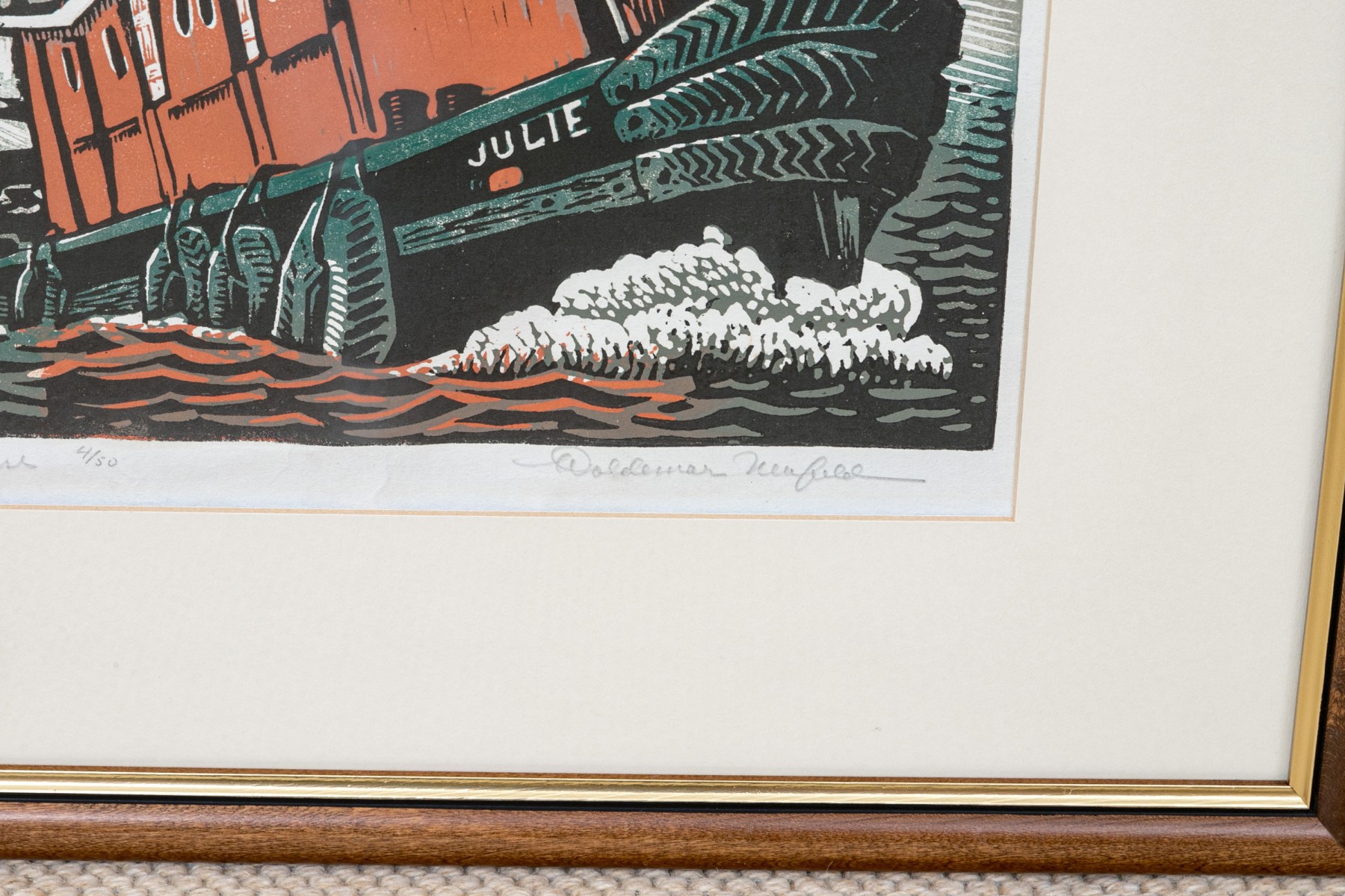 Woldemar Neufled (Russian-Canadian, 1909-2002) "The Harbor Workhorse" woodcut depicting a vibrant red, orange, and green ship named "Julie" against a beautifully hashed gray background. Plate signed, pencil titled and numbered 4/50 lower left, pencil signed lower right.